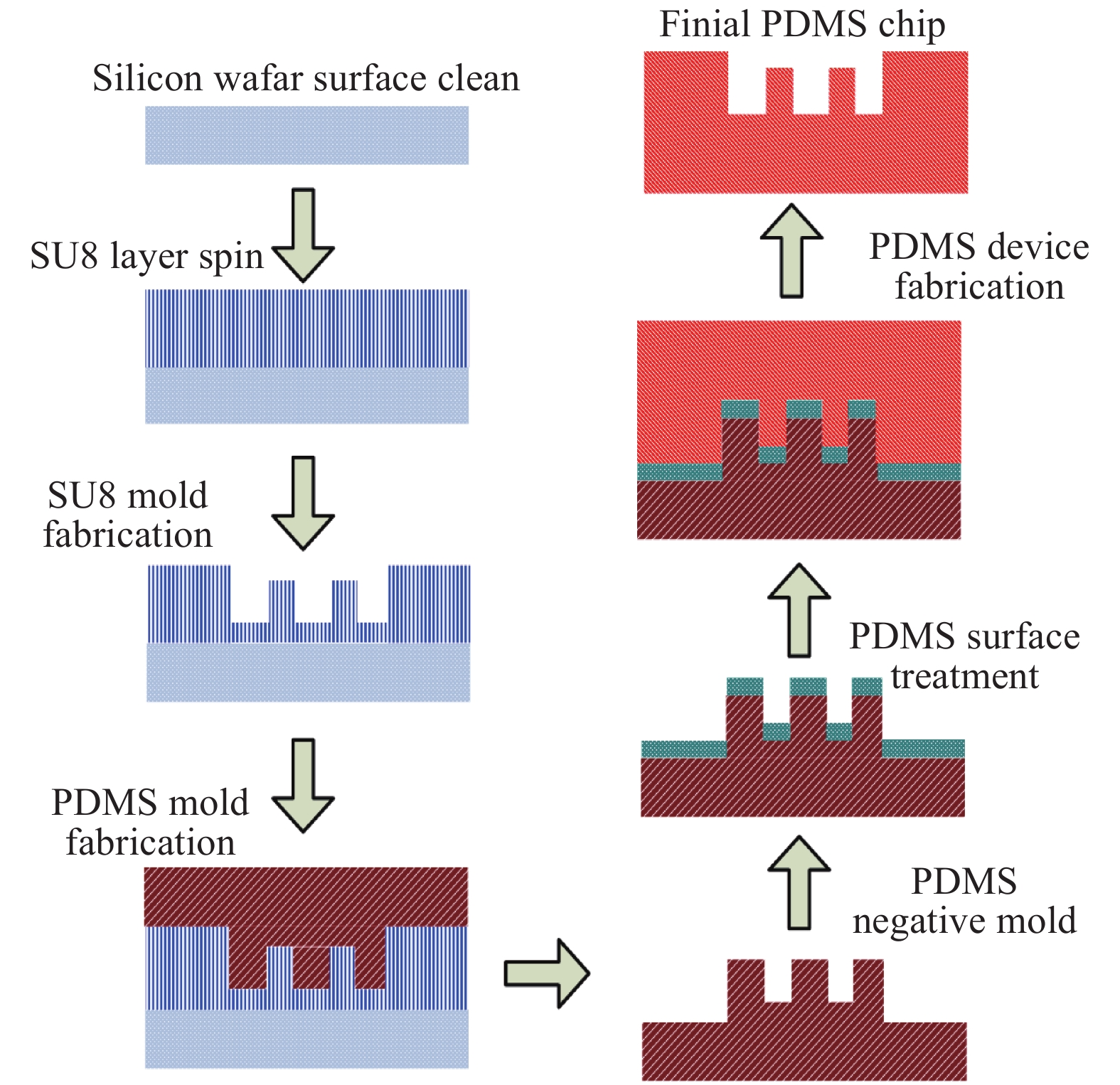 High aspect ratio units are necessary parts of complex microstructures in microfluidic devices. Some methods that are available to achieve a high aspect ratio require expensive materials or complex chemical processes; for other methods it is difficult to reach simple high aspect ratio structures, which need supporting structures. The paper presents a simple and cheap two-step Polydimethylsioxane (PDMS) transferring process to get high aspect ratio single pillars, which only requires covering the PDMS mold with a Brij@52 surface solution after getting a relative PDMS mold based on an SU8 mold. The experimental results demonstrate the method efficiency and effectiveness.