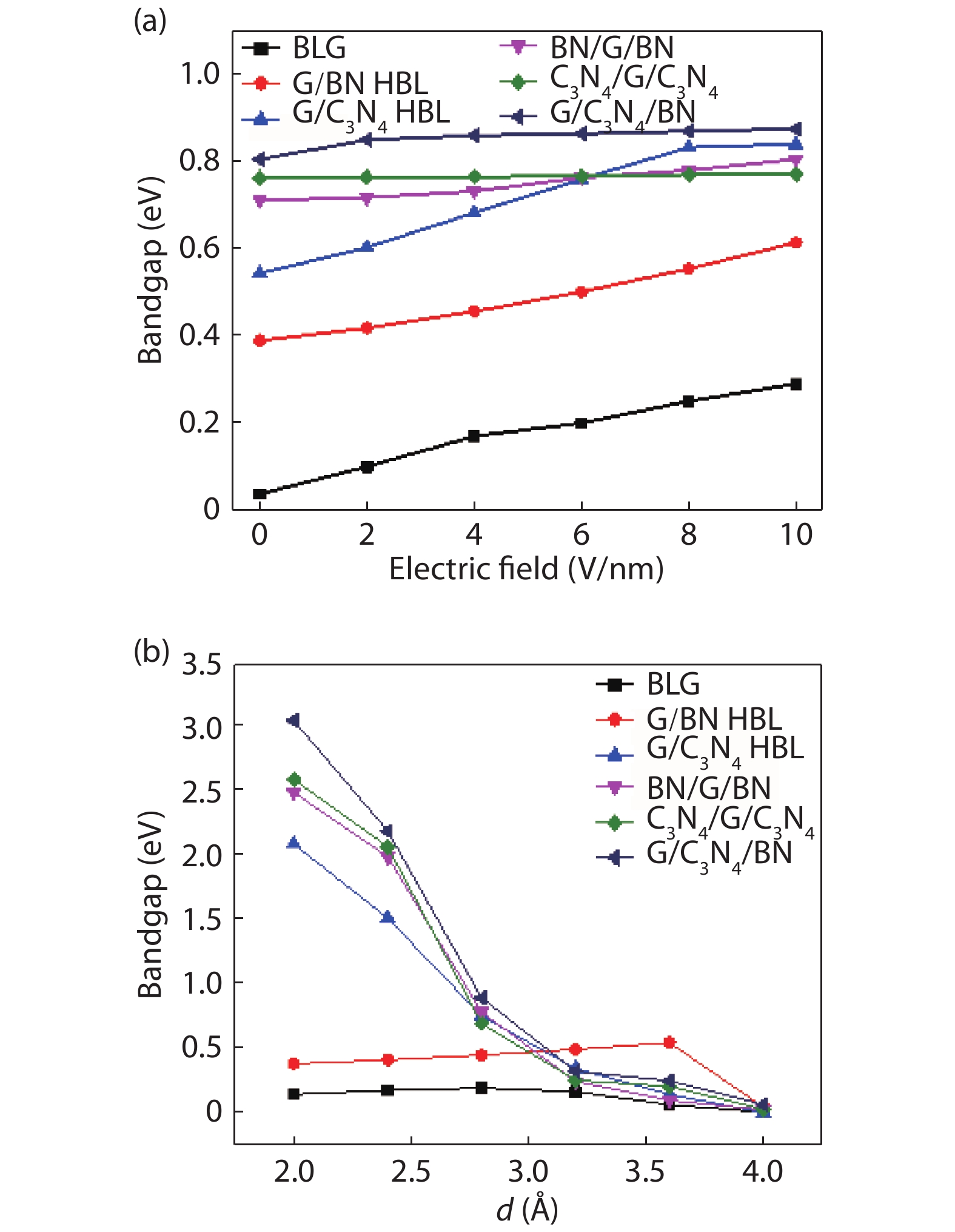 The effect of an external electric field on the bandgap is observed for two proposed heterostructures graphitic carbon nitride-graphene-hexagonal boron nitride (g-C3N4/G/h-BN) in hexagonal stack (AAA) and graphene-graphitic carbon nitride-hexagonal boron nitride (G/g-C3N4/h-BN) in Bernal stack (ABA). Their inter-layer distance, binding energy and effective mass has also been calculated. The structure optimization has been done by density functional theory (DFT) with van der Waals corrections. The inter-layer distance, bandgap, binding energy and effective mass has been listed for these heterostructures and compared with that of bilayer graphene (BLG), graphene-hexagonal boron nitride (G/h-BN) hetero-bilayer, graphene-graphitic carbon nitride (G/g-C3N4) hetero-bilayer and graphitic carbon nitride-graphene- graphitic carbon nitride (g-C3N4/G/g-C3N4) heterostructure in Bernal and hexagonal stack. g-C3N4/G/h-BN is found to offer lower effective mass and larger bandgap opening among the considered heterostructures.