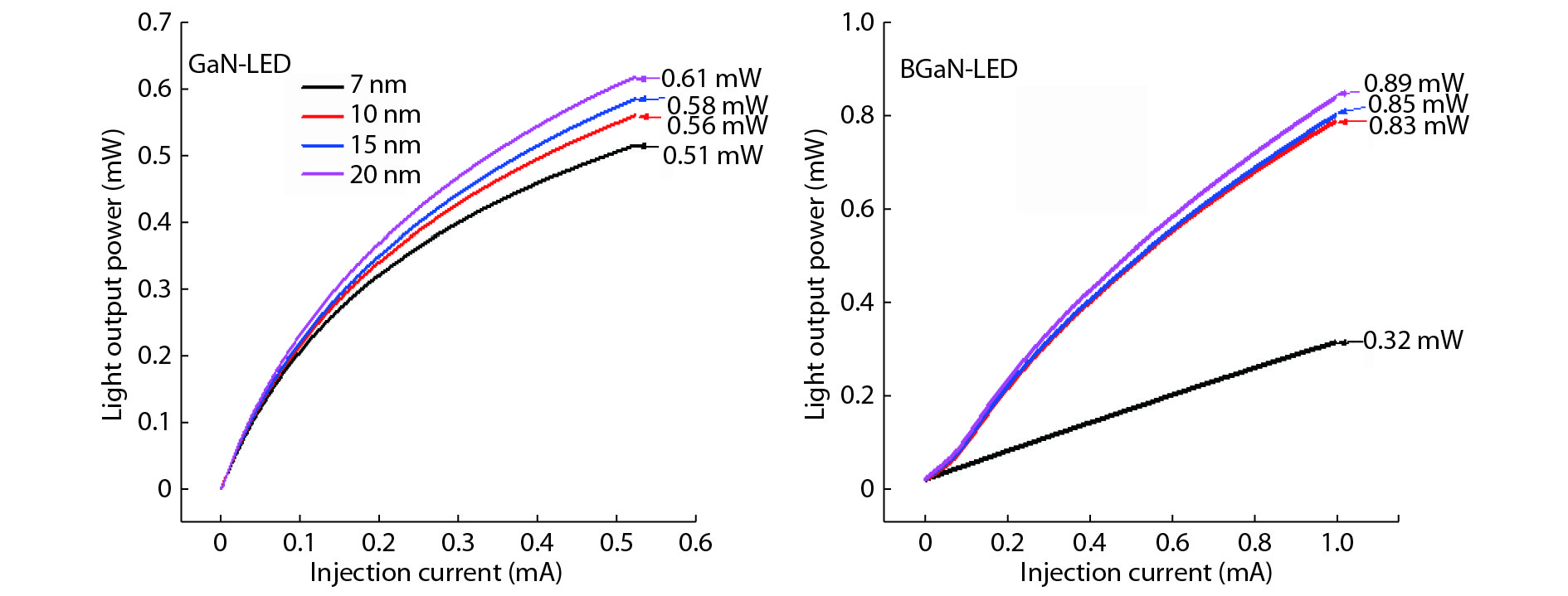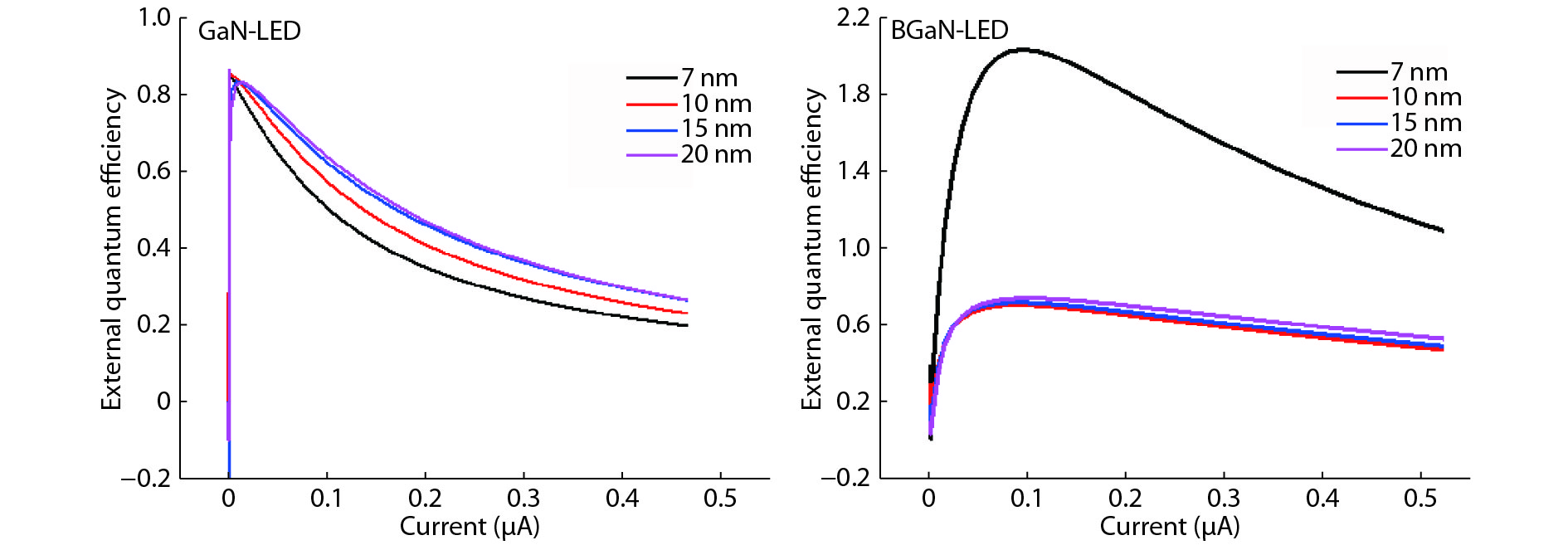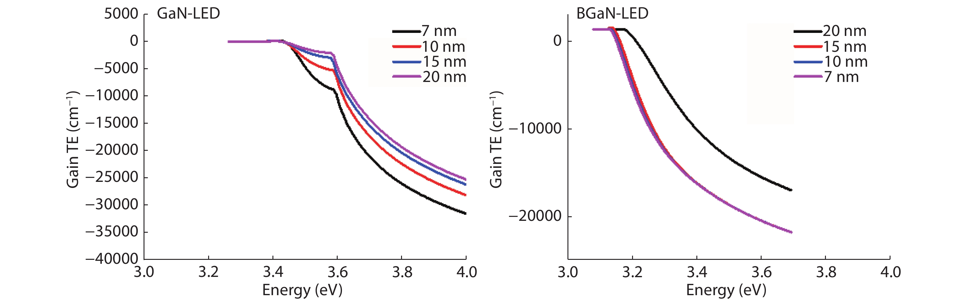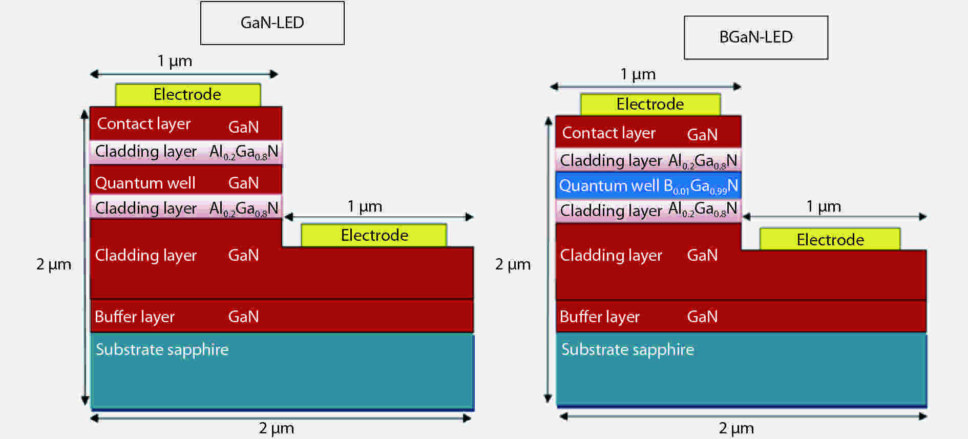 The objective of this work is to simulate a single quantum well ultraviolet light emitting diode (LED) based on AlGaN/GaN/AlGaN and AlGaN/BGaN/AlGaN, by using TCAD Silvaco simulator. The first structure has a GaN quantum well taken between two layers, of n-AlGaN and p-AlGaN. The second one has a BGaN quantum well instead of GaN. We fix the concentration of the boron in BGaN to only 1% and we vary the thickness of GaN and BGaN quantum well layer from 7 to 20 nm, for the two structures. As results, we obtain respectively for GaN-LED and BGaN-LED, a maximum current of 0.52 and 0.27 mA, a maximum power spectral density of 1.935 and 6.7 W cm?1 eV?1, a maximum spontaneous emission of 3.34 × 1028 and 3.43 × 1028 s?1 cm?3 eV?1, and a maximum Light output power of 0.56 and 0.89 mW.