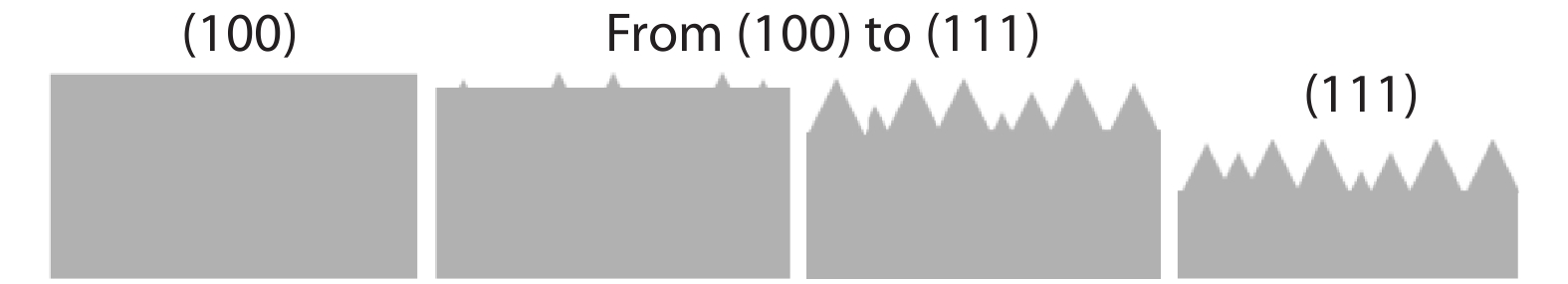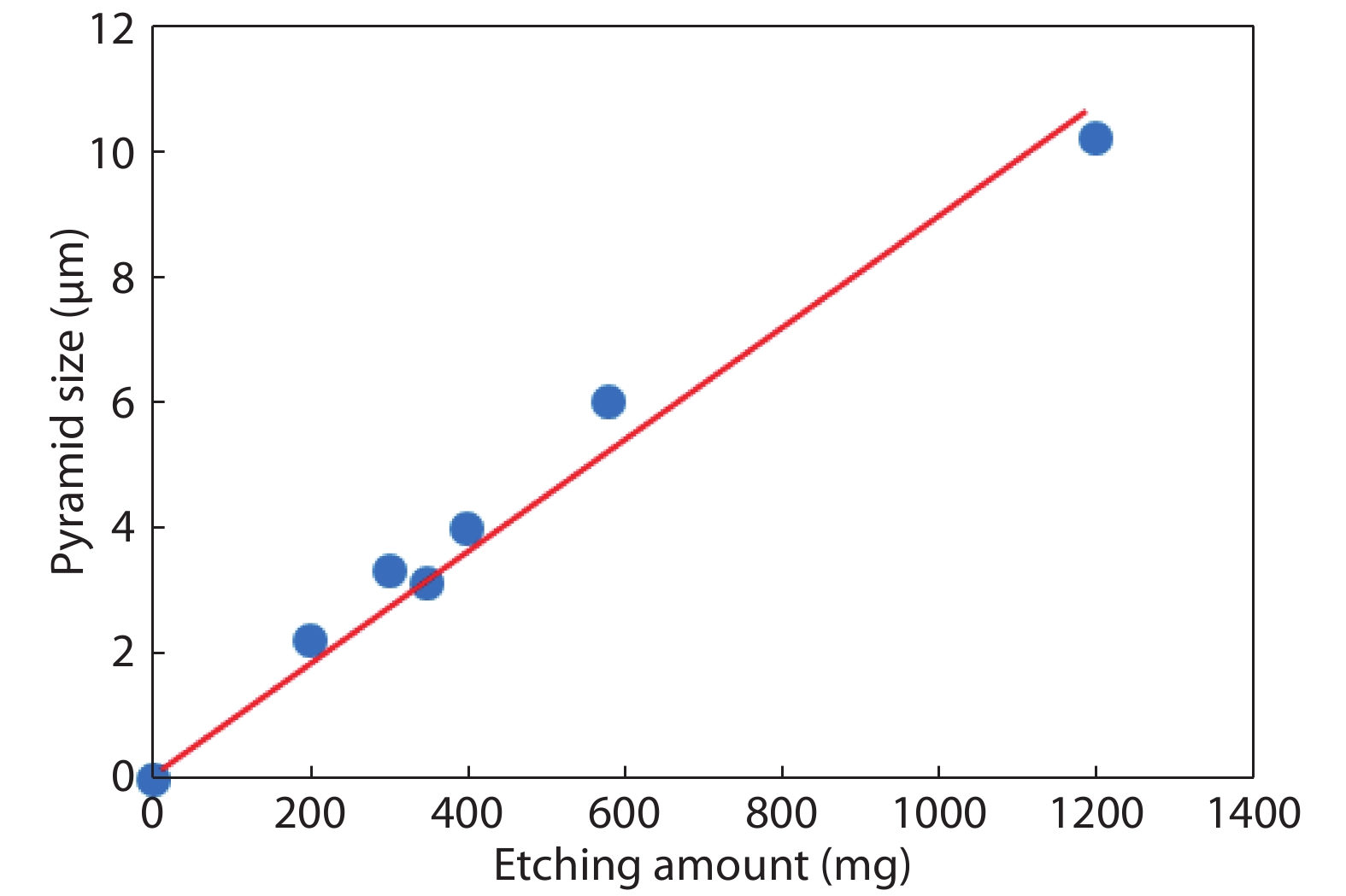 This paper investigates the formation process of surface pyramid and etching characteristics during the texturing process of mono-crystalline silicon wafers. It is found that there is an etch rate transition point in alkaline anisotropic etching when {100} plane-dominated etch turns to {111} plane-dominated etch, and the pyramid size has a strong linear correlation with the etch amount at the transition point. Several techniques were developed to control the pyramid size by monitoring and adjusting the etching amount. A wide range of average pyramid sizes were successfully achieved, from 0.5 to 12 μm. The experiments of the pyramid size on the light reflectance, the minority carrier lifetime (MCLT), and the performance of silicon heterojunction (SHJ) solar cells were carried out and analyzed. A desirable range of pyramid sizes was empirically determined by our investigation. In order to reduce the density states on the texturing surface, the wet-chemical smoothing treatment was also investigated. The smoothing treatment improves the passivation quality and the performance of the solar cells. Through pyramid size control and morphology treatment, together with the amorphous silicon (a-Si:H) deposition improvement, and electrode optimization, high performance of SHJ solar cells has been achieved, up to conversion efficiency 23.6%.