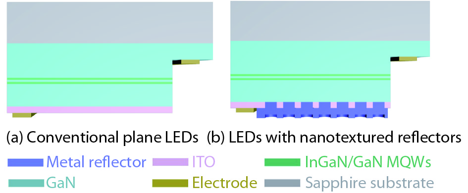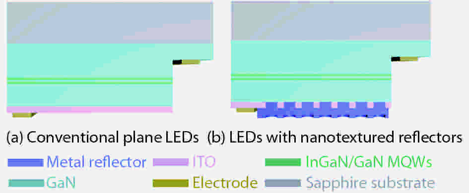 Influence of light absorption on the metallic nanotextured reflectors of GaN-based light emitting diodes