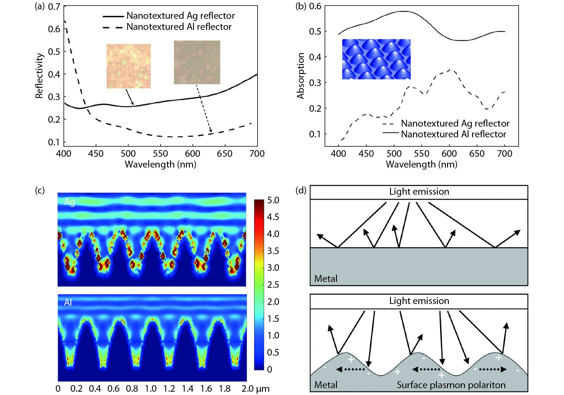 Metallic nanotextured reflectors have been widely used in light emitting diodes (LEDs) to enhance the light extraction efficiency. However, the light absorption loss for the metallic reflectors with nanotexture structure is often neglected. Here, the influence of absorption loss of metallic nanotextured reflectors on the LED optoelectronic properties were studied. Two commonly used metal reflectors Ag and Al were applied to green GaN-based LEDs. By applying a Ag nanotextured reflector, the light output power of the LEDs was enhanced by 78% due to the improved light extraction. For an Al nanotextured reflector, however, only a 6% enhancement of the light output power was achieved. By analyzing the metal absorption using finite-difference time-domain (FDTD) and the metal reflectivity spectrum, it is shown that the surface plasmon (SP) intrinsic absorption of metallic reflectors with nanotexture structure play an important role. This finding will aid the design of the high-performance metal nanotextured reflectors and optoelectronics devices.