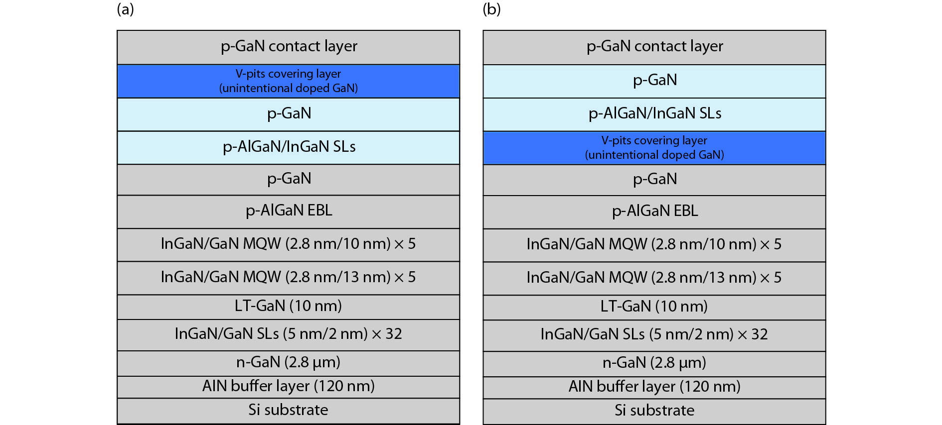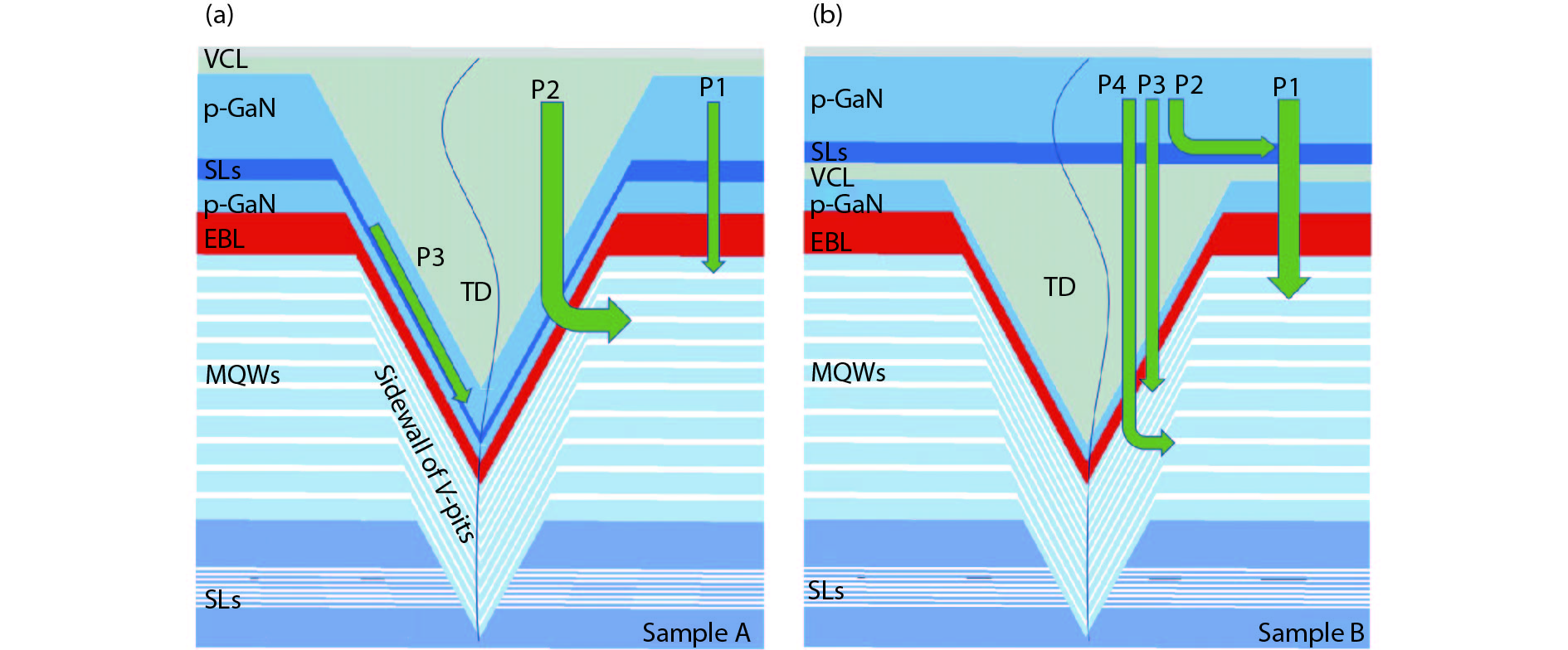 The impact of the V-pits covering layer (VCL) position on the optoelectronic performance of InGaN-based green light-emitting diodes (LEDs) was investigated. It is found that earlier covering of V-pits will hinder the hole injection via the sidewall of V-pits, and then result in less quantum wells (QWs) participating in radioluminescence. The current-voltage characteristics show that the LEDs with earlier covering of V-pits have higher operating voltage at room temperature, and a more dramatic voltage rise with the reduction of temperature. Meanwhile, more manifested emission peaks for sidewall QWs and deeper QWs near to n-type layer was observed in the sample with earlier coveing of V-pits at cryogenic temperatures, for the reason that the holes being injected via V-pits sidewall have higher kinetic energy and could transport to deeper QWs.