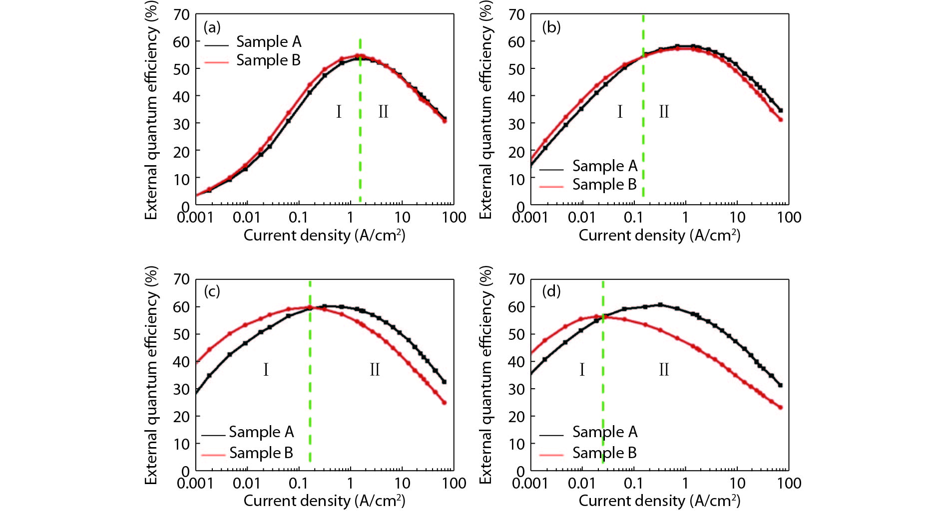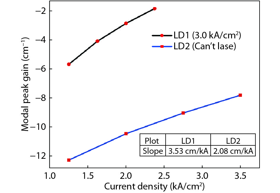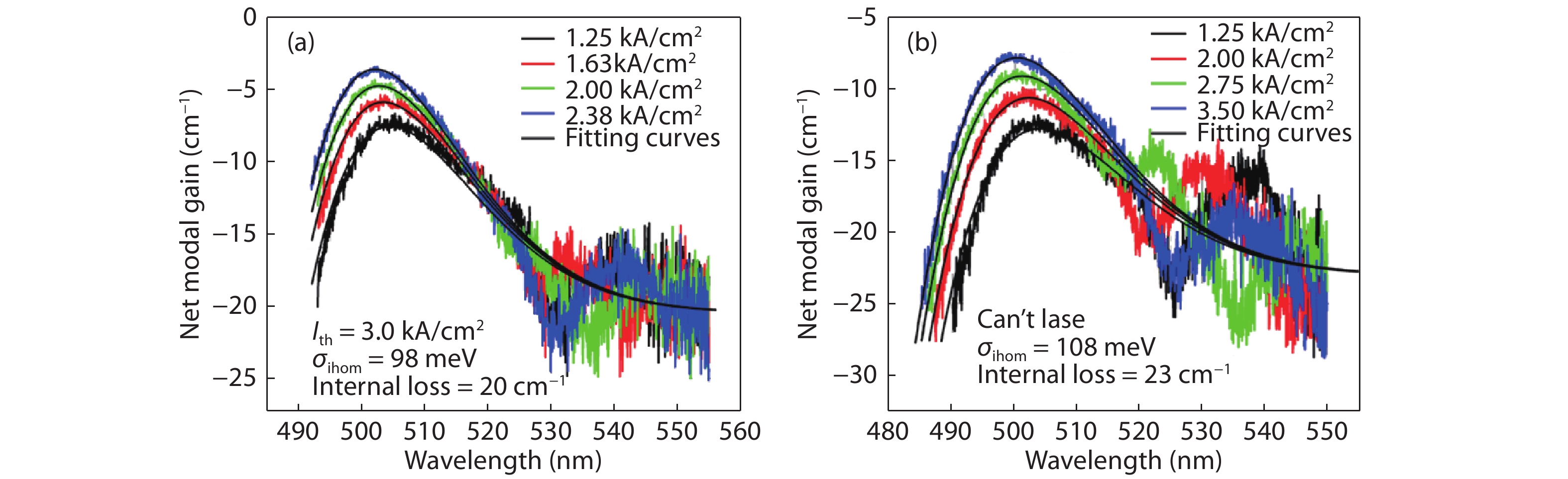 The inhomogeneous broadening parameter and the internal loss of green LDs are determined by experiments and theoretical fitting. It is found that the inhomogeneous broadening plays an important role on the threshold current density of green LDs. The green LD with large inhomogeneous broadening even cannot lase. Therefore, reducing inhomogeneous broadening is a key issue to improve the performance of green LDs.