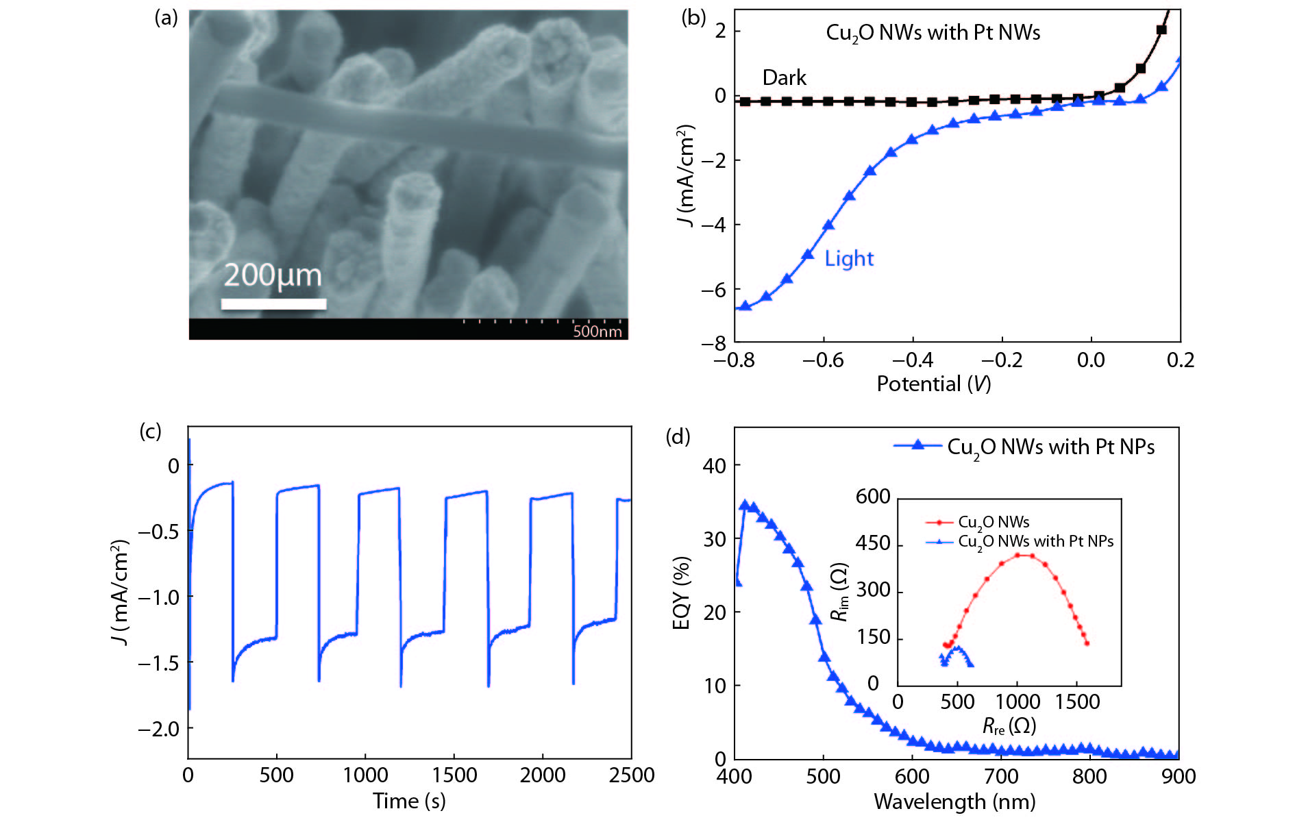 Nanowire (NW) structures is an alternative candidate for constructing the next generation photoelectrochemical water splitting system, due to the outstanding optical and electrical properties. NW photoelectrodes comparing to traditional semiconductor photoelectrodes shows the comparatively shorter transfer distance of photo-induced carriers and the increase amount of the surface reaction sites, which is beneficial for lowering the recombination probability of charge carriers and improving their photoelectrochemical (PEC) performances. Here, we demonstrate for the first time that super-long Cu2O NWs, more than 4.5 μm, with highly efficient water splitting performance, were synthesized using a cost-effective anodic alumina oxide (AAO) template method. In comparison with the photocathode with planar Cu2O films, the photocathode with Cu2O NWs demonstrates a significant enhancement in photocurrent, from –1.00 to –2.75 mA/cm2 at –0.8 V versus Ag/AgCl. After optimization of the photoelectrochemical electrode through depositing Pt NPs with atomic layer deposition (ALD) technology on the Cu2O NWs, the plateau of photocurrent has been enlarged to –7 mA/cm2 with the external quantum yield up to 34% at 410 nm. This study suggests that the photoelectrode based on Cu2O NWs is a hopeful system for establishing high-efficiency water splitting system under visible light.