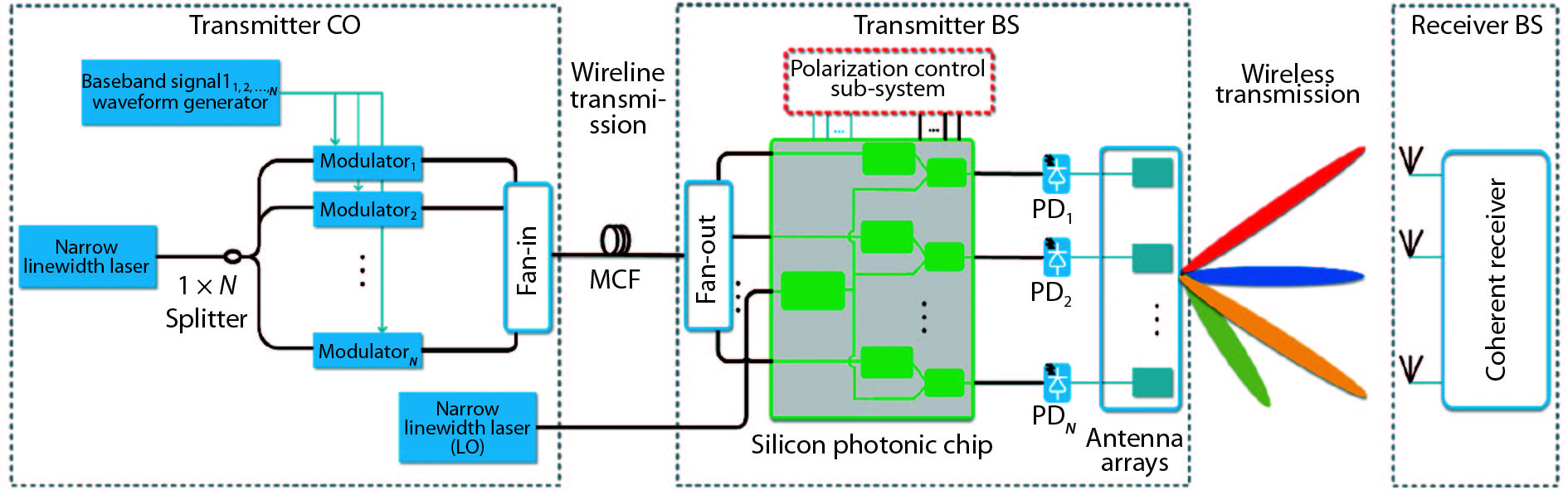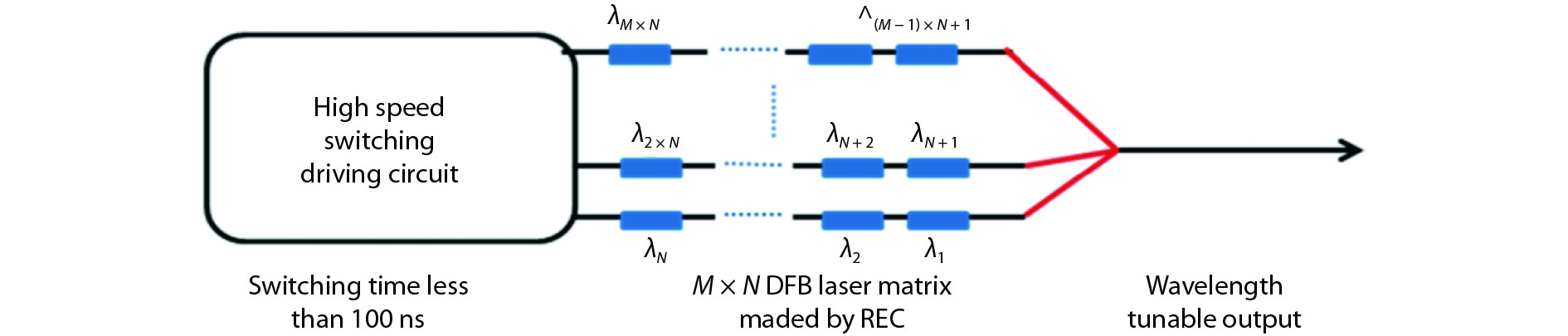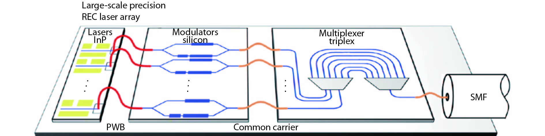 Since the proposal of the concept of photonic integrated circuits (PICs), tremendous progress has been made. In 2005, Infinera Corp. rolled out the first commercial PICs, in which hundreds of optical functions were integrated onto a small form factor chip for wavelength division multiplexing (WDM) systems[1], then a monolithically integrated 10 × 10 Gb/s WDM chip has been demonstrated, the channel number is ten[2]. Like ICs, large-scale PICs (LS-PICs) will be sure to be pursued. However, there are still some general challenges associated with LS-PICs. The challenges for III–V (mainly InP) PICs is the semiconductor process, which is not mature for LS-PICs. Up to now, the channel number in commercial III–V WDM PICs by Infinera is still about ten or less. For silicon photonics, the challenge is the silicon based light source. The low cost and mature solution for silicon lasers is still unavailable and only 4 × 25 Gb/s PICs are deployed by Intel Corp. after 18-year R&D investment. Thus it is still unavailable for practical LS-PICs in the present times.