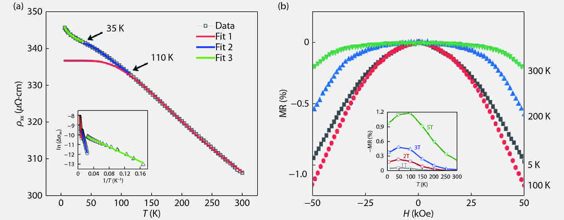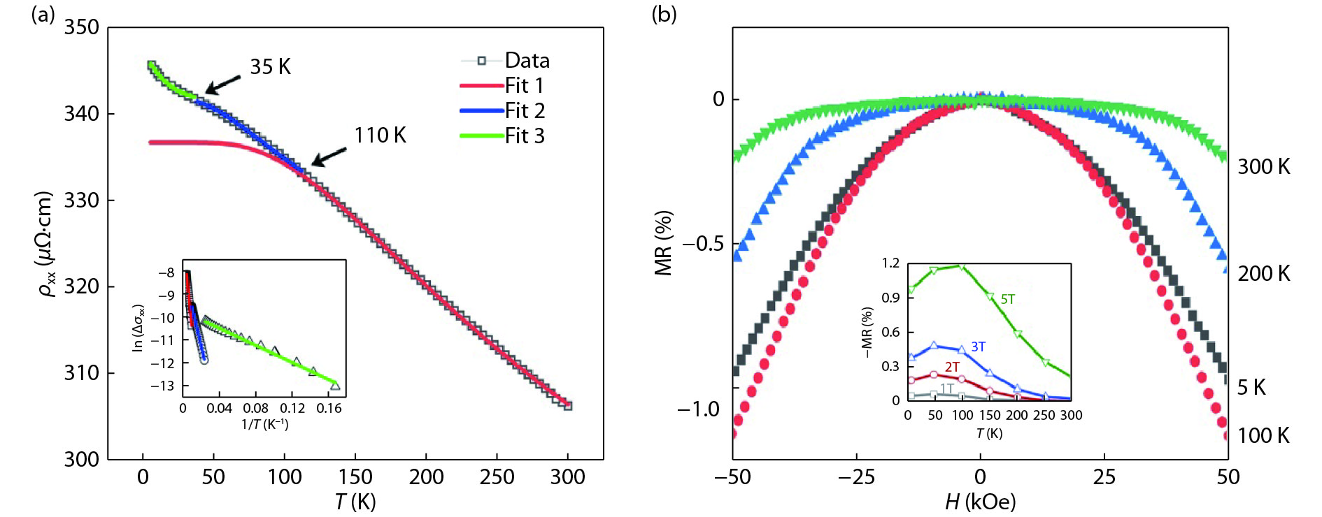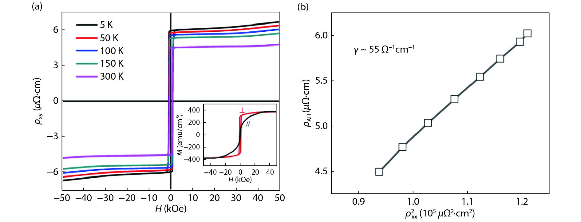 We have investigated the magneto-transport properties of an off-stoichiometric full-Heusler alloy Co2MnAl single-crystalline film. The Co1.65Mn1.35Al (CMA) film epitaxially grown on Ⅲ–Ⅴ semiconductor GaAs substrate exhibits perpendicular magnetic anisotropy. The resistivity of the CMA film increases with the temperature T decreasing from 300 to 5 K, showing a semiconducting-like transport behavior. Different activation energies are found in three temperature regions with transition temperatures of 35 and 110 K. In the meanwhile, the remanent magnetization can be described by T3/2 and T2 laws in the corresponding medium and high T ranges, respectively. The transition at around 110 K could be attributed to the ferromagnetism evolving from localized to itinerant state. The Curie temperature of the CMA film is estimated to be ~640 K. The intrinsic anomalous Hall conductivity of ~55 Ω–1cm–1 is obtained, which is almost twenty times smaller than that of Co2MnAl.
