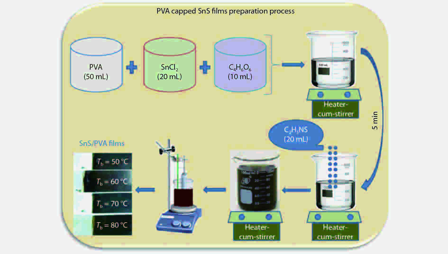 Tin monosulphide (SnS) thin films capped by PVA have been successfully deposited on glass substrates for cost effective photovoltaic device applications by a simple and low-cost wet chemical process, chemical bath deposition (CBD) at different bath temperatures varying in the range, 50–80 °C. X–ray diffraction analysis showed that the deposited films were polycrystalline in nature, showing orthorhombic structure with an intense peak corresponding to (040) plane of SnS. These observations were further confirmed by Raman analysis. FTIR spectra showed the absorption bands which corresponds to PVA in addition to SnS. The scanning electron microscopy and atomic force microscopy studies revealed that the deposited SnS films were uniform and nanostructured with an average particle size of 4.9 to 7.6 nm. The optical investigations showed that the layers were highly absorbing with the optical absorption coefficient ~105 cm–1. A decrease in optical band gap from 1.92 to 1.55 eV with an increase of bath temperature was observed. The observed band gap values were higher than the bulk value of 1.3 eV, which might be due to quantum confinement effect. The optical band gap values were also used to calculate particle size and the results are discussed.