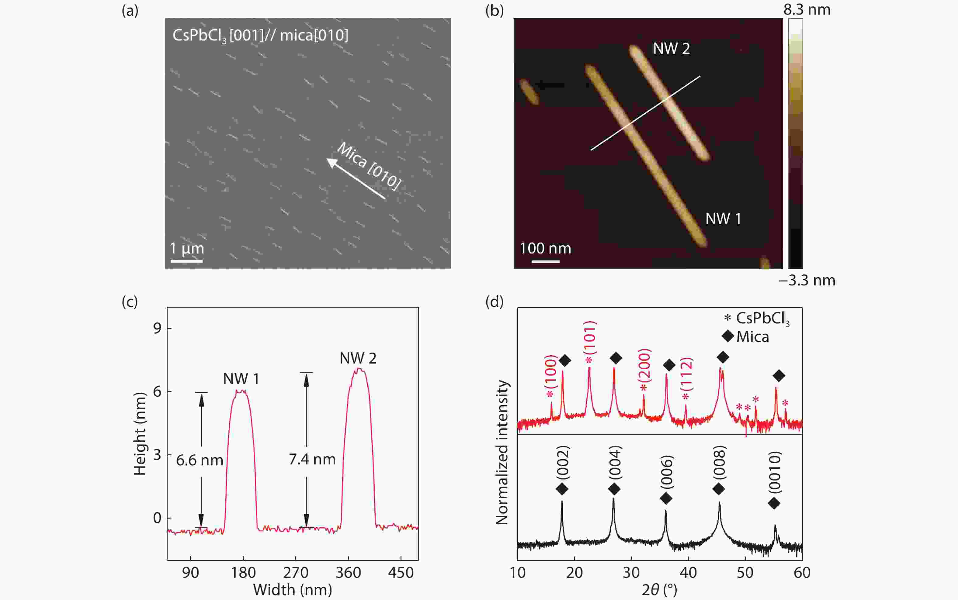 Fabricating high-quality cesium lead chloride (CsPbCl3) perovskite nanowires (NWs) with dimension below 10 nm is not only of interests in fundamental physics, but also holds the great promise for optoelectronic applications. Herein, ultrathin CsPbCl3 NWs with height of ~7 nm, have been achieved via vapor phase deposition method. Power and temperature-dependent photoluminescence (PL) spectroscopy is performed to explore the emission properties of the CsPbCl3 NWs. Strong free exciton recombination is observed at ~3.02 eV as the temperature (T) is 78?294 K with binding energy of ~ 37.5 meV. With the decreasing of T, the PL peaks exhibit a first blueshift by 2 meV for T ~ 294?190 K and then a redshift by 4 meV for T ~ 190?78 K. The exciton–optical phonon interaction plays a major role in the linewidth broadening of the PL spectra with average optical phonon energy of ~48.0 meV and the interaction coefficient of 203.9 meV. These findings advance the fabrication of low dimensional CsPbCl3 perovskite and provide insights into the photophysics of the CsPbCl3 perovskite.