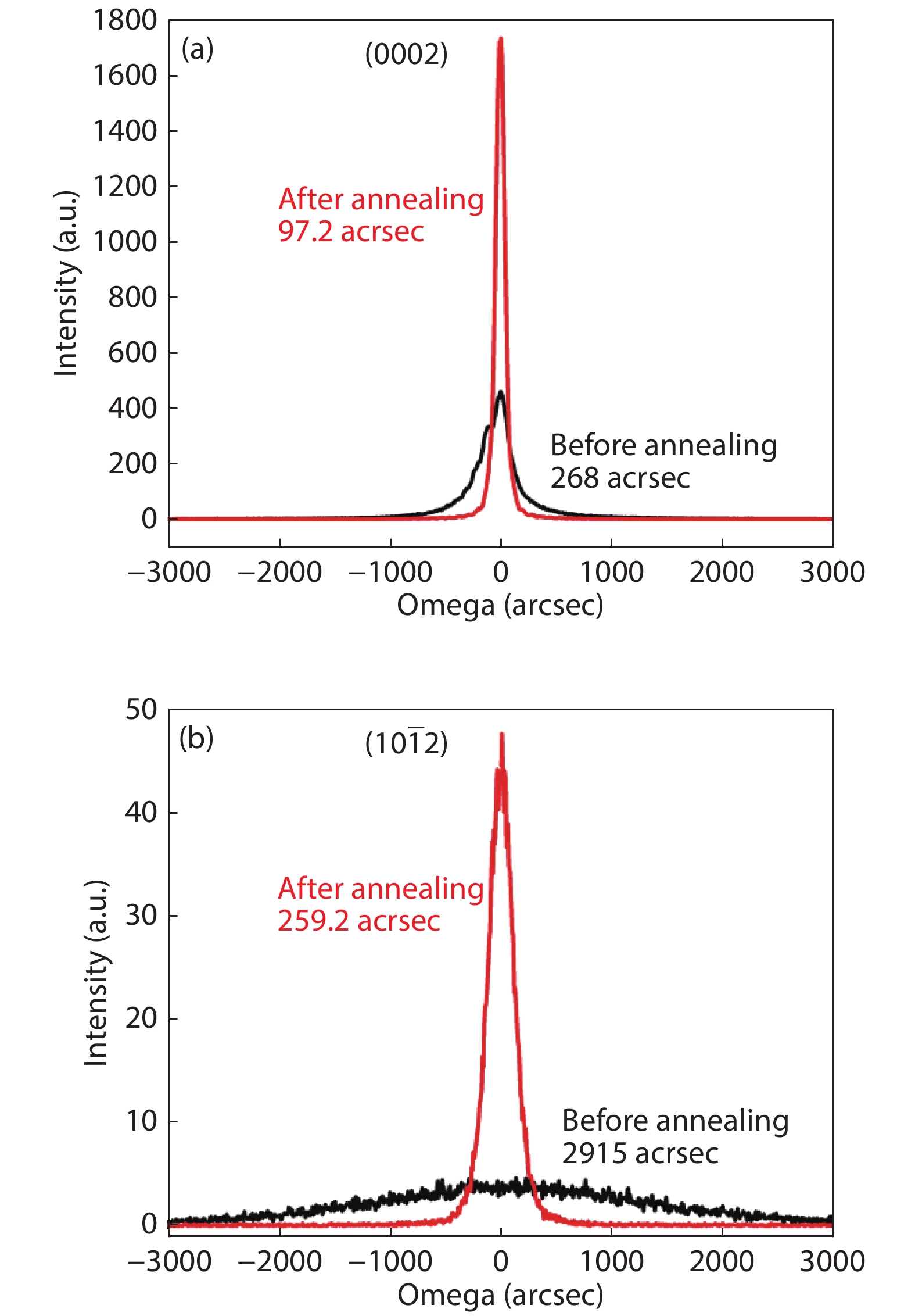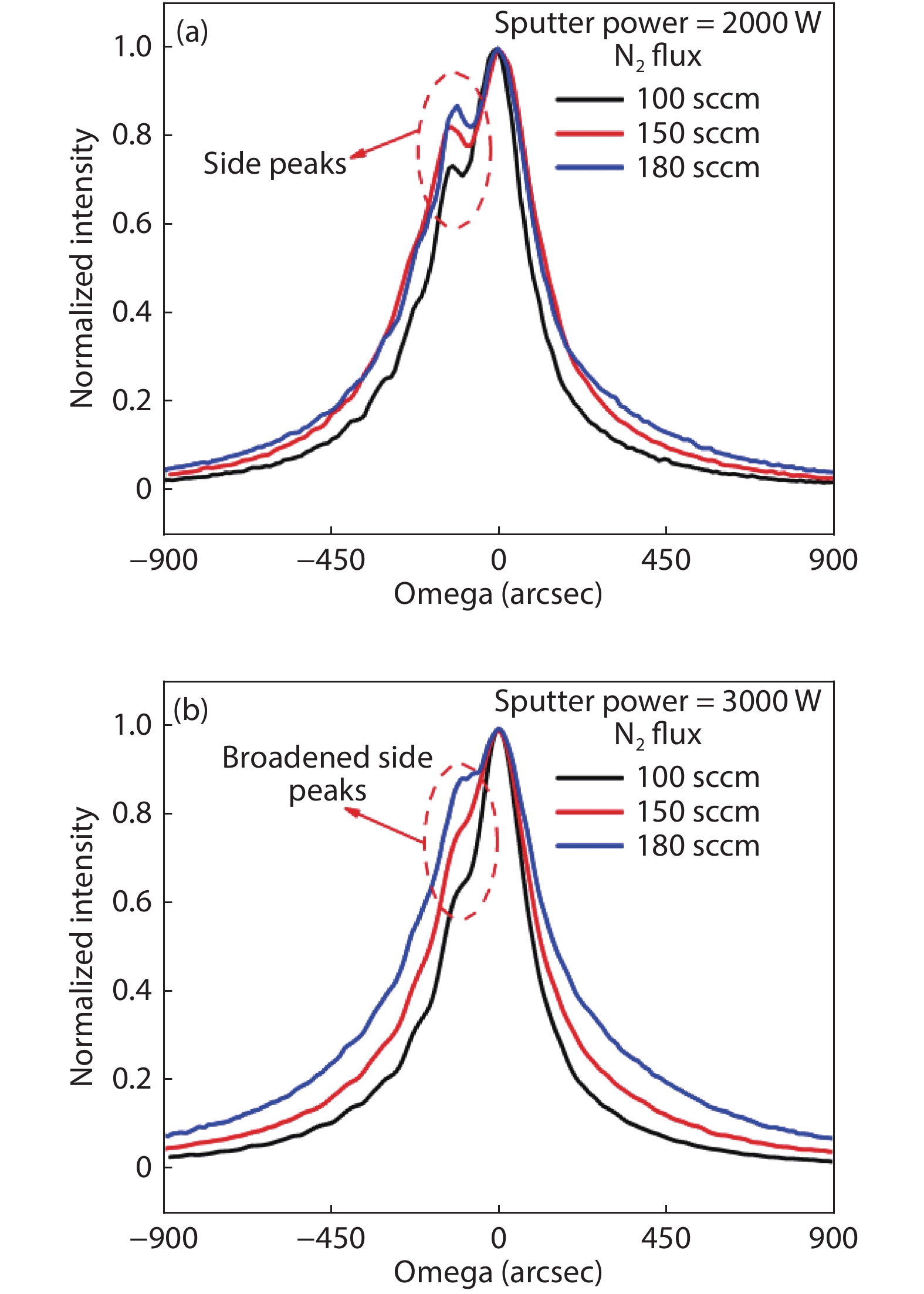 High-quality AlN/sapphire templates were fabricated by the combination of sputtering and high-temperature (HT) annealing. The influence of sputtering parameters including nitrogen flux, radio frequency power, and substrate temperature on the crystalline quality and surface morphology of annealed AlN films were investigated. With lower substrate temperature, lower power, and lower N2 flux, the full width at half maximum of the X-ray rocking curve for AlN (0002) and (10$ \bar {1} $2) were improved to 97.2 and 259.2 arcsec after high-temperature annealing. This happens because the increased vacancy concentration of sputtered AlN films can facilitate the annihilation of dislocations by increasing the recovery rate during HT annealing. Step and step-bunching morphologies were clearly observed with optimized sputtering conditions.