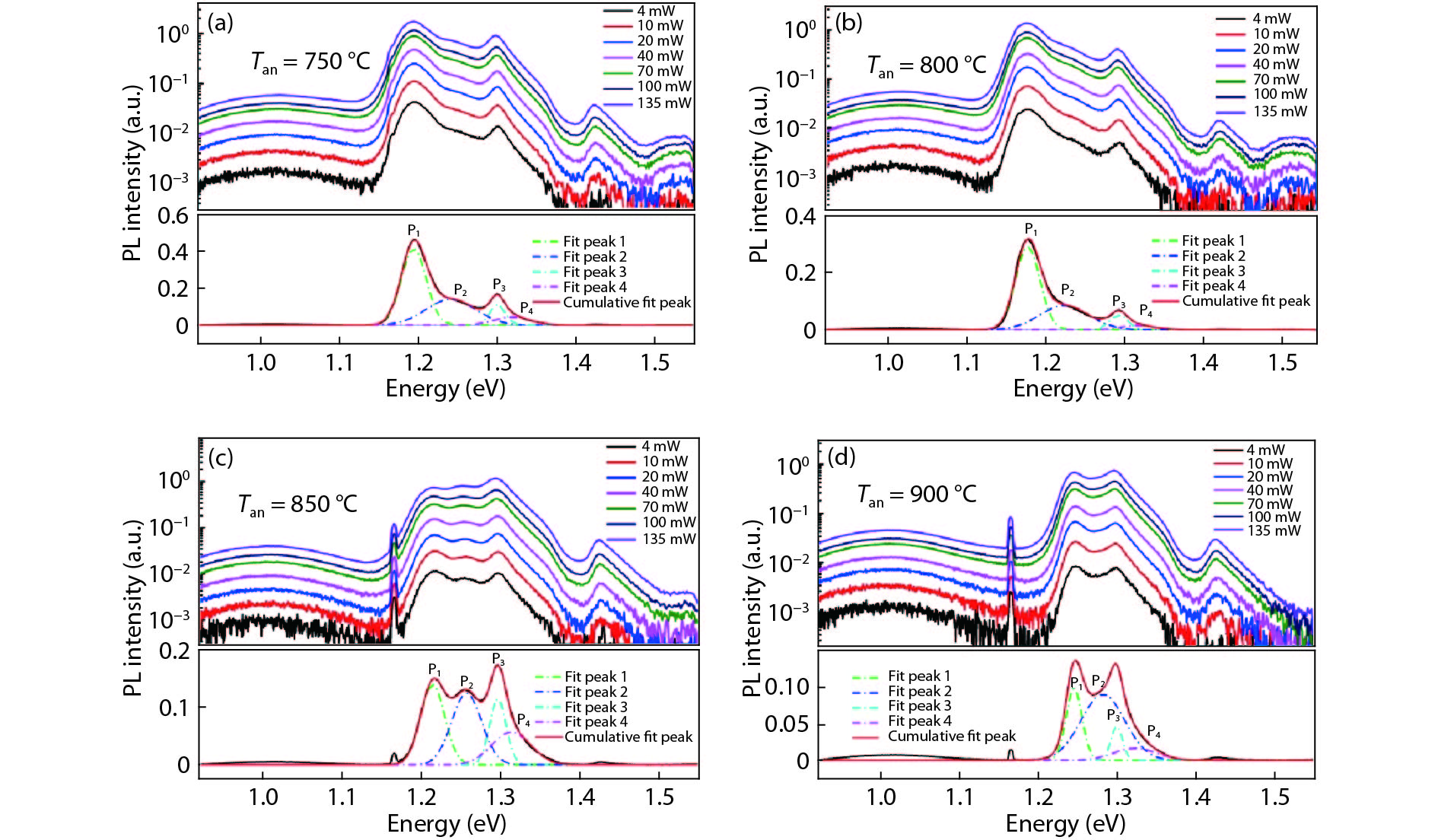 Photoluminescence (PL) test was conducted to investigate the effect of rapid thermal annealing (RTA) on the optical performance of self-assembled InAs/GaAs quantum dots (QDs) at the temperatures of 16 and 300 K. It was found that after RTA treatment, the PL spectrum of the QDs sample had a large blue-shift and significantly broadened at 300 K. Compared with the as-grown InAs QDs sample, the PL spectral width has increased by 44.68 meV in the InAs QDs sample RTA-treated at 800 °C. The excitation power-dependent PL measurements showed that the broadening of the PL peaks of the RTA-treated InAs QDs should be related to the emission of the ground state (GS) of different-sized InAs QDs, the InAs wetting layer (WL) and the In0.15Ga0.85As strain reduction layer (SRL) in the epitaxial InAs/GaAs layers.