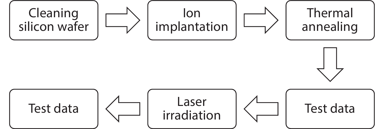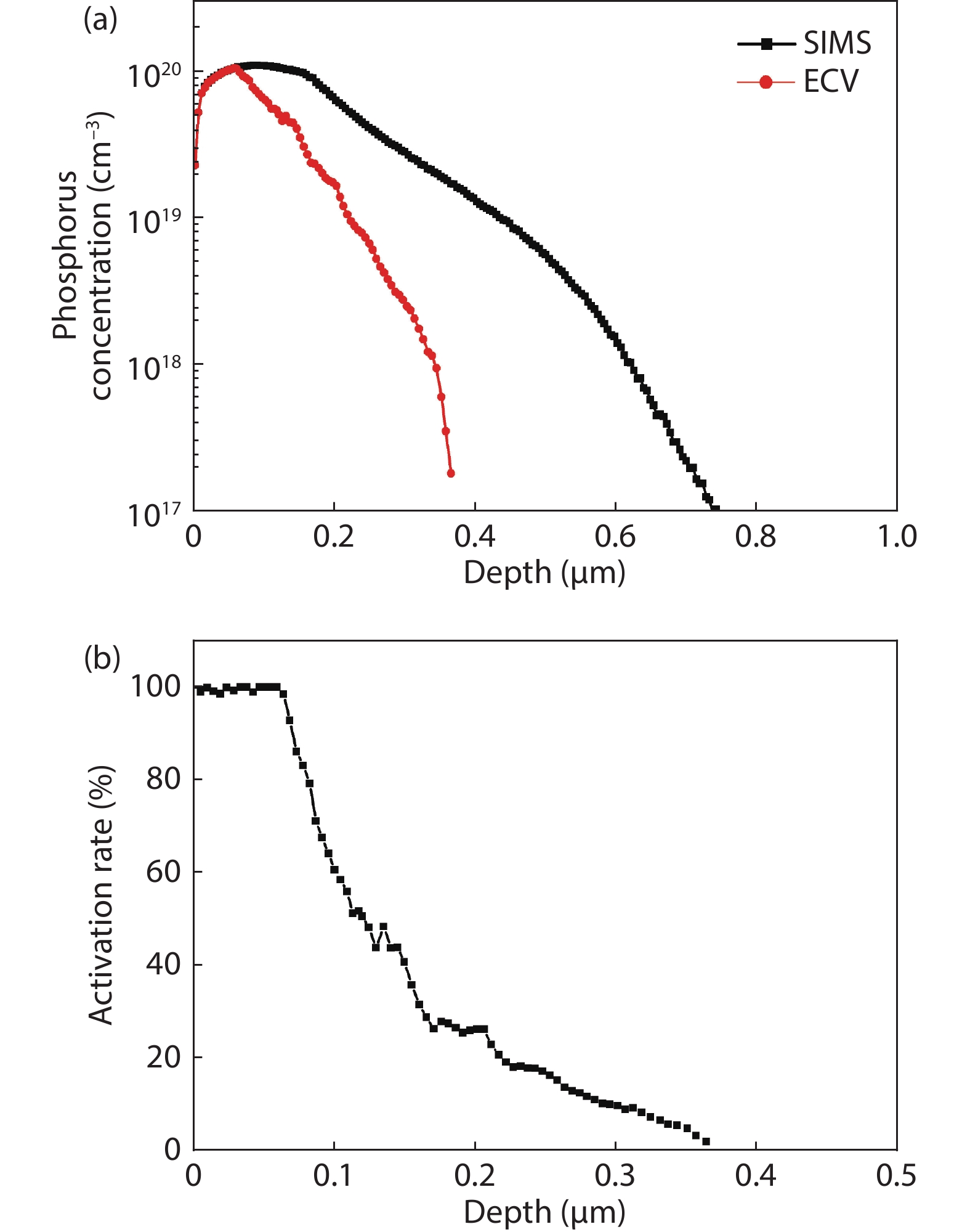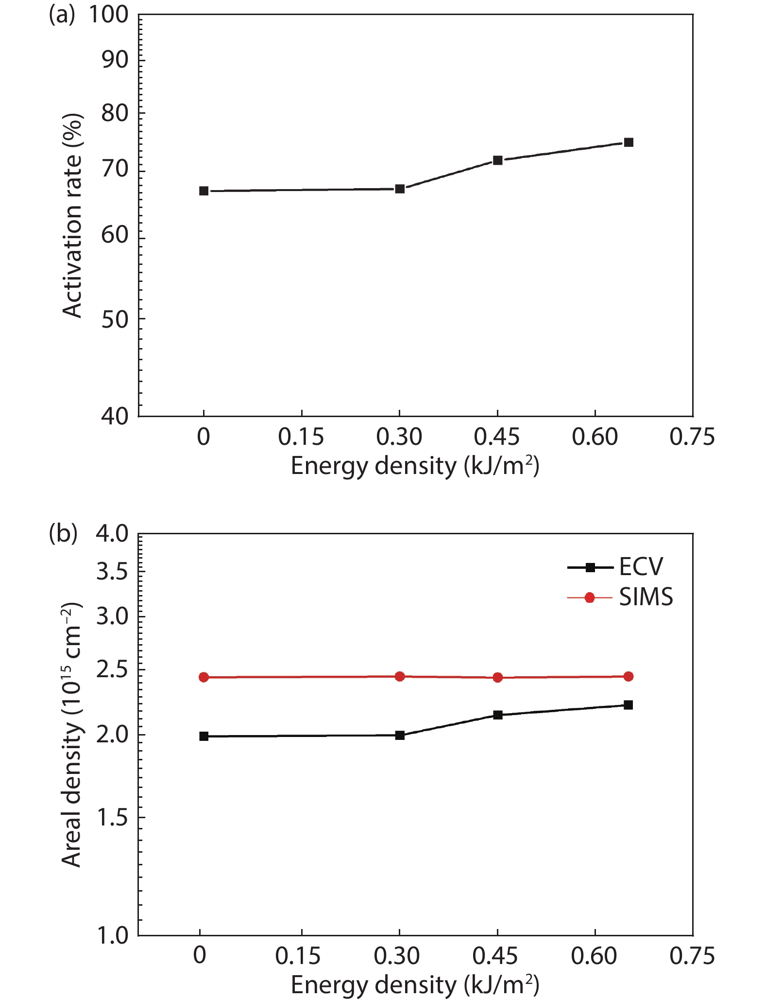 Thermal annealing and laser irradiation were used to study the activation rate of phosphorus in silicon after ion implantation. The activation rate refers to the ratio of activated impurity number to the total impurity number in the sample. After injecting phosphorus with the dose and energy (energy = 55 keV, dose = 3 × 1015 cm–2), the samples were annealed at different temperatures, and laser irradiation experiments were performed after annealing. The experimental results showed that the activation rate of phosphorus was the highest at 850 °C, and the highest activation rate was 67%. Upon femtosecond laser irradiation samples after thermal annealing, while keeping the crystalline silicon surface without damage, the activation rate was improved. When the energy-flux density of the femtosecond laser was 0.65 kJ/cm2, the activation rate was the highest, increasing from 67% to 74.81%.