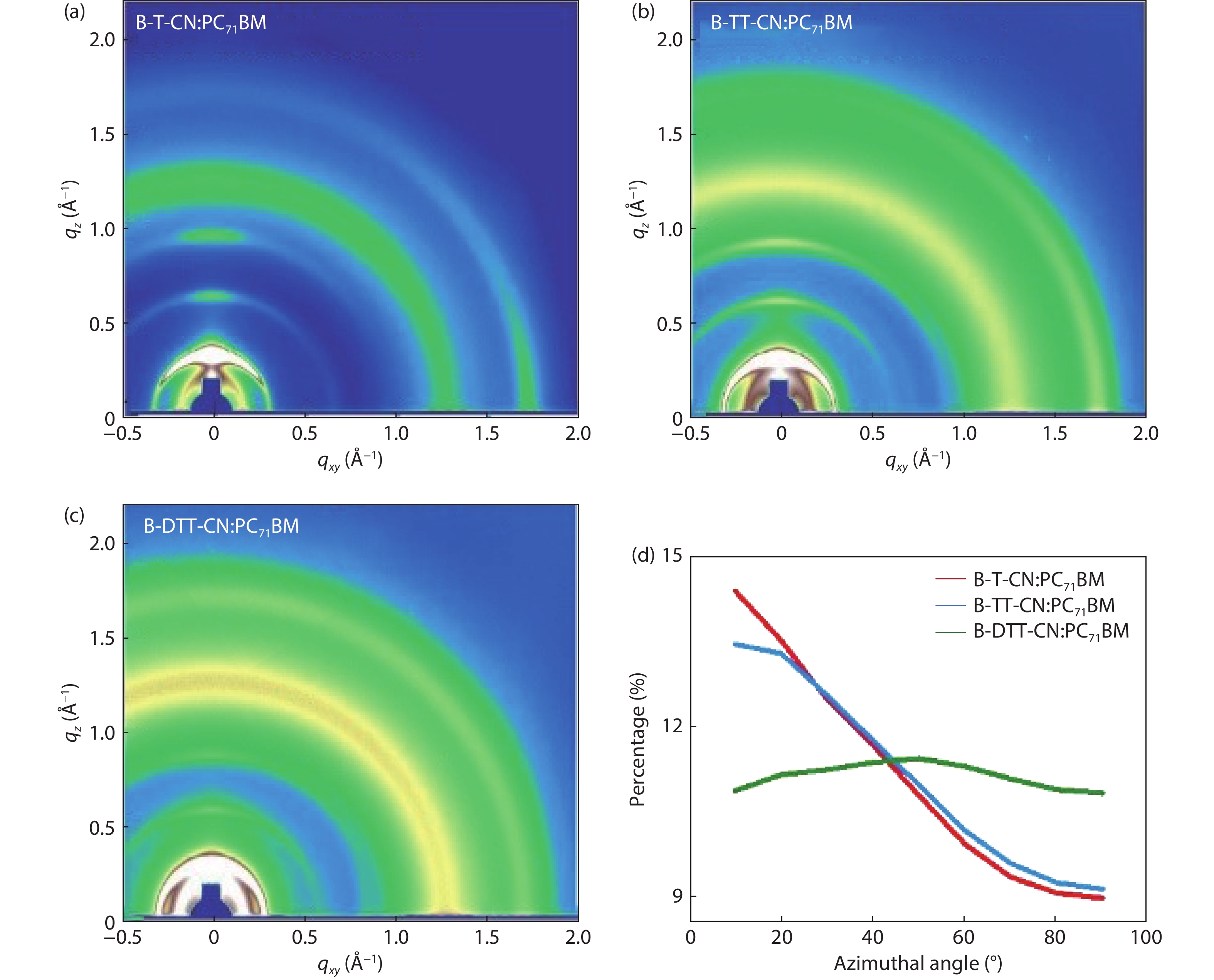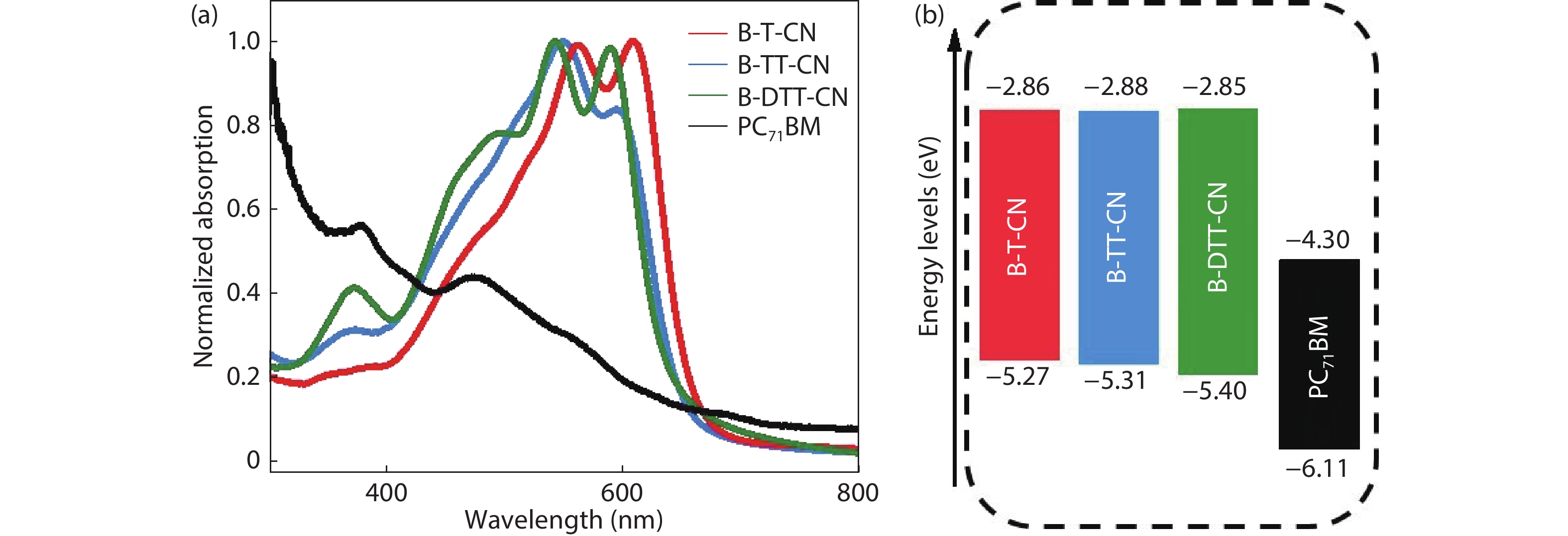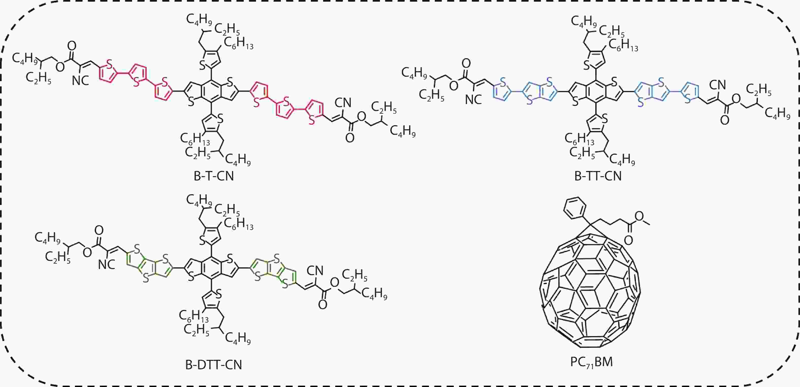 Three small molecule (SM) donors, namely B-T-CN, B-TT-CN and B-DTT-CN, with different π conjugated bridges were synthesized in this research. Interestingly, with the conjugated fused rings of the π linking bridge increasing, the SM HOMO levels exhibit a decline tendency with –5.27 eV for B-T-CN, –5.31 eV for B-TT-CN and –5.40 eV for B-DTT-CN. After blending the SM donors with the fullerene acceptor PC71BM, the all SM organic solar cells (OSCs) achieved high Vocs of 0.90 to 0.96 V. However, the phase separation morphology and molecule stacking are also unexpectedly changed together with the enhancement of conjugated degree of π bridges, resulting in a lower power conversion efficiency (PCE) for the B-DTT-CN:PC71BM device. Our results demonstrate and provide a useful way to enhance OSC Voc and the morphology needs to be further optimized.