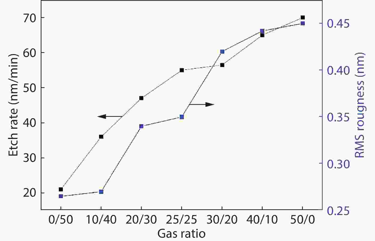 Compared to the conventional phase change materials, the new phase change material Ta-Sb2Te3 has the advantages of excellent data retention and good material stability. In this letter, the etching characteristics of Ta-Sb2Te3 were studied by using CF4/Ar. The results showed that when CF4/Ar = 25/25, the etching power was 600 W and the etching pressure was 2.5 Pa, the etching speed was up to 61 nm/min. The etching pattern of Ta-Sb2Te3 film had a smooth side wall and good perpendicularity (close to 90°), smooth surface of the etching (RMS was 0.51nm), and the etching uniformity was fine. Furthermore, the mechanism of this etching process was analyzed by X-ray photoelectron spectroscopy (XPS). The main damage mechanism of ICP etching in CF4/Ar was studied by X-ray diffraction (XRD).
