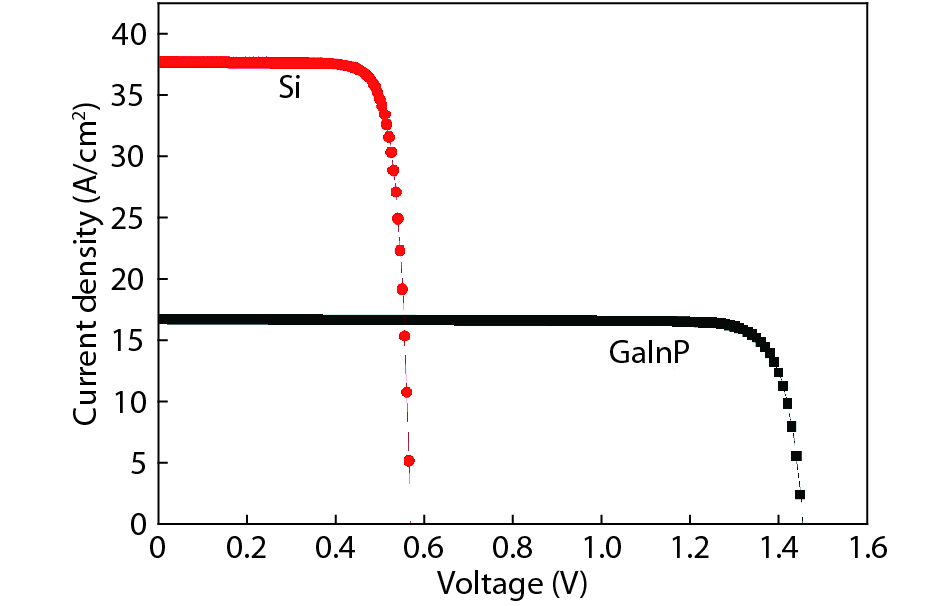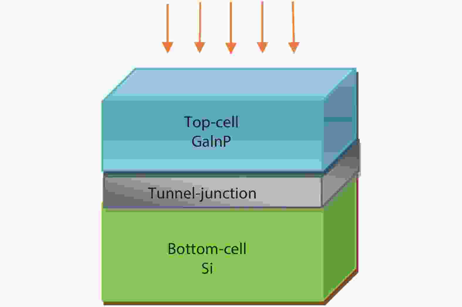 The solar power conversion efficiency of a gallium indium phosphide (GaInP)/silicon (Si) tandem solar cell has been investigated by means of a physical device simulator considering both mechanically stacked and monolithic structures. In particular, to interconnect the bottom and top sub-cells of the monolithic tandem, a gallium arsenide (GaAs)-based tunnel-junction, i.e. GaAs(n+)/GaAs(p+), which assures a low electrical resistance and an optically low-loss connection, has been considered. The J–V characteristics of the single junction cells, monolithic tandem, and mechanically stacked structure have been calculated extracting the main photovoltaic parameters. An analysis of the tunnel-junction behaviour has been also developed. The mechanically stacked cell achieves an efficiency of 24.27% whereas the monolithic tandem reaches an efficiency of 31.11% under AM1.5 spectral conditions. External quantum efficiency simulations have evaluated the useful wavelength range. The results and discussion could be helpful in designing high efficiency monolithic multijunction GaInP/Si solar cells involving a thin GaAs(n+)/GaAs(p+) tunnel junction.