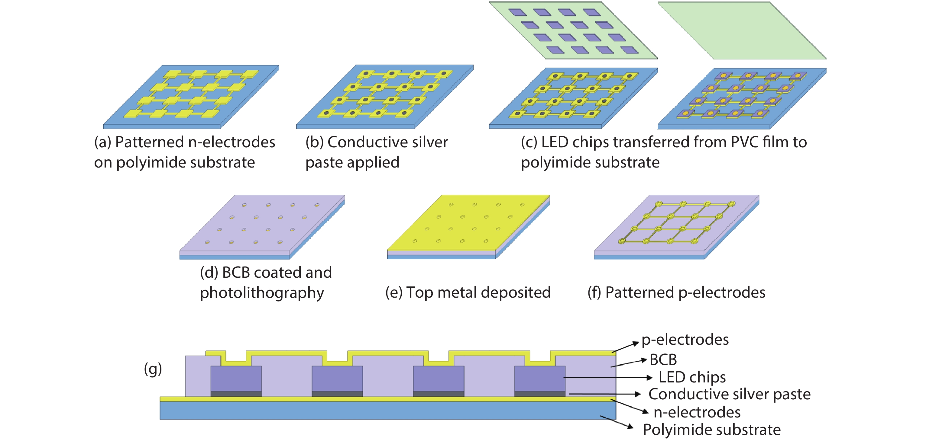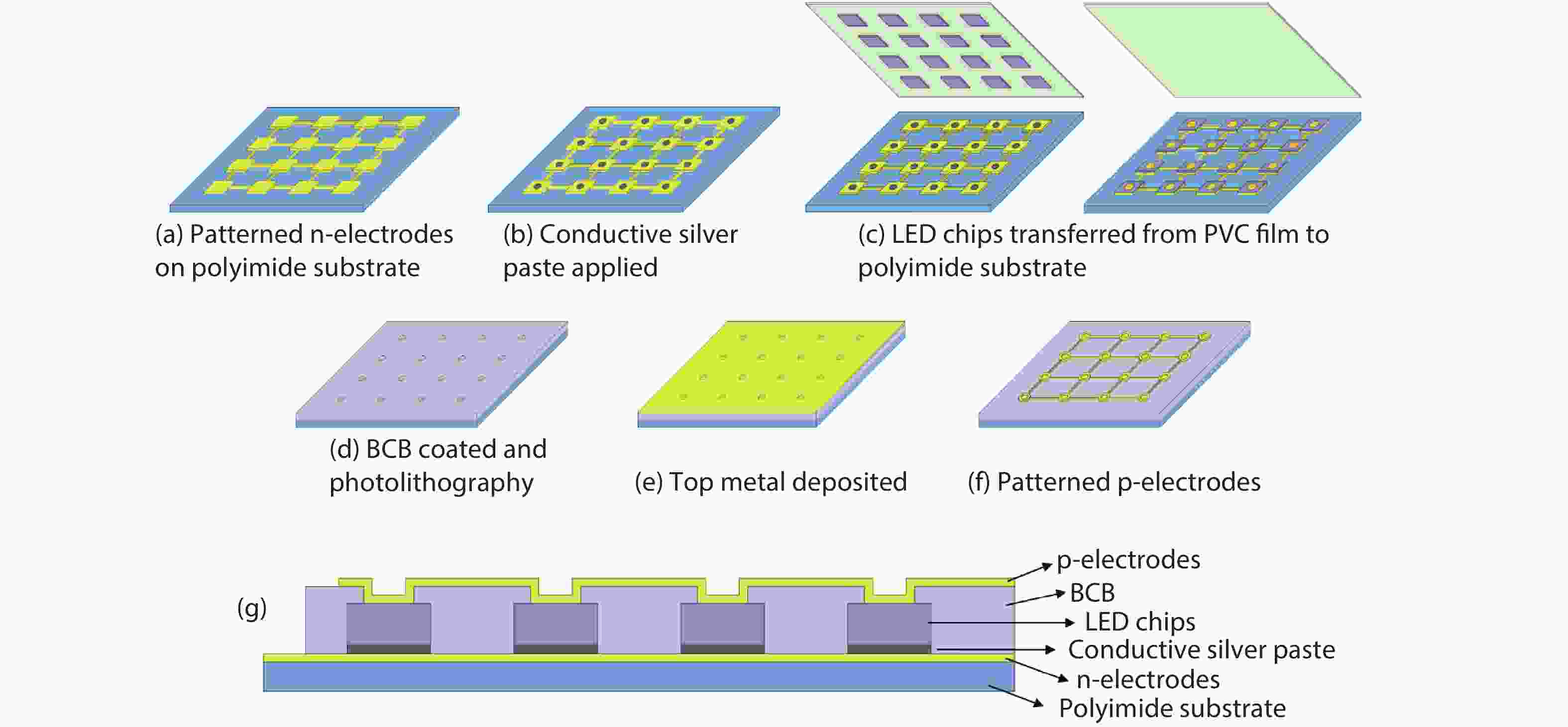 Flexible light-emitting diodes (LEDs) are highly desired for wearable devices, flexible displays, robotics, biomedicine, etc. Traditionally, the transfer process of an ultrathin wafer of about 10–30 μm to a flexible substrate is utilized. However, the yield is low, and it is not applicable to thick GaN LED chips with a 100 μm sapphire substrate. In this paper, transferable LED chips utilized the mature LED manufacture technique are developed, which possesses the advantage of high yield. The flexible LED array demonstrates good electrical and optical performance.
