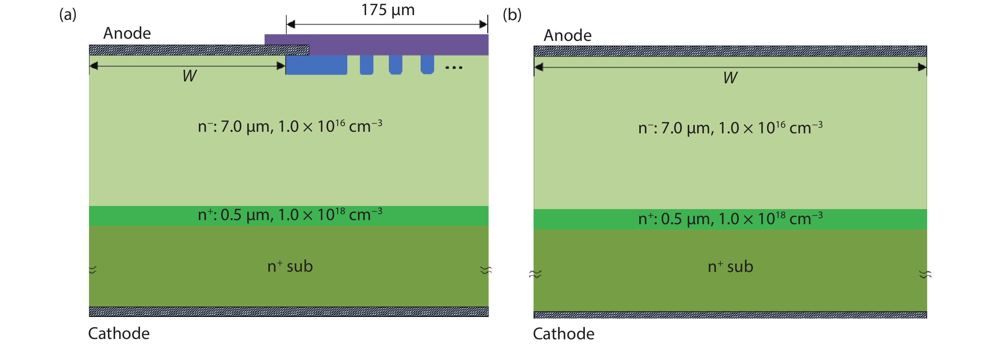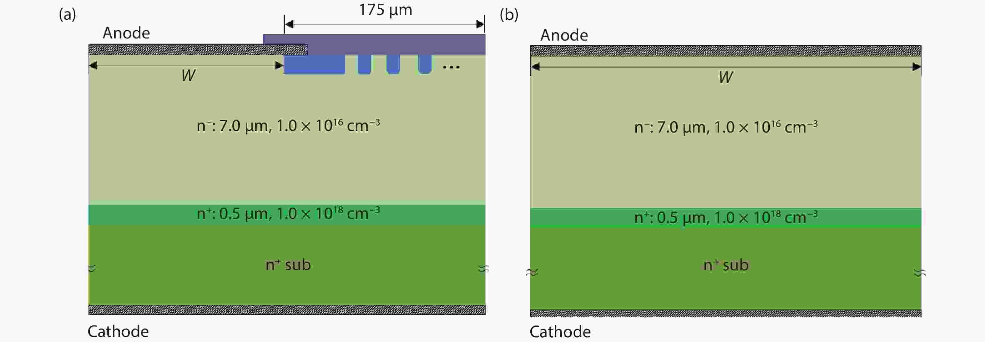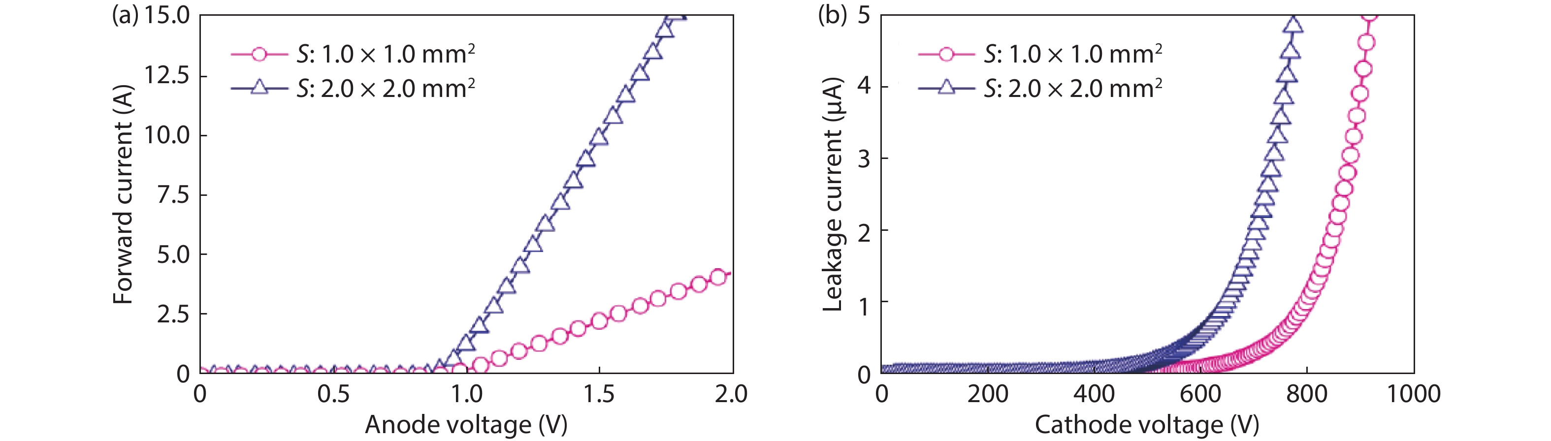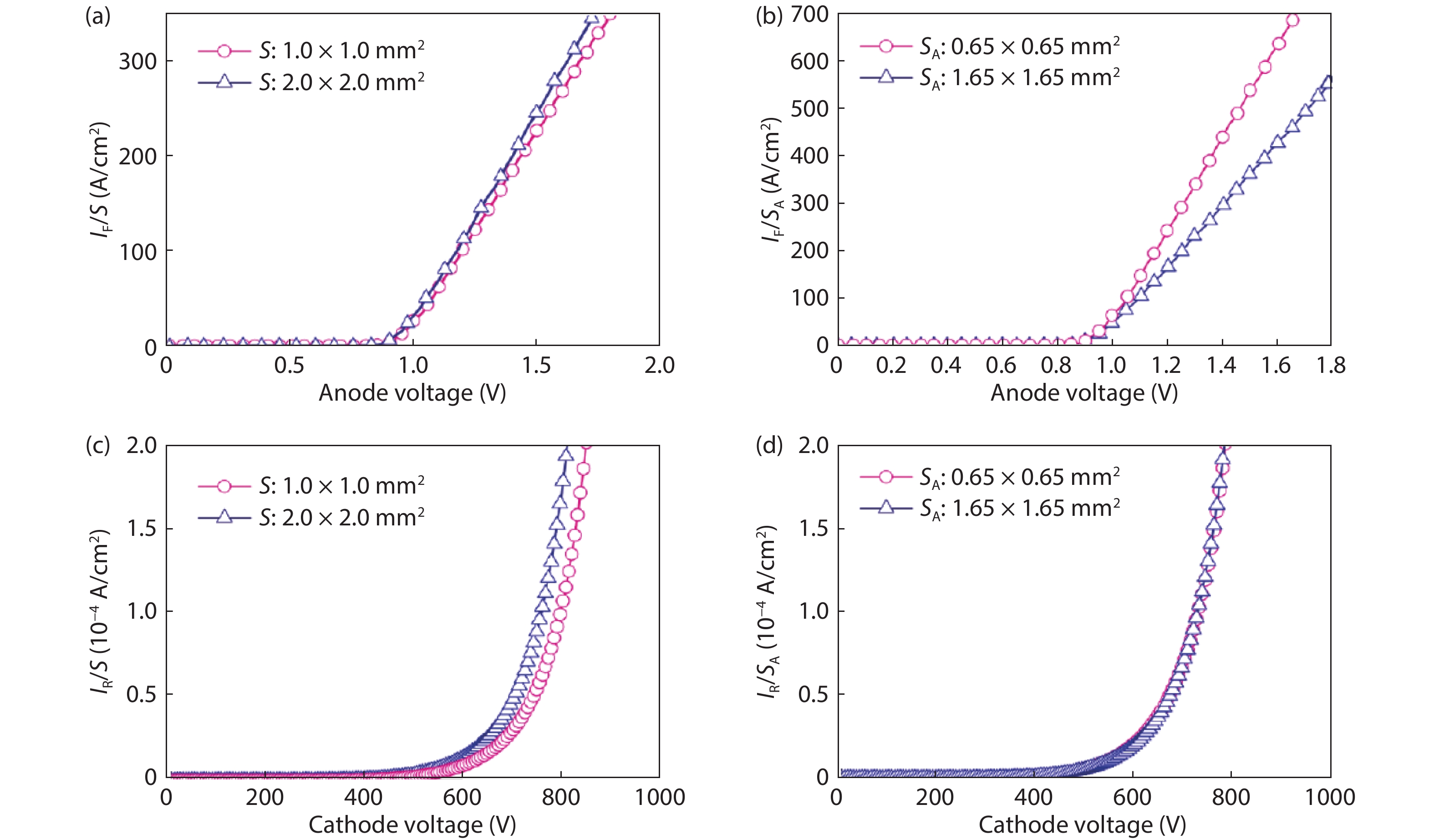 Lateral current spreading in the 4H-SiC Schottky barrier diode (SBD) chip is investigated. The 4H-SiC SBD chips with the same vertical parameters are simulated and fabricated. The results indicate that there is a fixed spreading resistance at on-state in current spreading region for a specific chip. The linear specific spreading resistance at the on-state is calculated to be 8.6 Ω/cm in the fabricated chips. The proportion of the lateral spreading current in total forward current (Psp) is related to anode voltage and the chip area. Psp is increased with the increase in the anode voltage during initial on-state and then tends to a stable value. The stable values of Psp of the two fabricated chips are 32% and 54%. Combined with theoretical analysis, the proportion of the terminal region and scribing trench in a whole chip (Ksp) is also calculated and compared with Psp. The Ksp values of the two fabricated chips are calculated to be 31.94% and 57.75%. The values of Ksp and Psp are close with each other in a specific chip. The calculated Ksp can be used to predict that when the chip area of SiC SBD becomes larger than 0.5 cm2, the value of Psp would be lower than 10%.