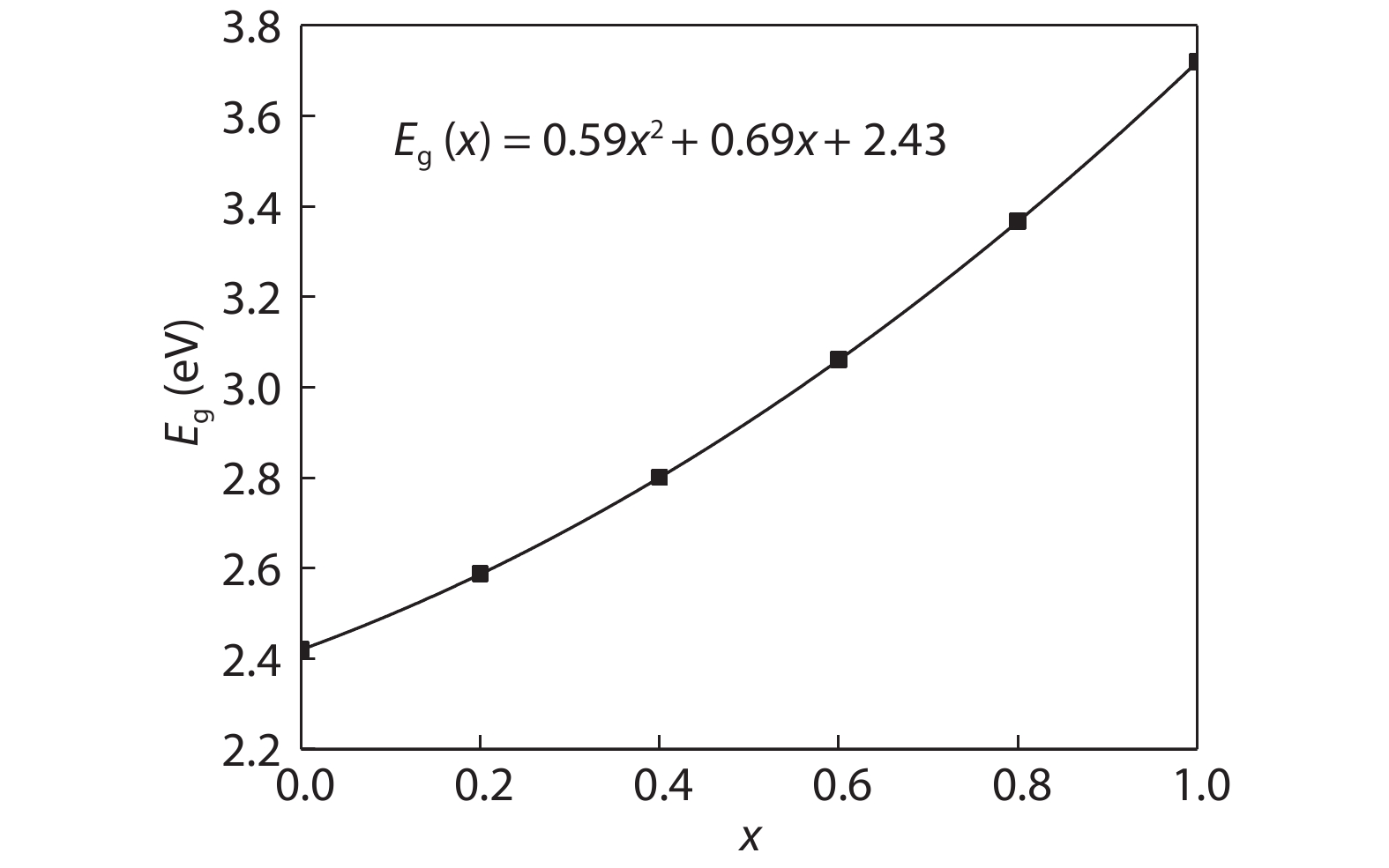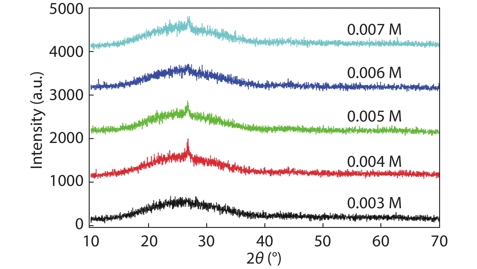 Cd1–xZnxS thin films were deposited by chemical bath deposition (CBD) on the glass substrate to study the influence of cadmium sulfate concentration on the structural characteristics of the thin film. The SEM results show that the thin film surfaces under the cadmium sulfate concentration of 0.005 M exhibit better compactness and uniformity. The distribution diagrams of thin film elements illustrate the film growth rate changes on the trend of the increase, decrease, and increase with the increase of cadmium sulfate concentration. XRD studies exhibit the crystal structure of the film is the hexagonal phase, and there are obvious diffraction peaks and better crystallinity when the concentration is 0.005 M. Spectrophotometer test results demonstrate that the relationship between zinc content x and optical band gap value Eg can be expressed by the equation Eg(x) = 0.59x2 + 0.69x + 2.43. Increasing the zinc content can increase the optical band gap, and the absorbance of the thin film can be improved by decreasing the cadmium sulfate concentration, however, all of them have good transmittance. At a concentration of 0.005 M, the thin film has good absorbance in the 300–800 nm range, 80% transmittance, and band gap value of 3.24 eV, which is suitable for use as a buffer layer for solar cells.