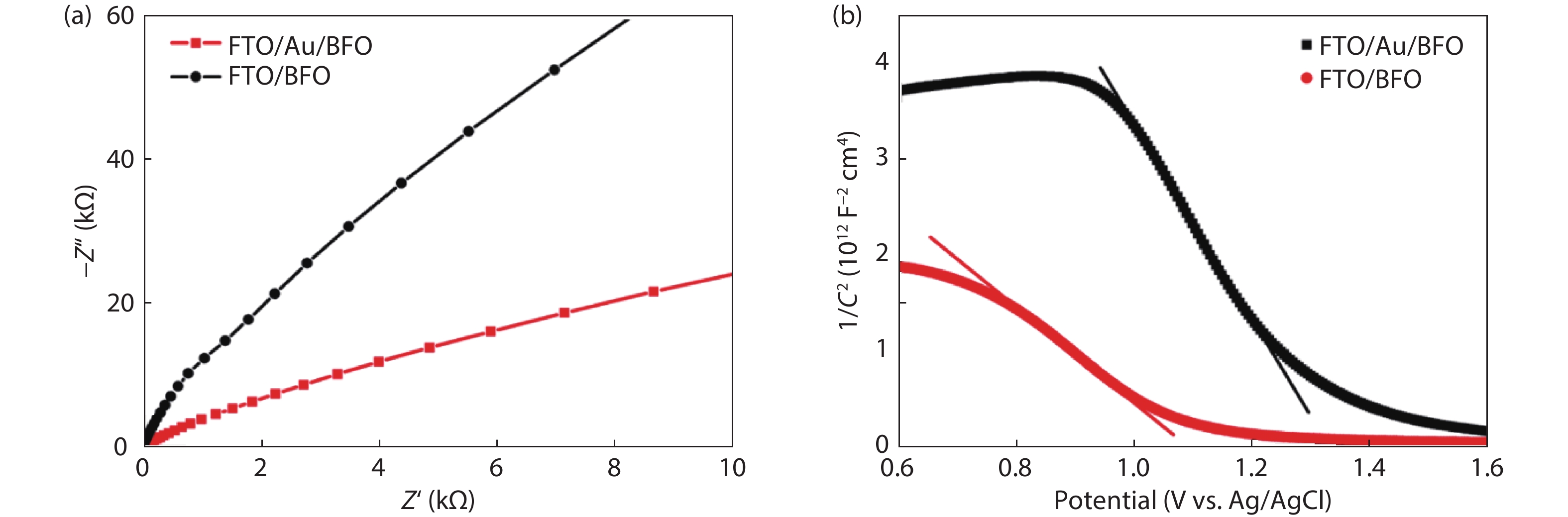 The inefficient separation of photogenerated carriers has become a serious problem that limits the photoelectrochemical (PEC) performance of semiconductors. Herein, a sol-gel method was used to prepare BiFeO3 ferroelectric thin films with FTO and FTO/Au as substrates, respectively. The polarization electric field of the ferroelectric can more effectively separate the carriers generated in the photoelectrode. Meanwhile, the introduction of an Au buffer layer can reduce the resistance in the process of charge transfer, accelerate the carrier migration, and enhance the efficiency of the charge separation. Under light irradiation, Au/BiFeO3 photoelectrode exhibited an extraordinary improvement in PEC water splitting compared with BiFeO3. In addition, the ferroelectric polarization electric field causes band bending, which further accelerates the separation of electrons and holes and improves the PEC performance of the photoelectrode. This work promotes the effective application of ferroelectric films in PEC water splitting.