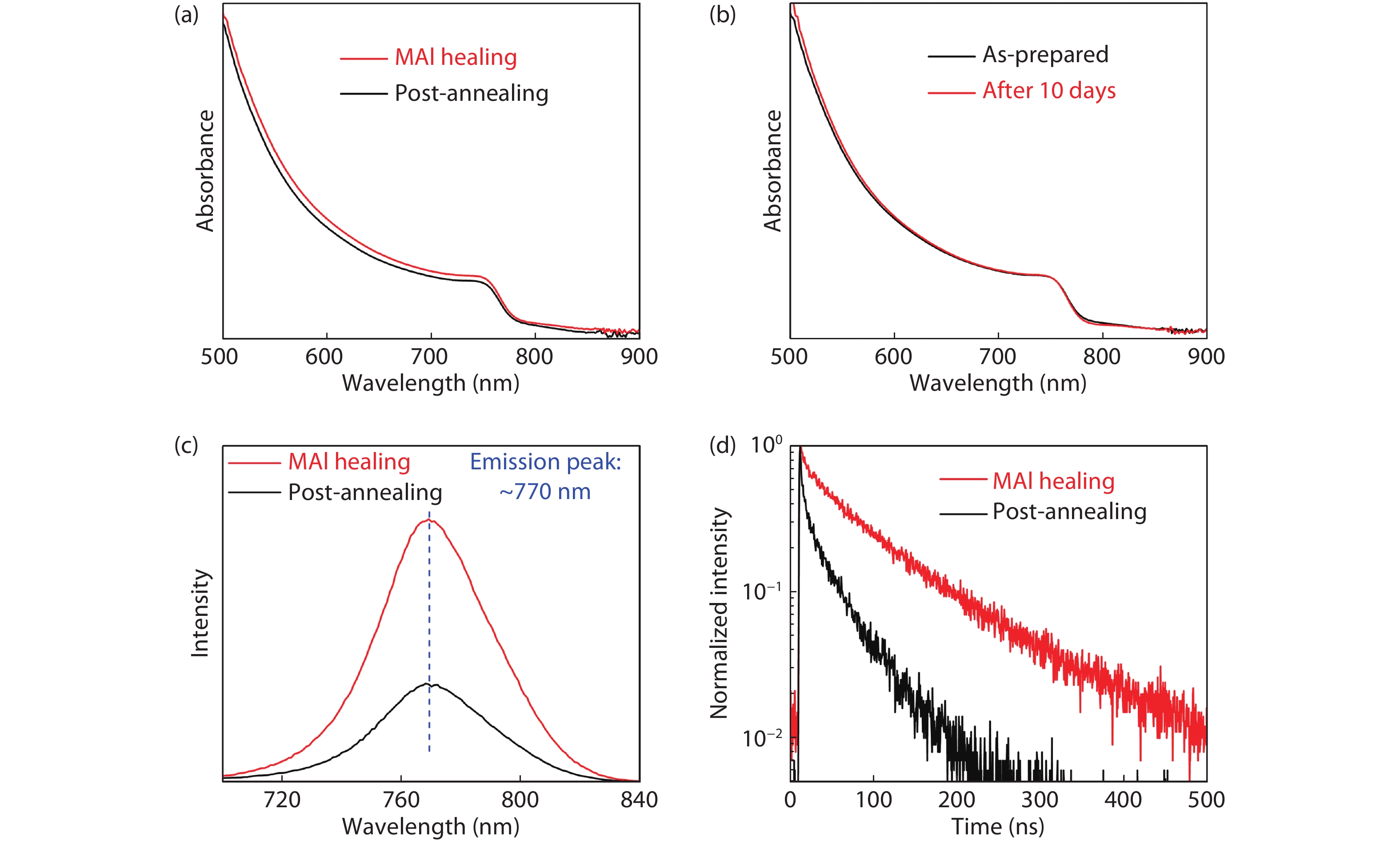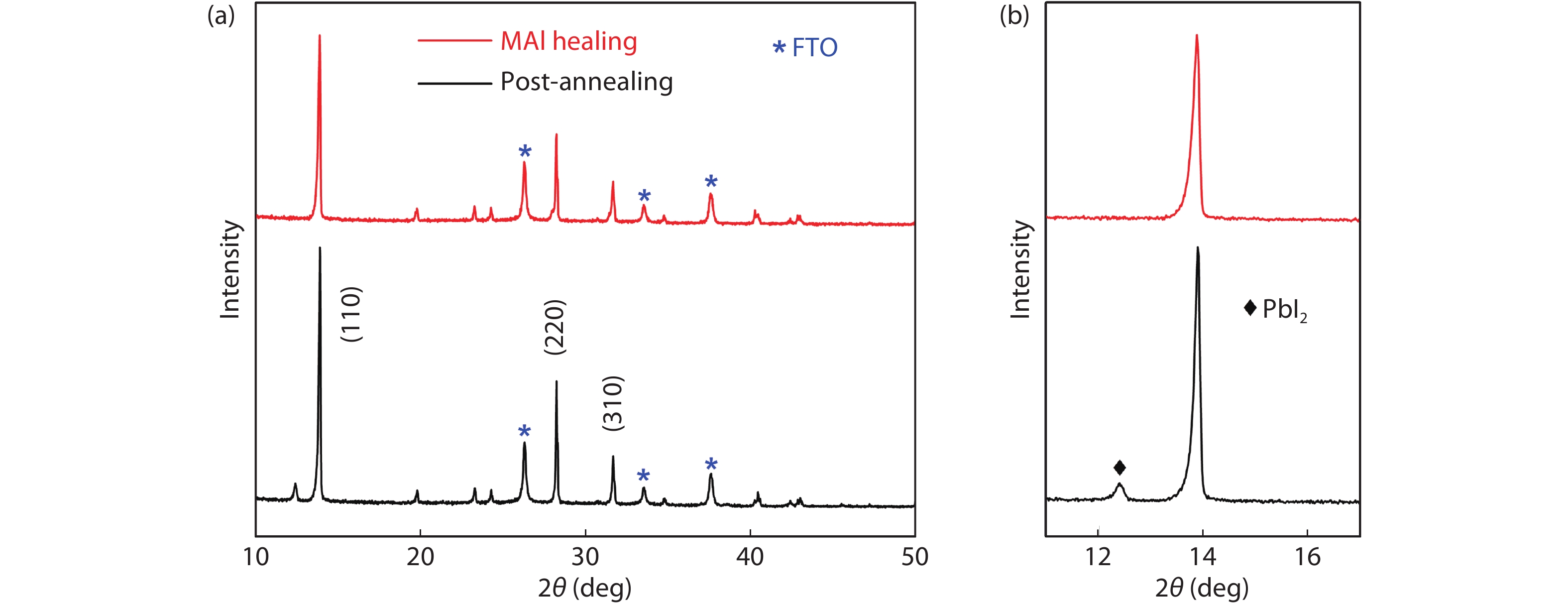 Repressing the thermal decomposition during the process of heat treatment plays an indispensable part in the preparation of perovskite films. Here, a methylammonium iodide healing method was applied to prevent the volatilization of the organic component inside the perovskite structure during the heat treatment. High-quality CH3NH3PbI3 film with a much larger grain size over 800 nm was successfully fabricated via this healing method. Besides, the absorption and photoluminescence intensity were also both improved. Finally, the best power conversion efficiency of 18.89% with a fill factor over 80% was realized in an n–i–p configuration while possessing outstanding stability. This work suggests that methylammonium iodide healing method is a reliable way to promote crystal growth and improve the photovoltaic performance and humidity stability of the CH3NH3PbI3 solar cells.