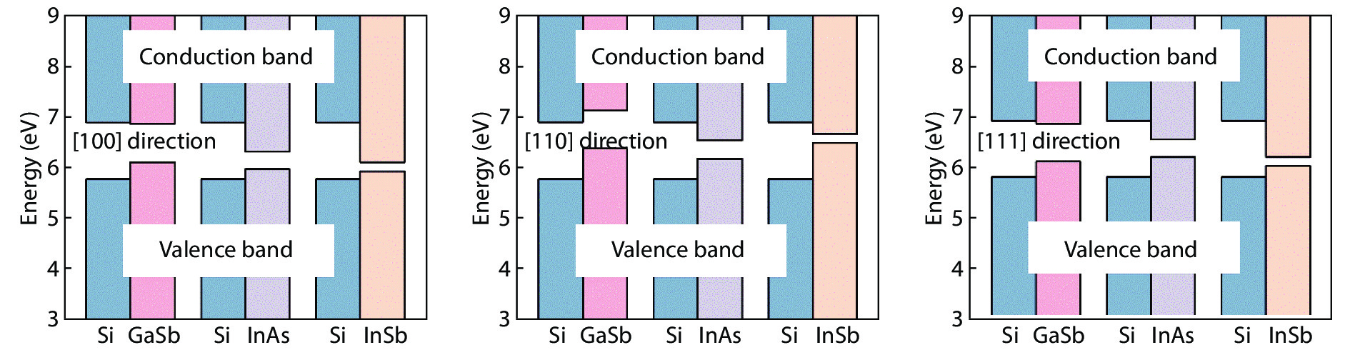 Band offset in semiconductors is a fundamental physical quantity that determines the performance of optoelectronic devices. However, the current method of calculating band offset is difficult to apply directly to the large-lattice-mismatched and heterovalent semiconductors because of the existing electric field and large strain at the interfaces. Here, we proposed a modified method to calculate band offsets for such systems, in which the core energy level shifts caused by heterovalent effects and lattice mismatch are estimated by interface reconstruction and the insertion of unidirectional strain structures as transitions, respectively. Taking the Si and III–V systems as examples, the results have the same accuracy as what is a widely used method for small-lattice-mismatched systems, and are much closer to the experimental values for the large-lattice-mismatched and heterovalent systems. Furthermore, by systematically studying the heterojunctions of Si and III–V semiconductors along different directions, it is found that the band offsets of Si/InAs and Si/InSb systems in [100], [110] and [111] directions belong to the type I, and could be beneficial for silicon-based luminescence performance. Our study offers a more reliable and direct method for calculating band offsets of large-lattice-mismatched and heterovalent semiconductors, and could provide theoretical support for the design of the high-performance silicon-based light sources.