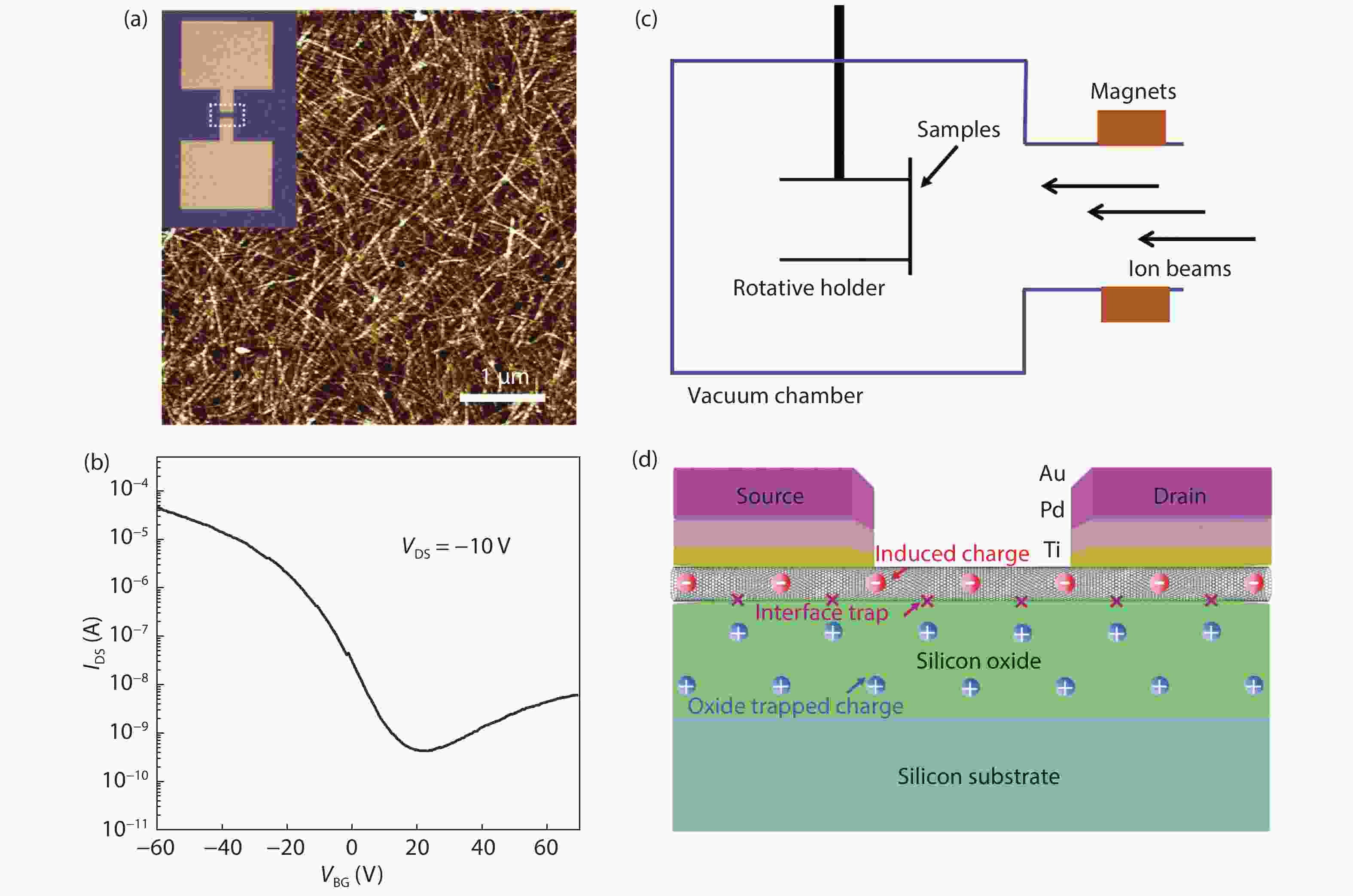 Strong C–C bonds, nanoscale cross-section and low atomic number make single-walled carbon nanotubes (SWCNTs) a potential candidate material for integrated circuits (ICs) applied in outer space. However, very little work combines the simulation calculations with the electrical measurements of SWCNT field-effect transistors (FETs), which limits further understanding on the mechanisms of radiation effects. Here, SWCNT film-based FETs were fabricated to explore the total ionizing dose (TID) and displacement damage effect on the electrical performance under low-energy proton irradiation with different fluences up to 1 × 1015 p/cm2. Large negative shift of the threshold voltage and obvious decrease of the on-state current verified the TID effect caused in the oxide layer. The stability of the subthreshold swing and the off-state current reveals that the displacement damage caused in the CNT layer is not serious, which proves that the CNT film is radiation-hardened. Specially, according to the simulation, we found the displacement damage caused by protons is different in the source/drain contact area and channel area, leading to varying degrees of change for the contact resistance and sheet resistance. Having analyzed the simulation results and electrical measurements, we explained the low-energy proton irradiation mechanism of the CNT FETs, which is essential for the construction of radiation-hardened CNT film-based ICs for aircrafts.