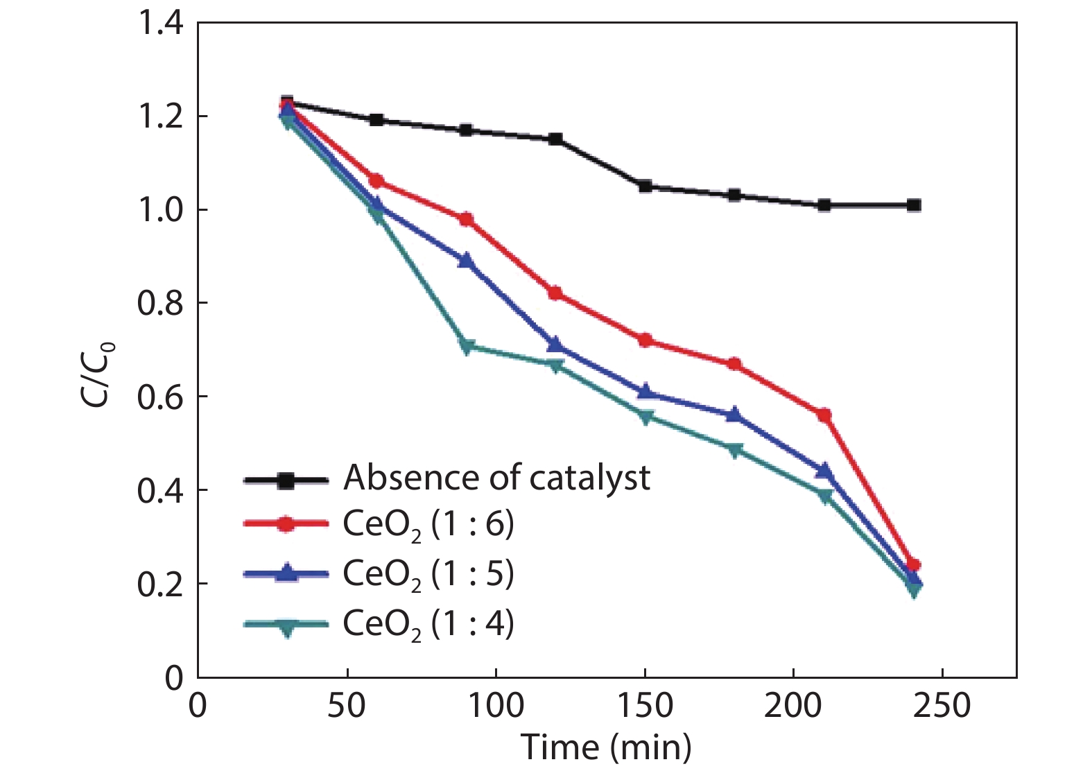 Crystalline cubic cerium oxide nano particles have been synthesized from cerium (III) nitrate (Ce (NO3)3.6H2O) and sodium hydroxide by a hydrothermal method. The effect of three different molar ratios of the NaOH precipitating agent on structural, optical, and photo catalytic activity was investigated. The synthesized cerium oxide nano particles were characterized by X-ray diffraction (XRD), a UV–vis spectrometer, scanning electron microscope (SEM), energy-dispersive X-ray spectroscopy (EDAX), Raman spectroscopy and X-ray photo electron spectroscopy (XPS). According to the findings, hydrothermally synthesized cerium oxide NPs have a high efficiency for photocatalytic degradation of methylene blue when exposed to UV light. Environmental water pollution is the major issue of the atmosphere. To get fresh water, humans could search the resources to purify the water in simple way and degradation is the one of the methods to purify salt water.