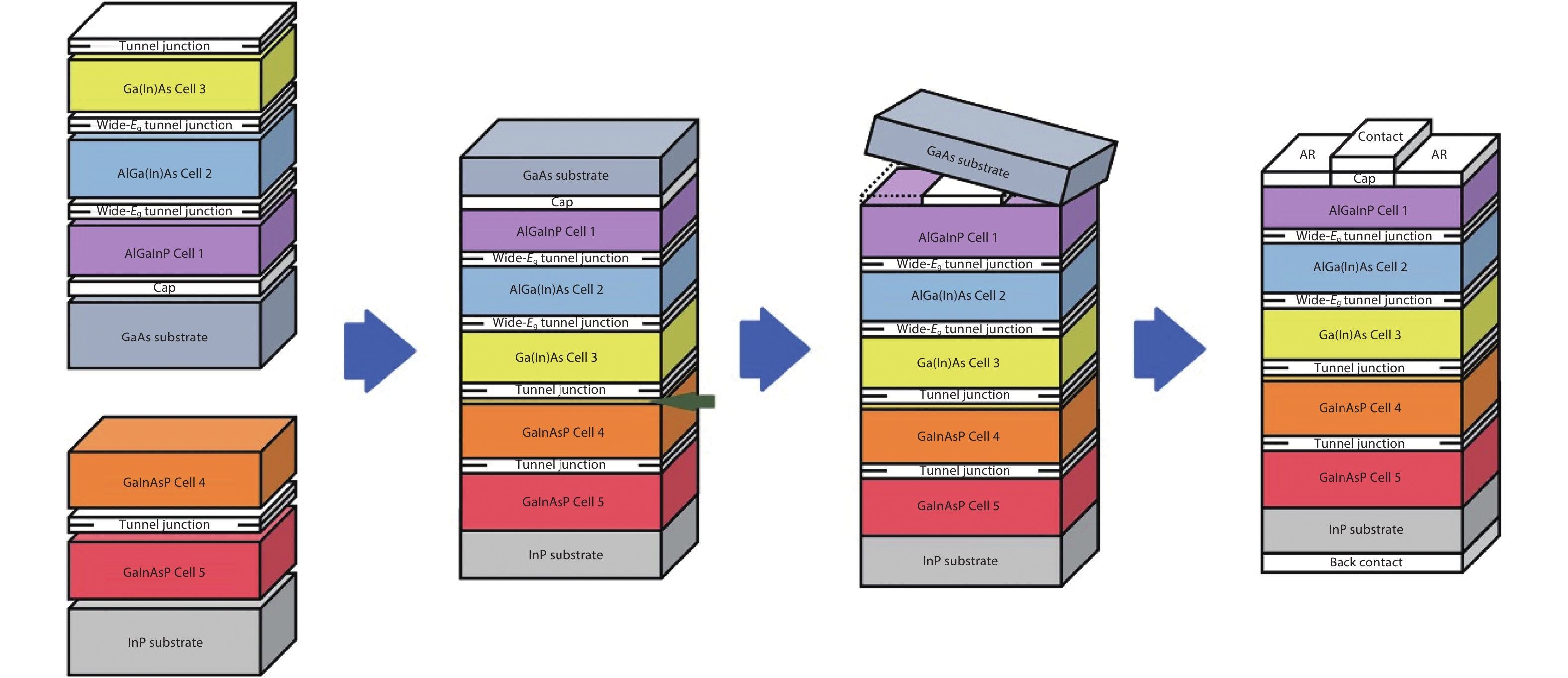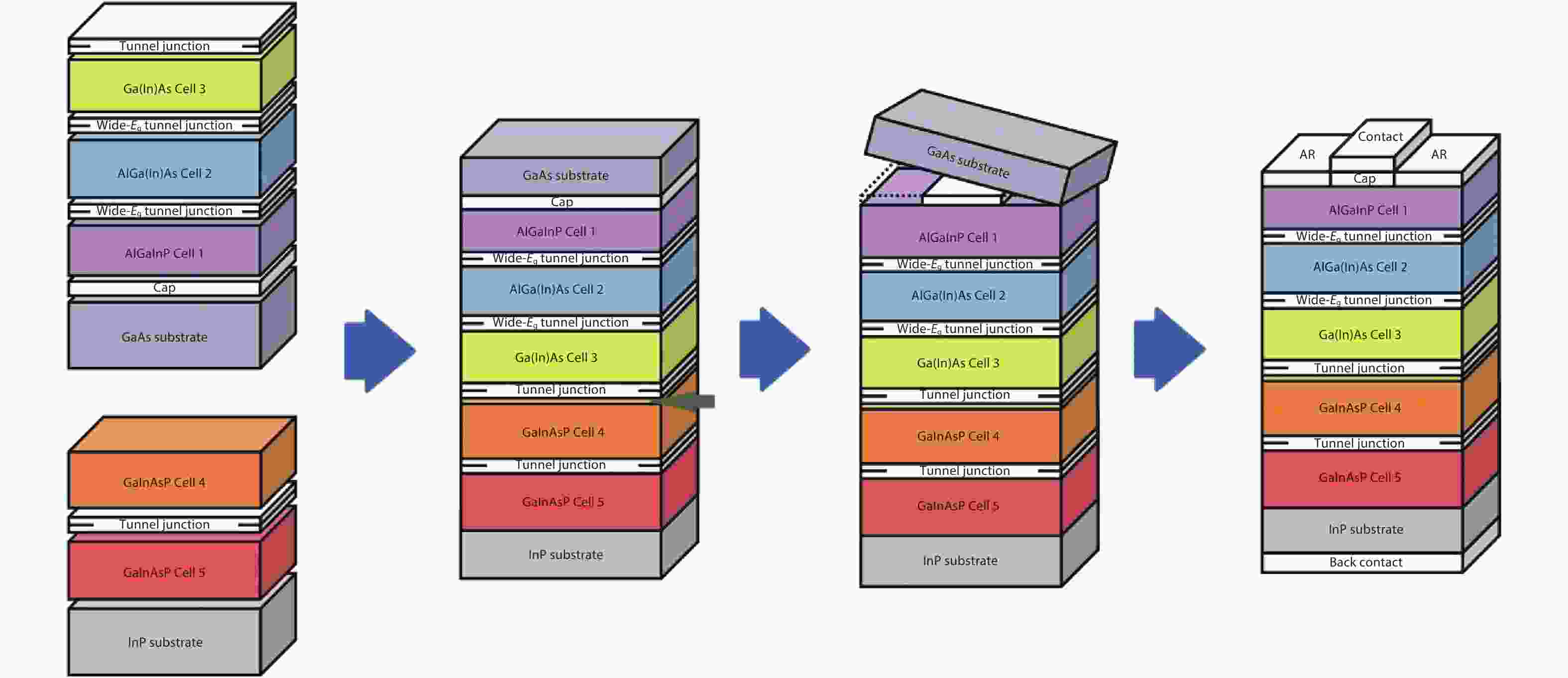 Multijunction solar cells are the highest efficiency photovoltaic devices yet demonstrated for both space and terrestrial applications. In recent years five-junction cells based on the direct semiconductor bonding technique (SBT), demonstrates space efficiencies >35% and presents application potentials. In this paper, the major challenges for fabricating SBT 5J cells and their appropriate strategies involving structure tunning, band engineering and material tailoring are stated, and 4-cm2 35.4% (AM0, one sun) 5J SBT cells are presented. Further efforts on detailed optical managements are required to improve the current generating and matching in subcells, to achieve efficiencies 36%–37%, or above.