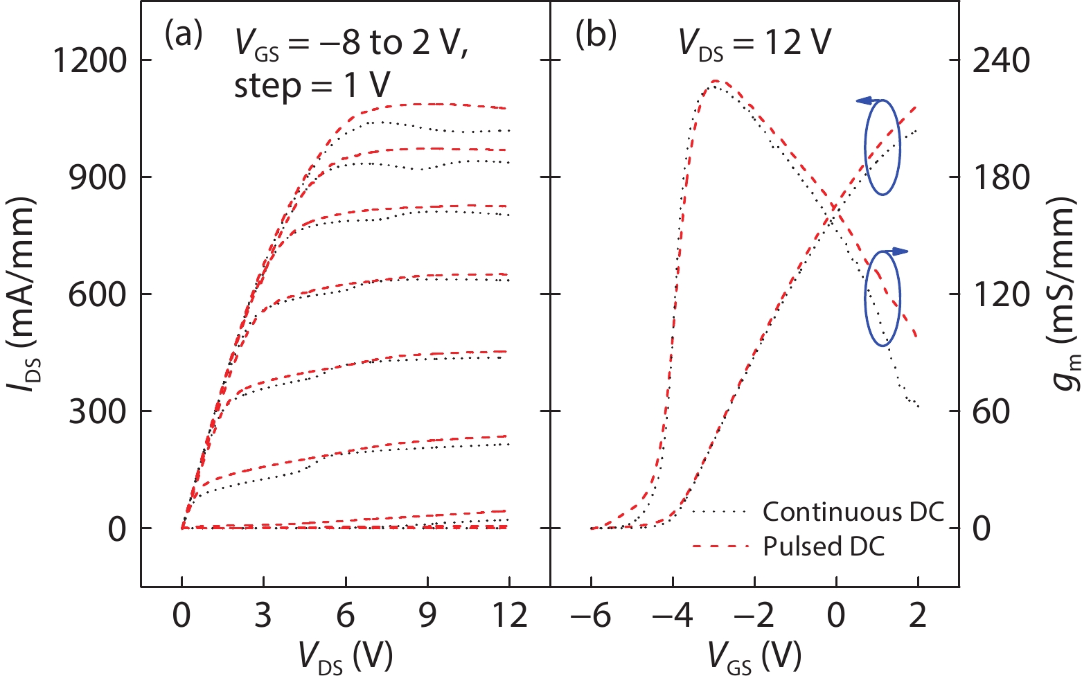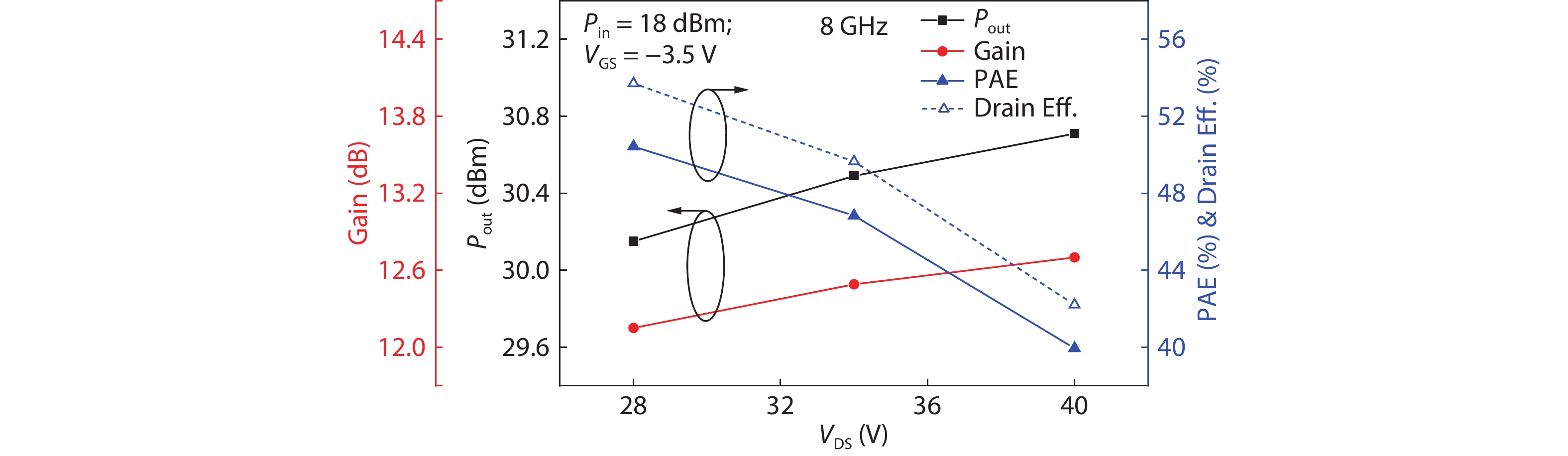 State-of-the-art AlGaN/GaN high electron mobility structures were grown on semi-insulating 4H-SiC substrates by MOCVD and X-band microwave power high electron mobility transistors were fabricated and characterized. Hall mobility of 2291.1 cm2/(V·s) and two-dimensional electron gas density of 9.954 × 1012 cm–2 were achieved at 300 K. The HEMT devices with a 0.45-μm gate length exhibited maximum drain current density as high as 1039.6 mA/mm and peak extrinsic transconductance of 229.7 mS/mm. The fT of 30.89 GHz and fmax of 38.71 GHz were measured on the device. Load-pull measurements were performed and analyzed under (–3.5, 28) V, (–3.5, 34) V and (–3.5, 40) V gate/drain direct current bias in class-AB, respectively. The uncooled device showed high linear power gain of 17.04 dB and high power-added efficiency of 50.56% at 8 GHz when drain biased at (–3.5, 28) V. In addition, when drain biased at (–3.5, 40) V, the device exhibited a saturation output power density up to 6.21 W/mm at 8 GHz, with a power gain of 11.94 dB and a power-added efficiency of 39.56%. Furthermore, the low fmax/fT ratio and the variation of the power sweep of the device at 8 GHz with drain bias voltage were analyzed.