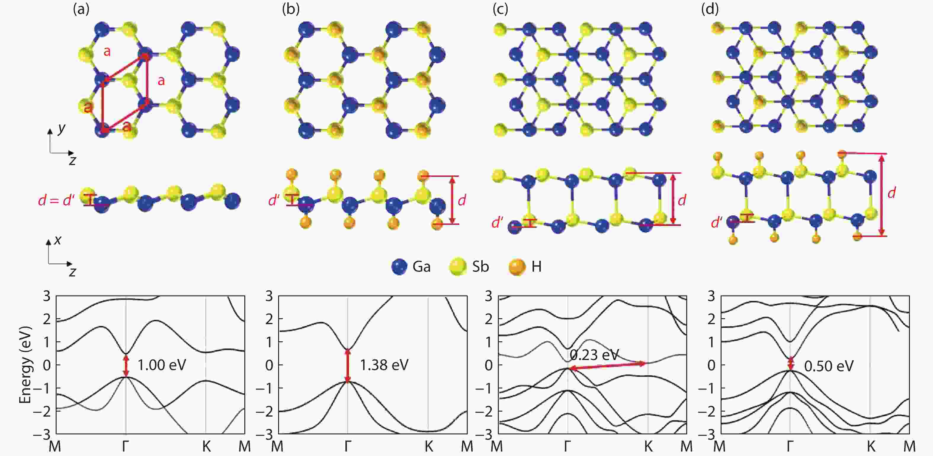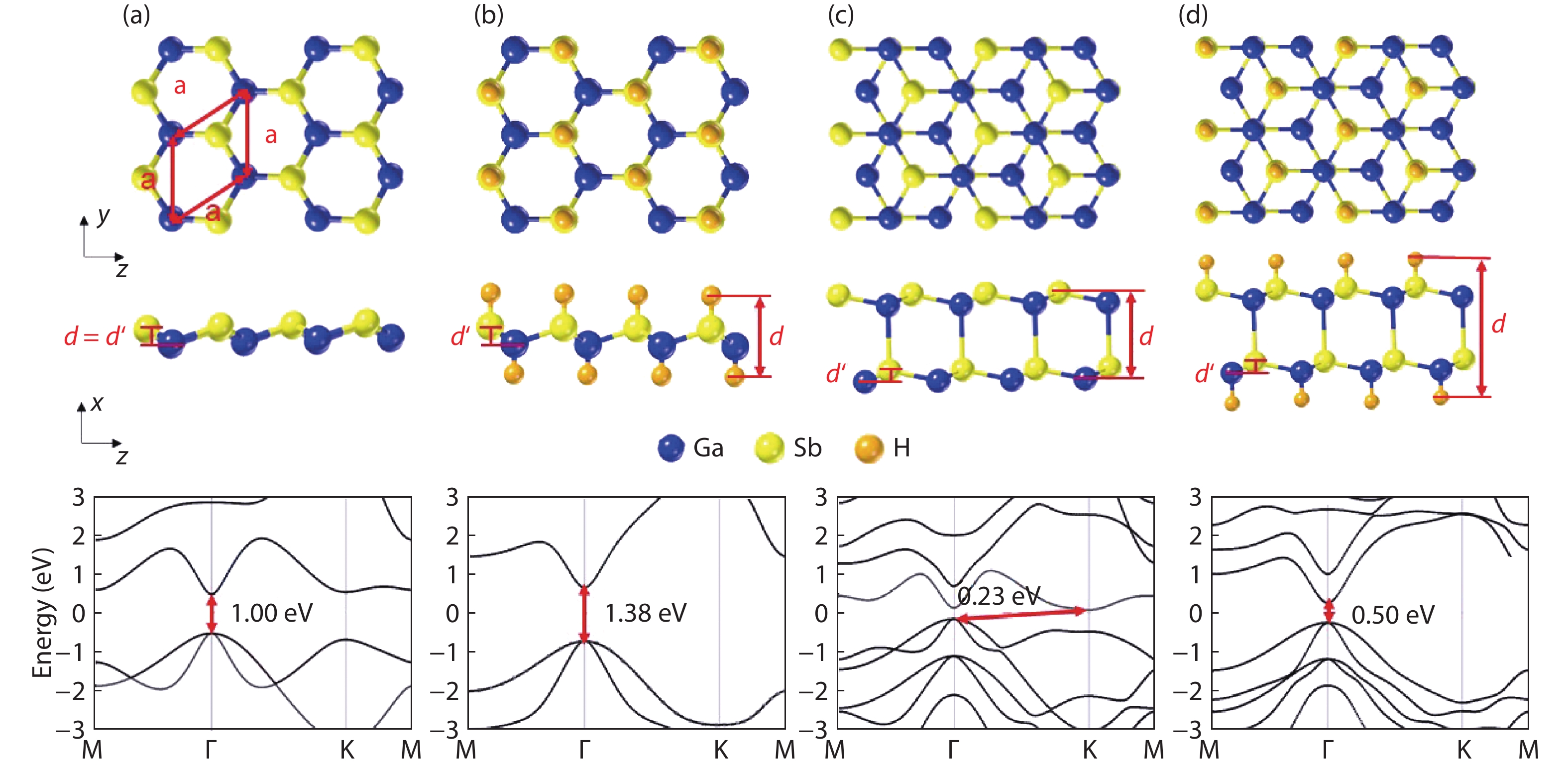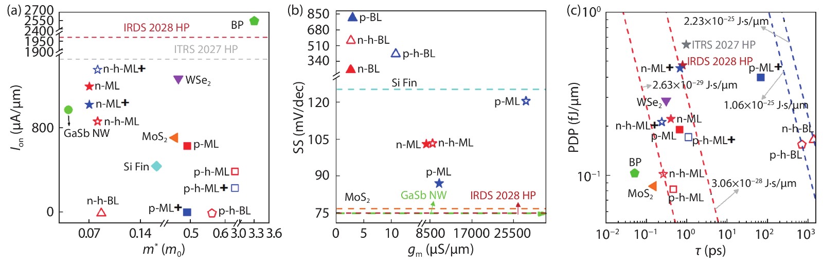 Owing to the high carrier mobility, two-dimensional (2D) gallium antimonite (GaSb) is a promising channel material for field-effect transistors (FETs) in the post-silicon era. We investigated the ballistic performance of the 2D GaSb metal–oxide–semiconductor FETs with a 10 nm-gate-length by the ab initio quantum transport simulation. Because of the wider bandgap and better gate-control ability, the performance of the 10-nm monolayer (ML) GaSb FETs is generally superior to the bilayer counterparts, including the three-to-four orders of magnitude larger on-current. Via hydrogenation, the delay-time and power consumption can be further enhanced with magnitude up to 35% and 57%, respectively, thanks to the expanded bandgap. The 10-nm ML GaSb FETs can almost meet the International Technology Roadmap for Semiconductors (ITRS) for high-performance demands in terms of the on-state current, intrinsic delay time, and power-delay product.