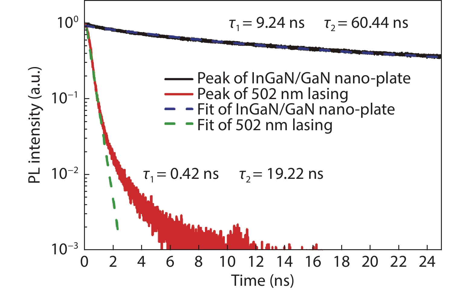 Plasmonic nanolaser as a new type of ultra-small laser, has gain wide interests due to its breaking diffraction limit of light and fast carrier dynamics characters. Normally, the main problem that need to be solved for plasmonic nanolaser is high loss induced by optical and ohmic losses, which leads to the low quality factor. In this work, InGaN/GaN nanoplate plasmonic nanolaser with large interface area were designed and fabricated, where the overlap between SPs and excitons can be enhanced. The lasing threshold is calculated to be ~6.36 kW/cm2, where the full width at half maximum (FWHM) drops from 27 to 4 nm. And the fast decay time at 502 nm (sharp peak of stimulated lasing) is estimated to be 0.42 ns. Enhanced lasing characters are mainly attributed to the strong confinement of electromagnetic wave in the low refractive index material, which improve the near field coupling between SPs and excitons. Such plasmonic laser should be useful in data storage applications, biological application, light communication, especially for optoelectronic devices integrated into a system on a chip.