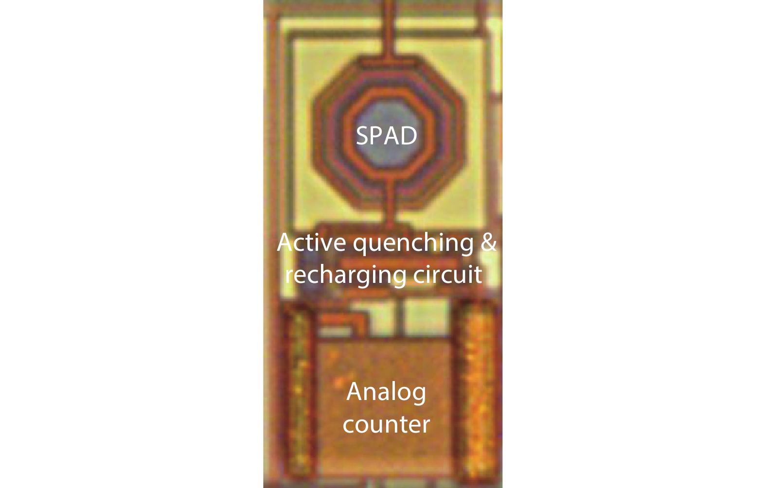 A compact pixel for single-photon detection in the analog domain is presented. The pixel integrates a single-photon avalanche diode (SPAD), a passive quenching & active recharging circuit (PQARC), and an analog counter for fast and accurate sensing and counting of photons. Fabricated in a standard 0.18 μm CMOS technology, the simulated and experimental results reveal that the dead time of the PQARC is about 8 ns and the maximum photon-counting rate can reach 125 Mcps (counting per second). The analog counter can achieve an 8-bit counting range with a voltage step of 6.9 mV. The differential nonlinearity (DNL) and integral nonlinearity (INL) of the analog counter are within the ± 0.6 and ± 1.2 LSB, respectively, indicating high linearity of photon counting. Due to its simple circuit structure and compact layout configuration, the total area occupation of the presented pixel is about 1500 μm2, leading to a high fill factor of 9.2%. The presented in-pixel front-end circuit is very suitable for the high-density array integration of SPAD sensors.
