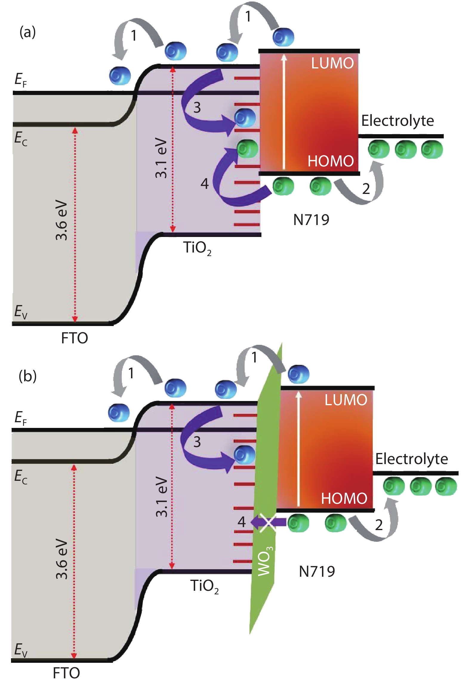 Major loss factors for photo-generated electrons due to the presence of surface defects in titanium dioxide (TiO2) were controlled by RF-sputtered tungsten trioxide (WO3) passivation. X-ray photoelectron spectroscopy assured the coating of WO3 on the TiO2 nanoparticle layer by showing Ti 2p, W 4f and O 1s characteristic peaks and were further confirmed by X-ray diffraction studies. The coating of WO3 on the TiO2 nanoparticle layer did not affect dye adsorption significantly. Dye sensitized solar cells (DSSCs) fabricated using WO3-coated TiO2 showed an enhancement of ~10% compared to DSSCs fabricated using pristine TiO2-based photo-electrodes. It is attributed to the WO3 passivation on TiO2 that creates an energy barrier which favored photo-electron injection by tunneling but blocked reverse electron recombination pathways towards holes available in highest occupied molecular orbital of the dye molecules. It was further evidenced that there is an optimum thickness (duration of coating) of WO3 to improve the DSSC performance and longer duration of WO3 suppressed photo-electron injection from dye to TiO2 as inferred from the detrimental effect in short circuit current density values. RF-sputtering yields pinhole-free, highly uniform and conformal coating of WO3 onto any area of interest, which can be considered for an effective surface passivation for nanostructured photovoltaic devices.