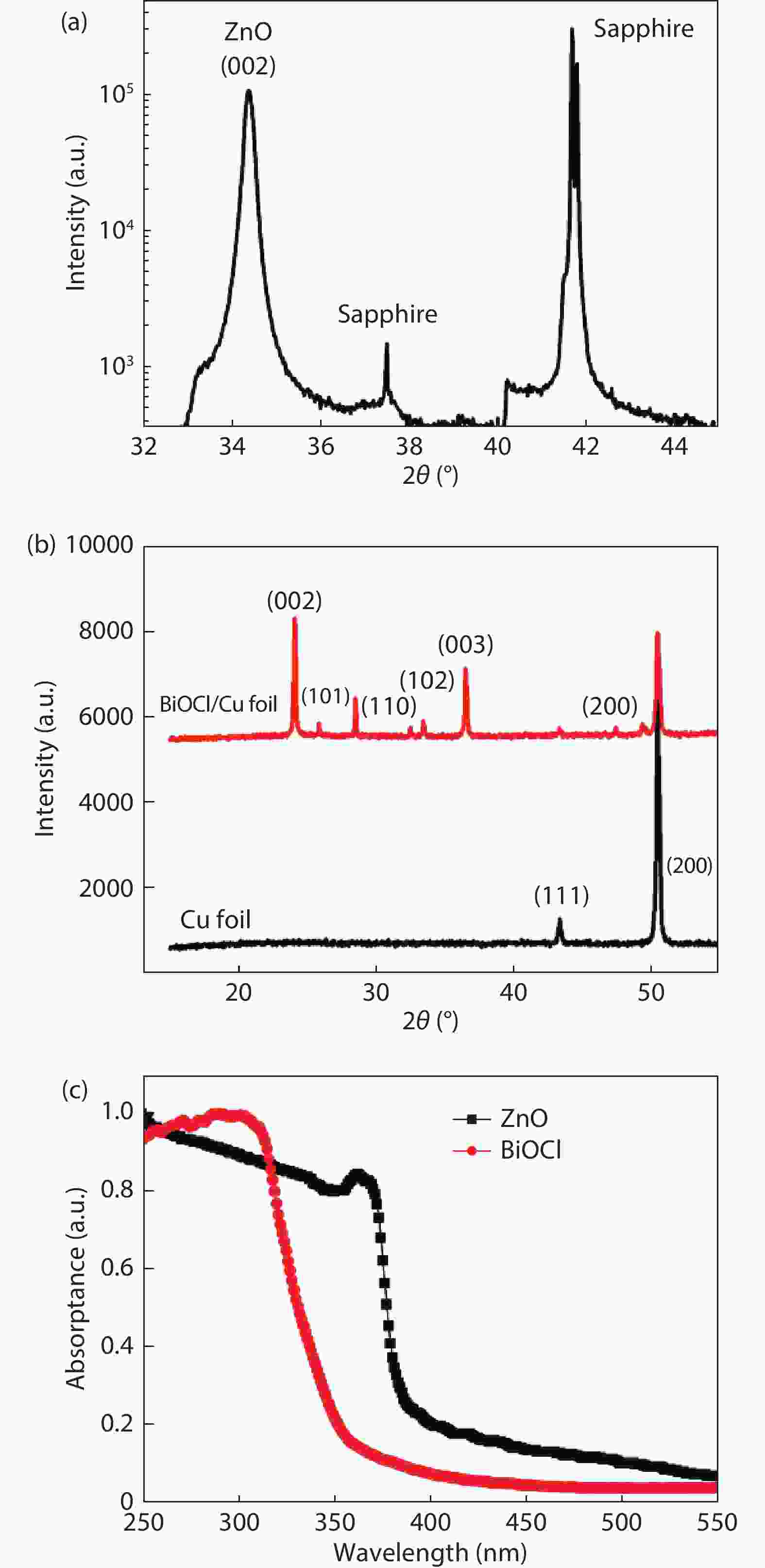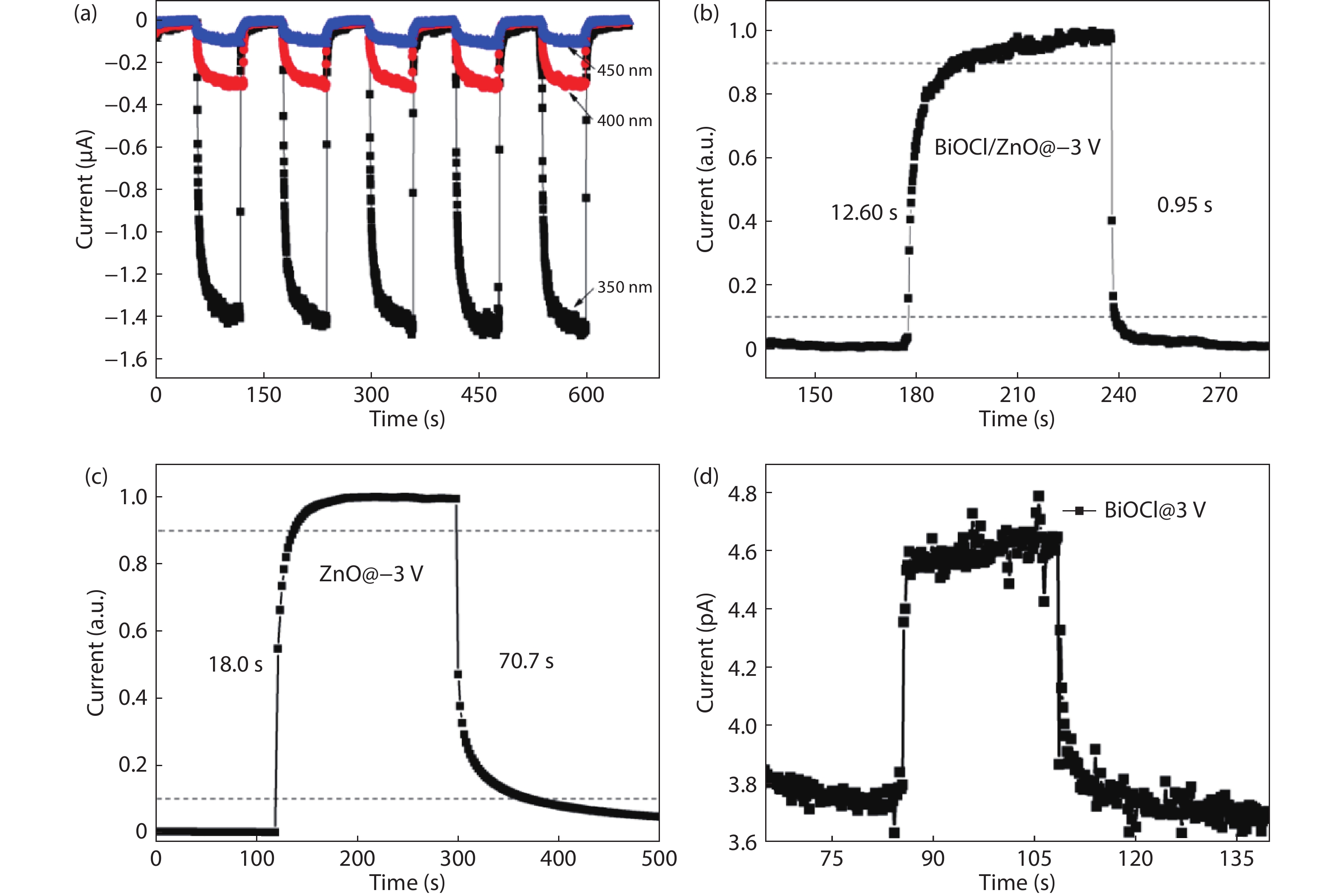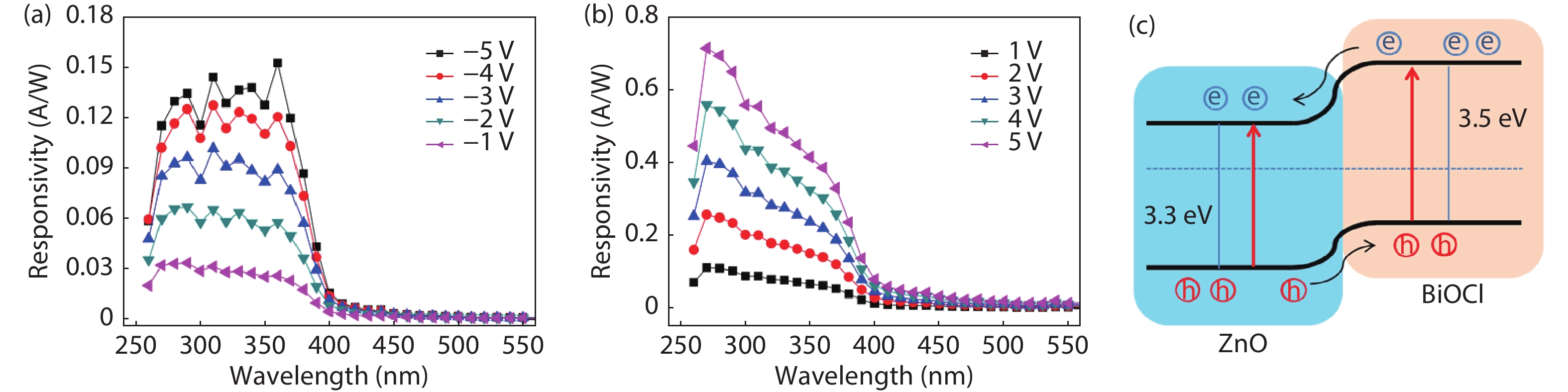 Herein, high-quality n-ZnO film layer on c-sapphire and well-crystallized tetragonal p-BiOCl nanoflakes on Cu foil are prepared, respectively. According to the absorption spectra, the bandgaps of n-ZnO and p-BiOCl are confirmed as ~3.3 and ~3.5 eV, respectively. Subsequently, a p-BiOCl/n-ZnO heterostructural photodetector is constructed after a facile mechanical bonding and post annealing process. At –5 V bias, the photocurrent of the device under 350 nm irradiation is ~800 times higher than that in dark, which indicates its strong UV light response characteristic. However, the on/off ratio of In–ZnO–In photodetector is ~20 and the Cu–BiOCl–Cu photodetector depicts very weak UV light response. The heterostructure device also shows a short decay time of 0.95 s, which is much shorter than those of the devices fabricated from pure ZnO thin film and BiOCl nanoflakes. The p-BiOCl/n-ZnO heterojunction photodetector provides a promising pathway to multifunctional UV photodetectors with fast response, high signal-to-noise ratio, and high selectivity.
