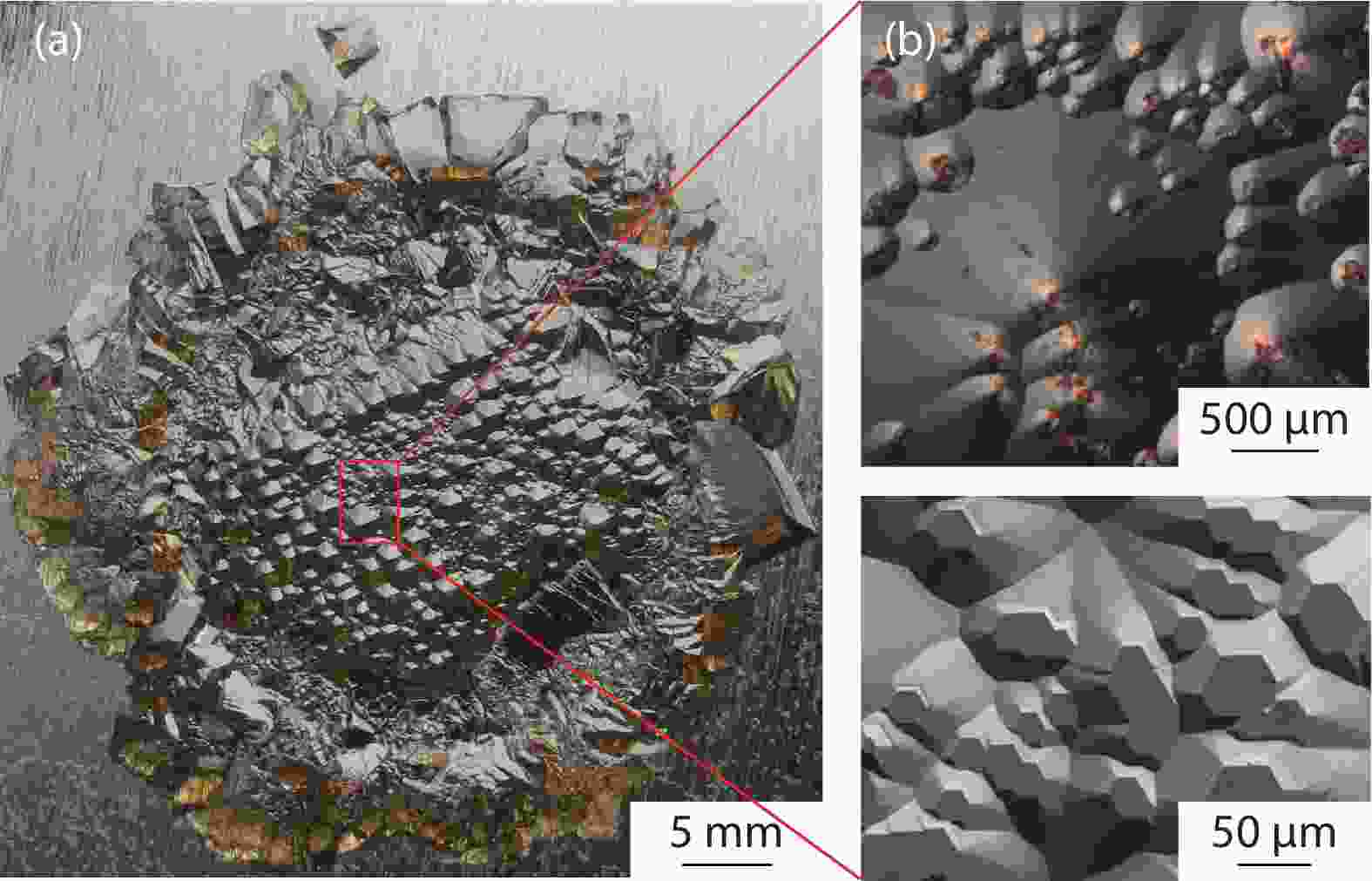 AlN single crystal grown by physical vapor transport (PVT) using homogeneous seed is considered as the most promising approach to obtain high-quality AlN boule. In this work, the morphology of AlN single crystals grown under different modes (3D islands and single spiral center) were investigated. It is proved that, within an optimized thermal distribution chamber system, the surface temperature of AlN seed plays an important role in crystal growth, revealing a direct relationship between growth mode and growth condition. Notably, a high-quality AlN crystal, with (002) and (102) reflection peaks of 65 and 36 arcsec at full width at half maximum (FWHM), was obtained grown under a single spiral center mode. And on which, a high-quality AlxGa1–xN epitaxial layer with high Al content (x = 0.54) was also obtained. The FWHMs of (002) and (102) reflection of AlxGa1–xN were 202 and 496 arcsec, respectively, which shows superiority over their counterpart grown on SiC or a sapphire substrate.