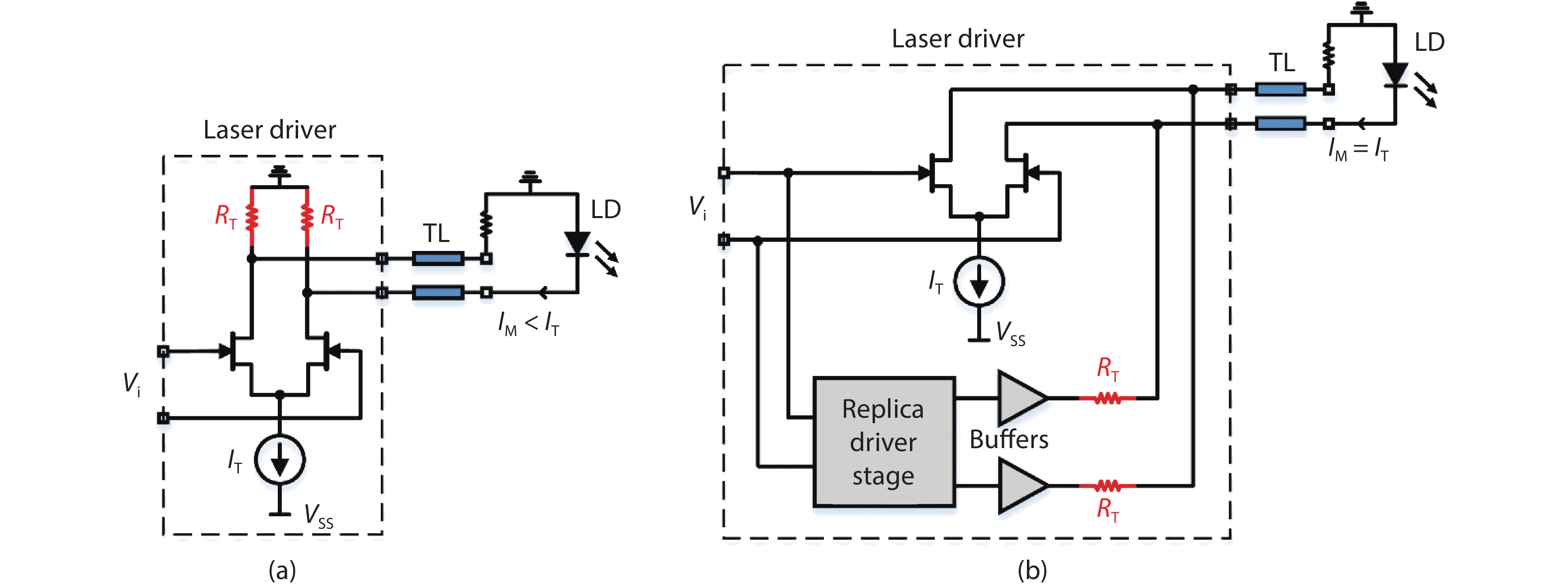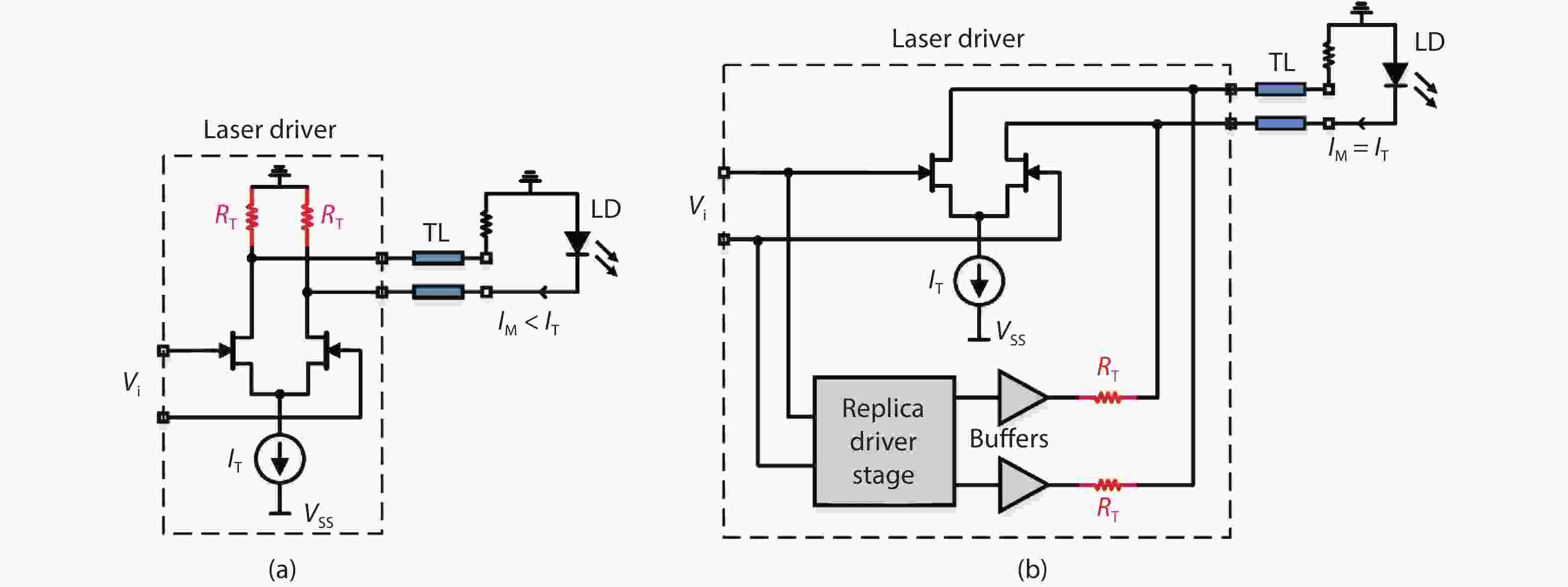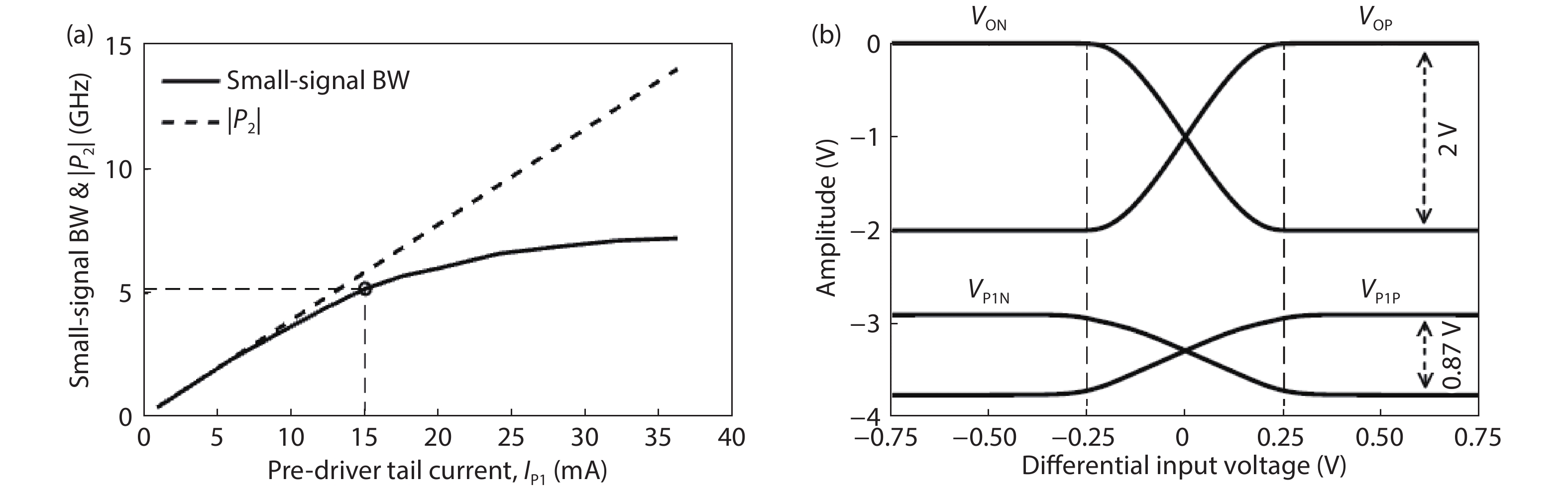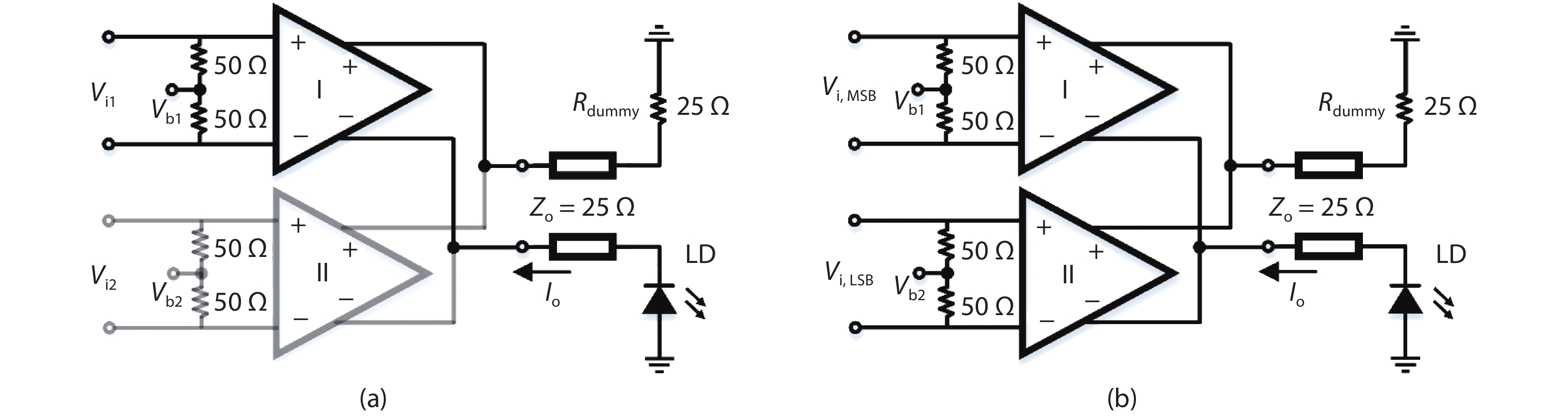 This paper presents the design and testing of a 15 Gbps non-return-to-zero (NRZ), 30 Gbps 4-level pulse amplitude modulation (PAM4) configurable laser diode driver (LDD) implemented in 0.15-μm GaAs E-mode pHEMT technology. The driver bandwidth is enhanced by utilizing cross-coupled neutralization capacitors across the output stage. The output transmission-line back-termination, which absorbs signal reflections from the imperfectly matched load, is performed passively with on-chip 50-? resistors. The proposed 30 Gbps PAM4 LDD is implemented by combining two 15 Gbps-NRZ LDDs, as the high and low amplification paths, to generate PAM4 output current signal with levels of 0, 40, 80, and 120 mA when driving 25-? lasers. The high and low amplification paths can be used separately or simultaneously as a 15 Gbps-NRZ LDD. The measurement results show clear output eye diagrams at speeds of up to 15 and 30 Gbps for the NRZ and PAM4 drivers, respectively. At a maximum output current of 120 mA, the driver consumes 1.228 W from a single supply voltage of –5.2 V. The proposed driver shows a high current driving capability with a better output power to power dissipation ratio, which makes it suitable for driving high current distributed feedback (DFB) lasers. The chip occupies a total area of 0.7 × 1.3 mm2.