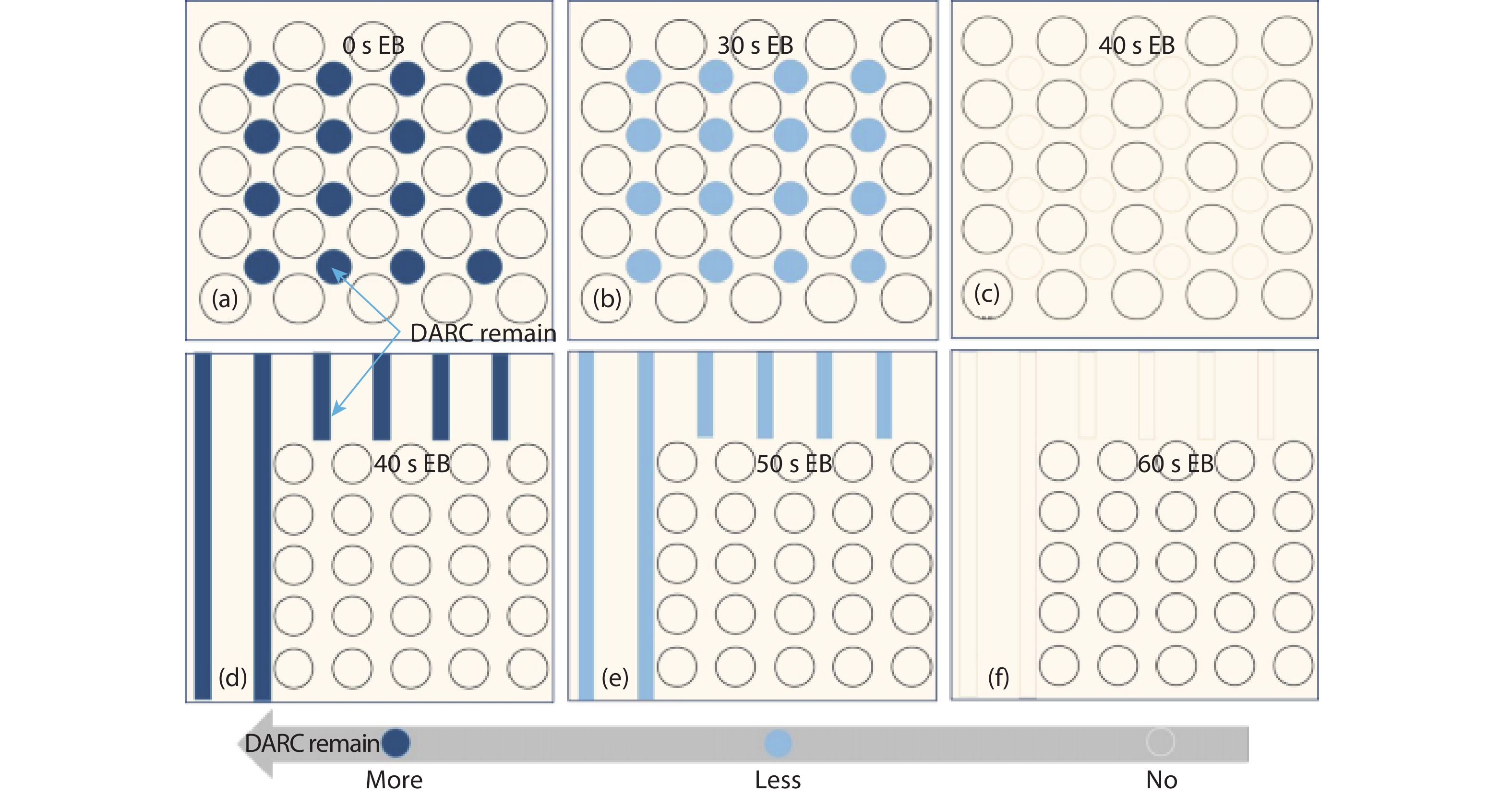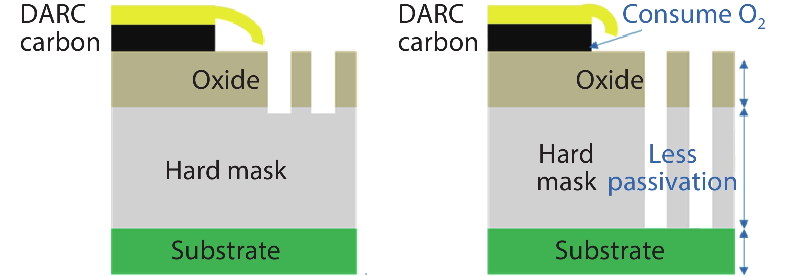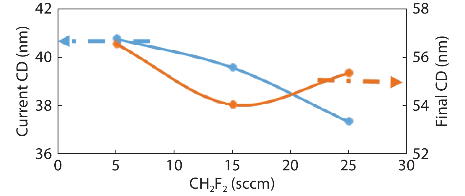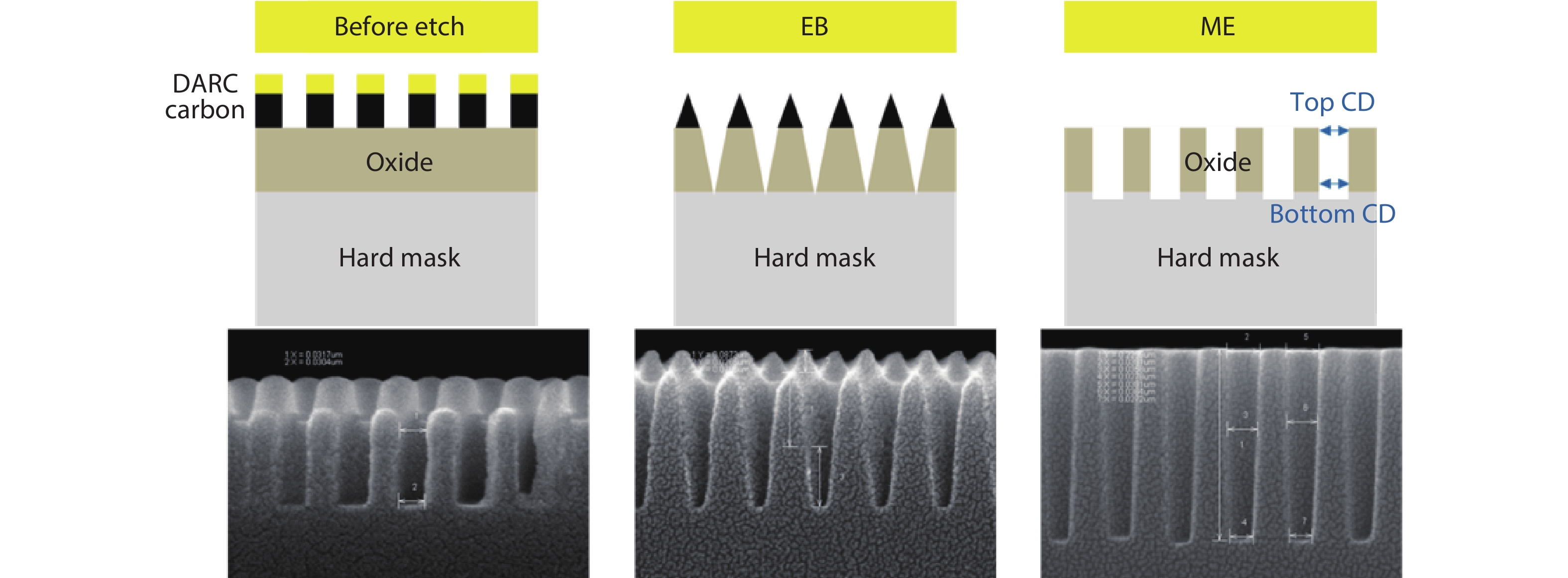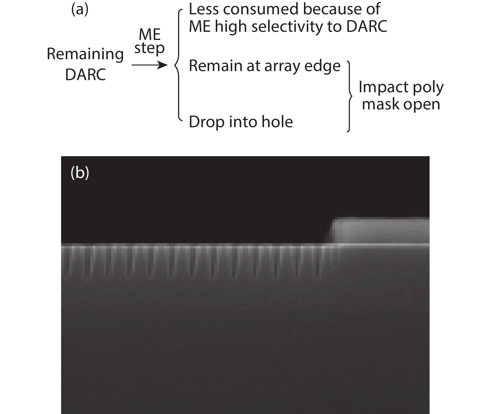 Opening the silicon oxide mask of a capacitor in dynamic random access memory is a critical process on a capacitive coupled plasma (CCP) etch tool. Three steps, dielectric anti-reflective coating (DARC) etch back, silicon oxide etch and strip, are contained. To acquire good performance, such as low leakage current and high capacitance, for further fabricating capacitors, we should firstly optimize DARC etch back. We developed some experiments, focusing on etch time and chemistry, to evaluate the profile of a silicon oxide mask, DARC remain and critical dimension. The result shows that etch back time should be controlled in the range from 50 to 60 s, based on the current equipment and condition. It will make B/T ratio higher than 70% meanwhile resolve the DARC remain issue. We also found that CH2F2 flow should be ~15 sccm to avoid reversed CD trend and keep inline CD.