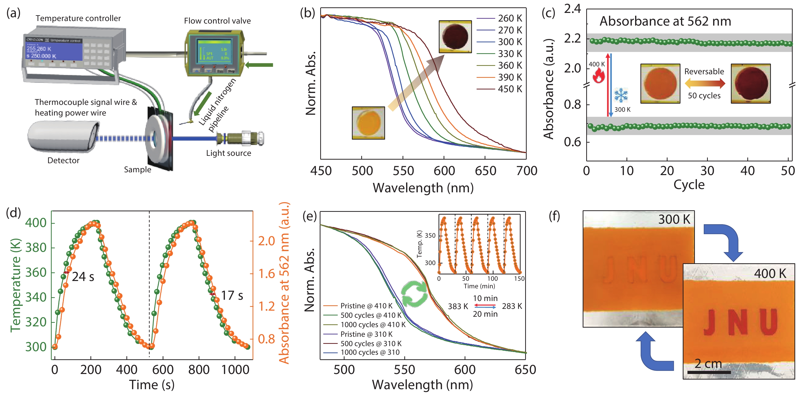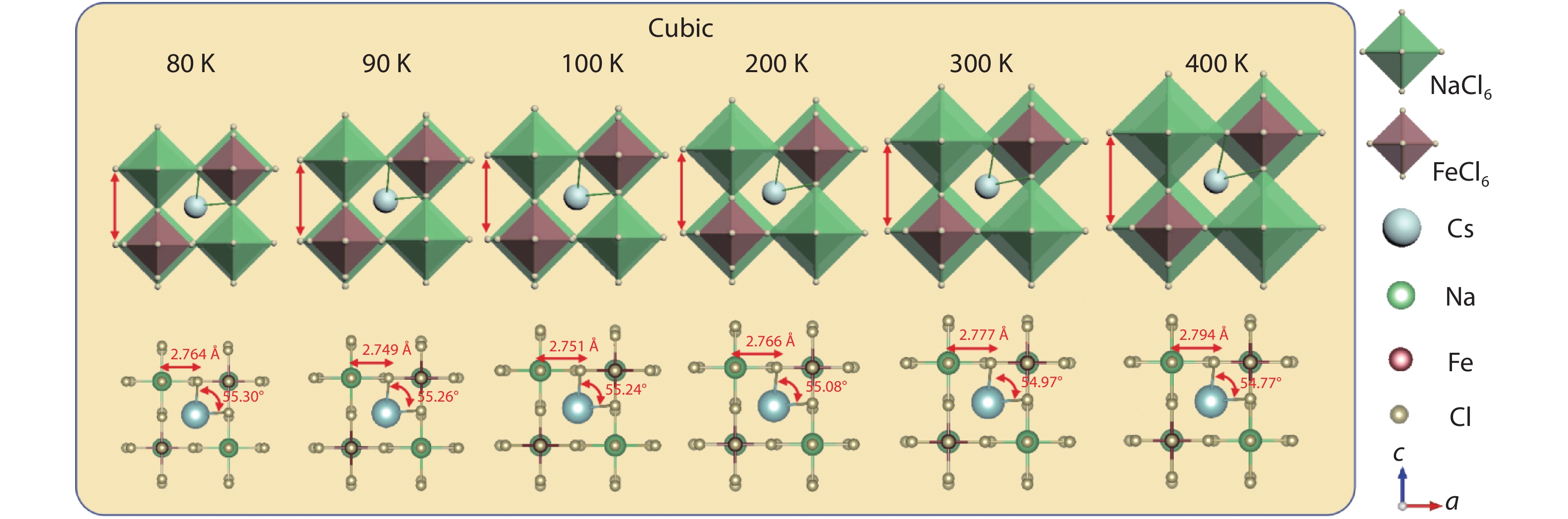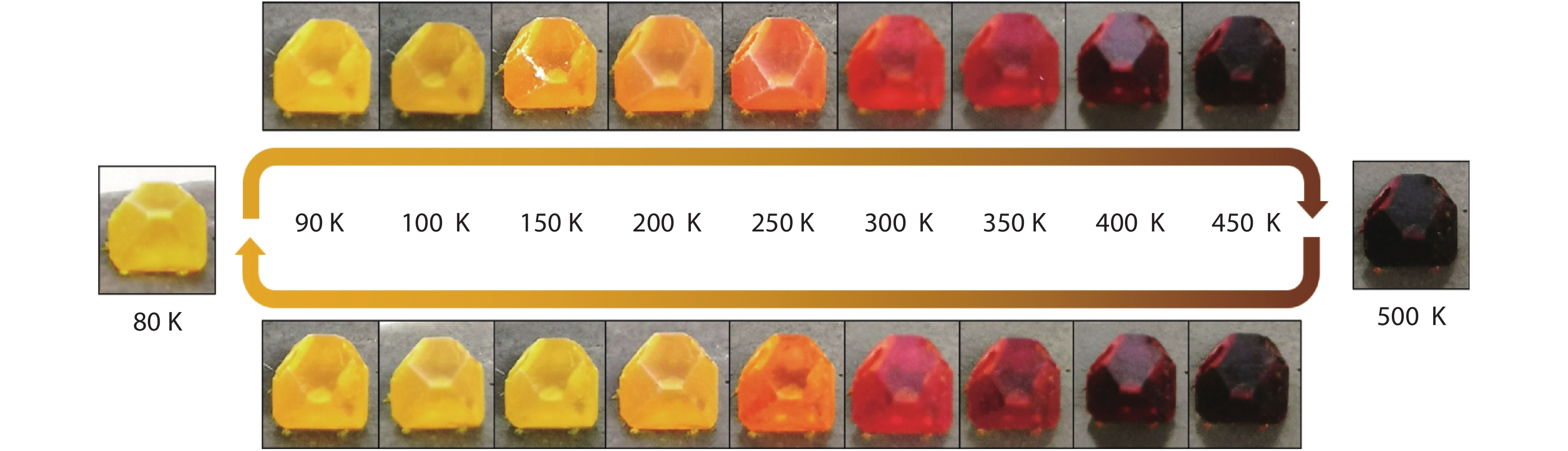 Multifunctional lead-free double perovskites demonstrate remarkable potential towards applications in various fields. Herein, an environmentally-friendly, low-cost, high-throughput Cs2NaFeCl6 single crystal with exceedingly high thermal stability is designed and grown. It obtains a cubic lattice system in the temperature range of 80–500 K, accompanied by a completely reversible chromatic variation ranging from yellow to black. Importantly, the intriguing thermochromism is proved to own extremely high reproducibility (over 1000 cycles) without a hysteretic effect, originating from its structural flexibility that including (i) the noteworthy distortion/deformation of [NaCl6]5? and [FeCl6]3? octahedra; (ii) order–disorder arrangement transition of [NaCl6]5? and [FeCl6]3? octahedra as the function of temperature. This study paves the way towards a new class of smart windows and camouflage coatings with an unprecedented colour range based on a Cs2NaFeCl6 perovskite.