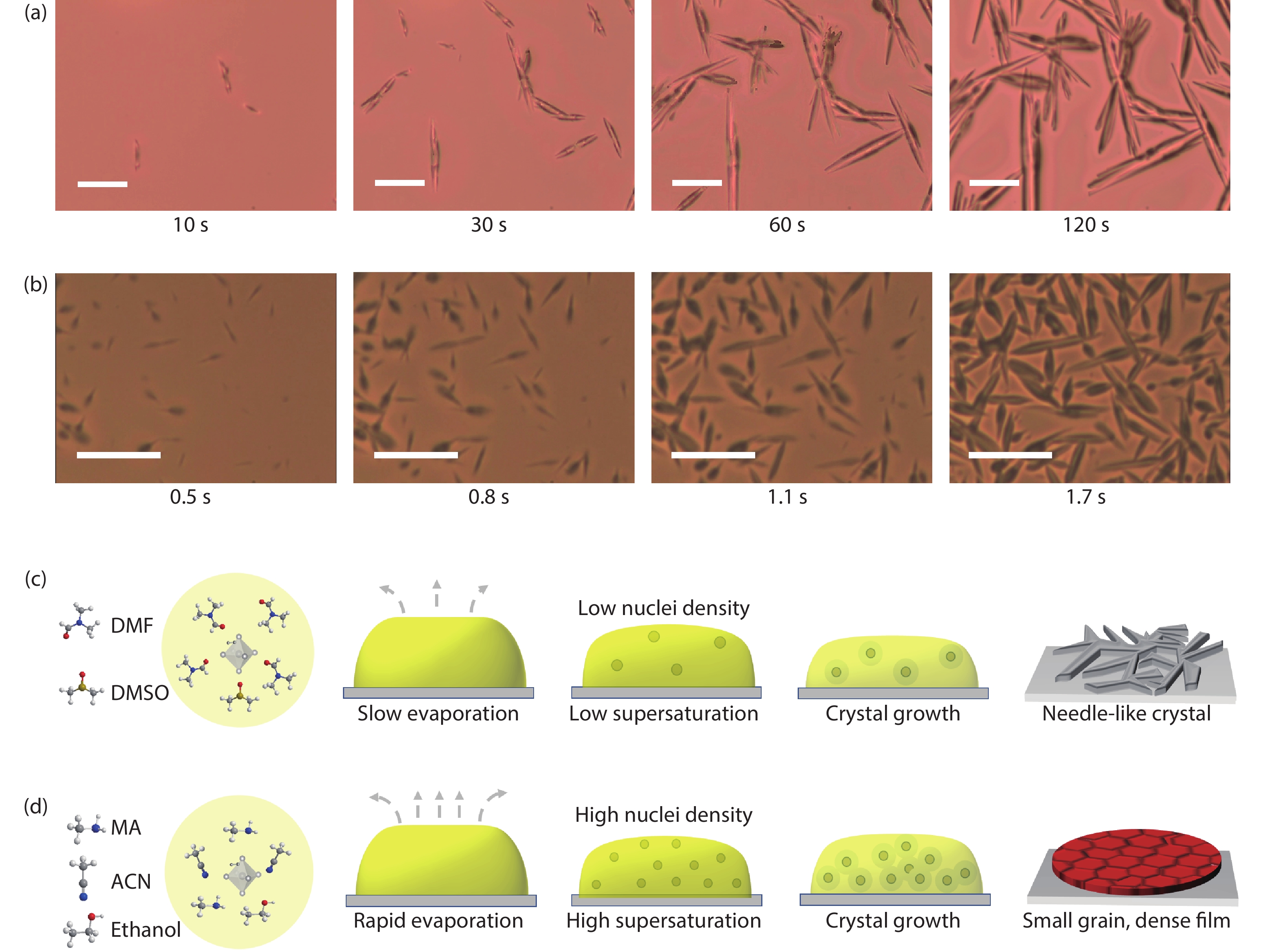 Here we demonstrate a room-temperature drop-coating method for MAPbI3 films. By using low-boiling-point solvent, high-quality MAPbI3 films were made by simply casting a drop of solution onto the substrate at room temperature. This approach took advantage of the synergistic effect of good wettability and volatility of the solvent, enabling high nuclei density and compact film at room temperature. The crystal growth in different solvents was in-situ observed by using optical microscope, which helped us to understand the mechanism for the formation of different film morphology. Perovskite solar cells gave a PCE of 18.21%.