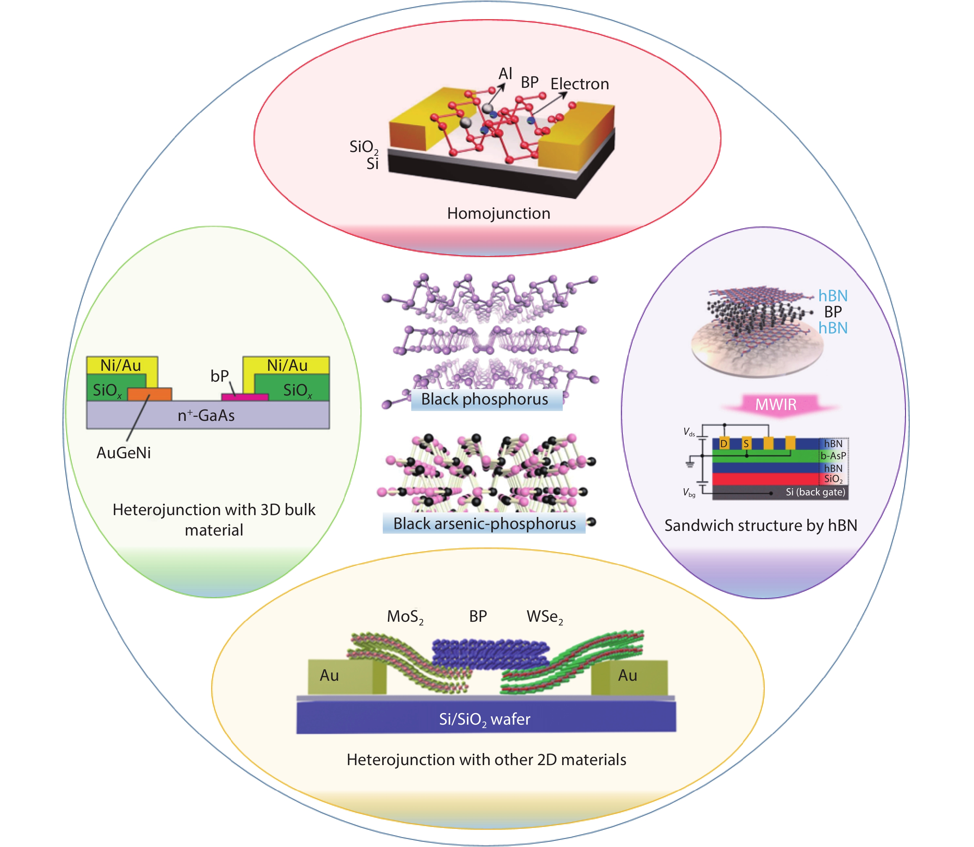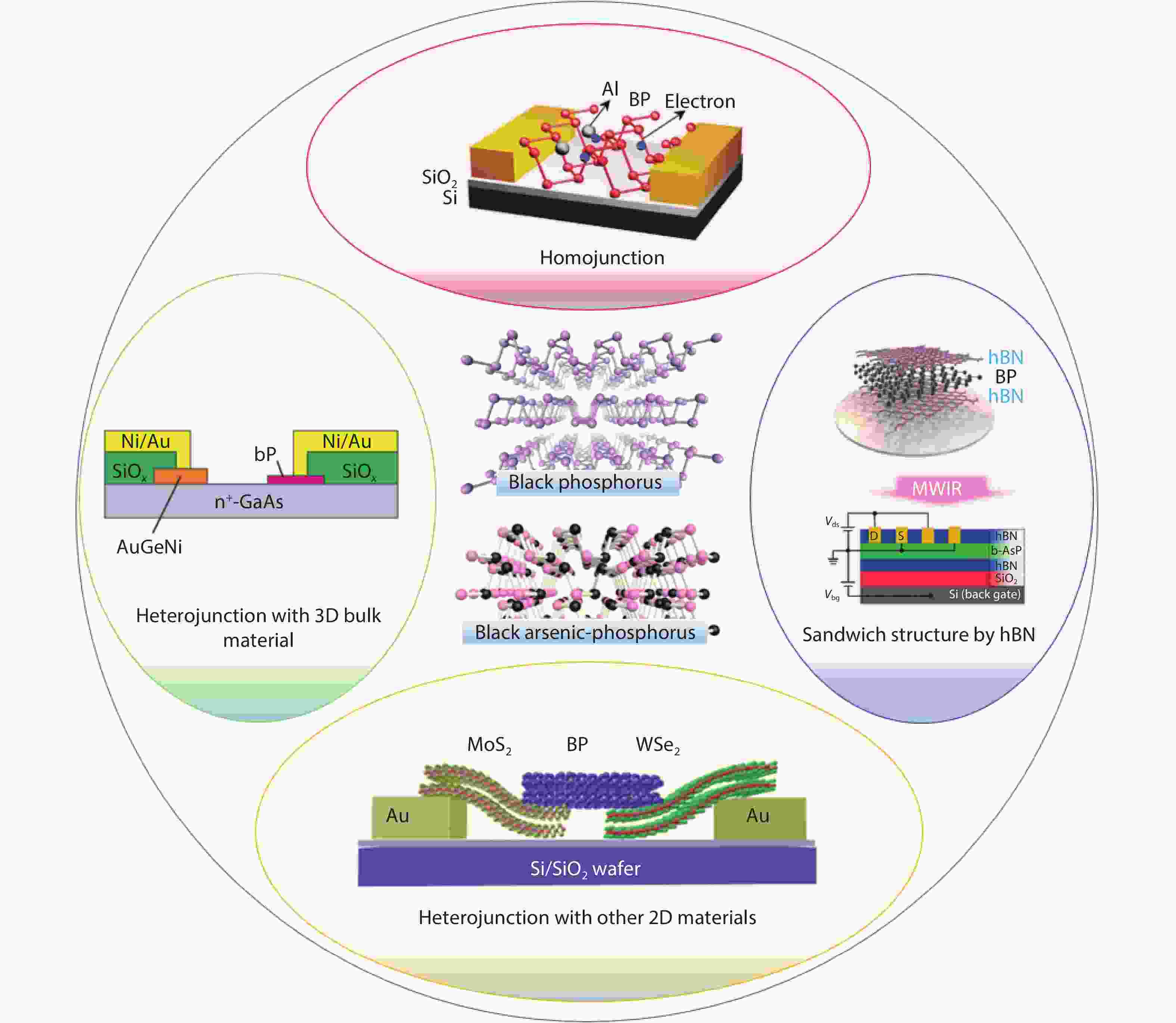 Black phosphorus (BP), an emerging two-dimensional material, is considered a promising candidate for next-generation electronic and optoelectronic devices due to in-plane anisotropy, high mobility, and direct bandgap. However, BP devices face challenges due to their limited stability, photo-response speed, and detection range. To enhance BP with powerful electrical and optical performance, the BP heterostructures can be created. In this review, the state-of-the-art heterostructures and their electrical and optoelectronic applications based on black phosphorus are discussed. Five parts introduce the performance of BP-based devices, including black phosphorus sandwich structure by hBN with better stability and higher mobility, black phosphorus homojunction by dual-gate structure for optical applications, black phosphorus heterojunction with other 2D materials for faster photo-detection, black phosphorus heterojunction integration with 3D bulk material, and BP via As-doping tunable bandgap enabling photo-detection up to 8.2 μm. Finally, we discuss the challenges and prospects for BP electrical and optical devices and applications.