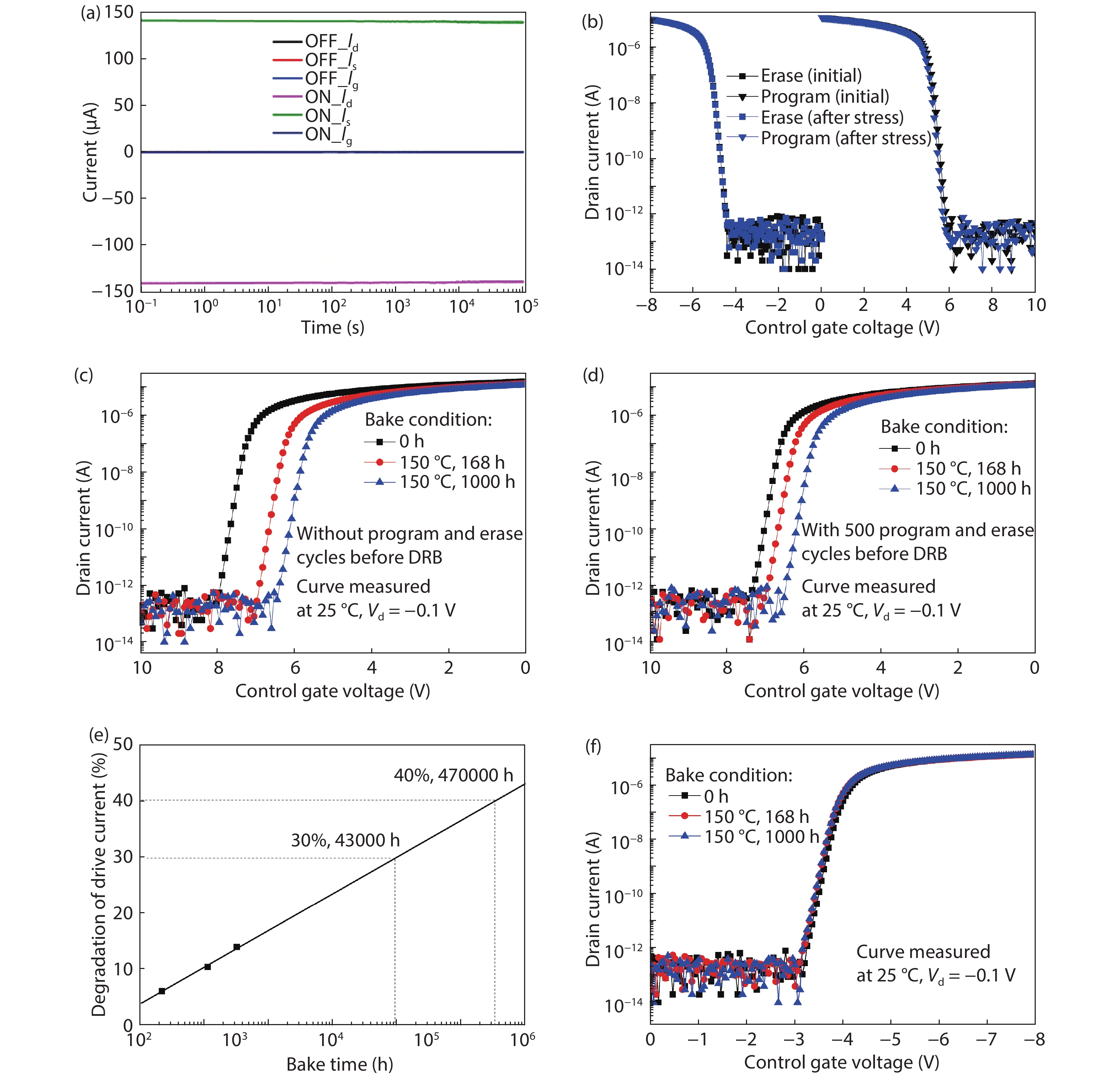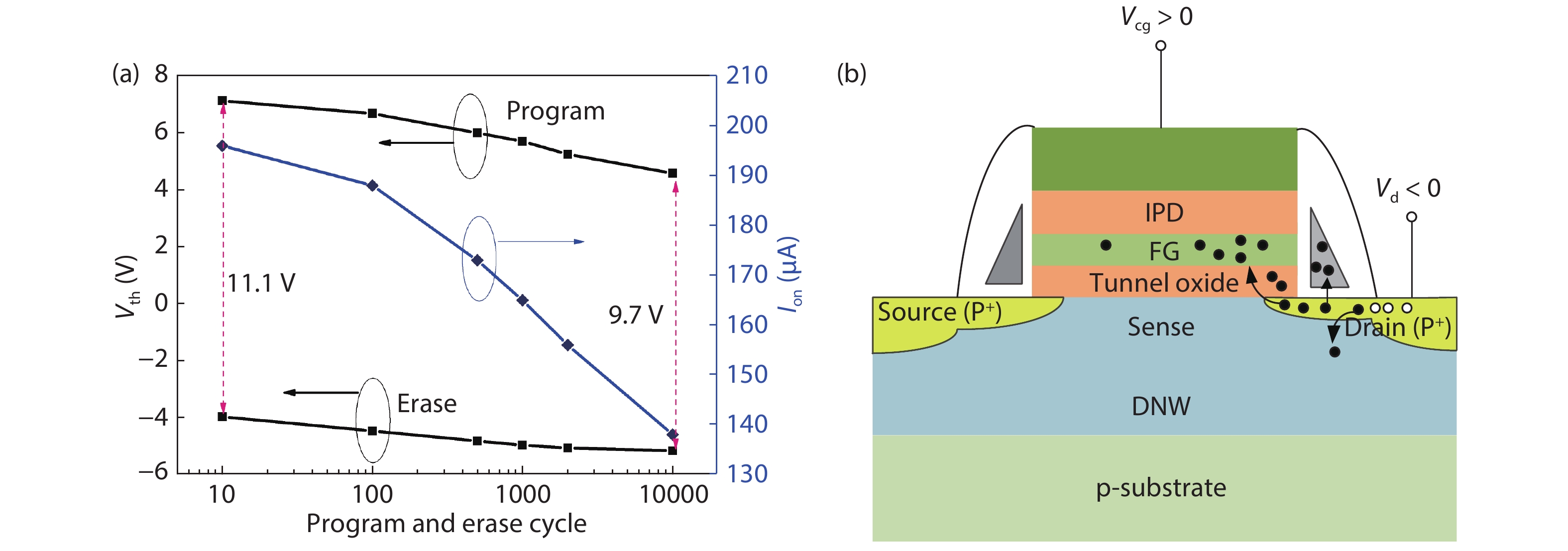 In this paper, the reliability of sense-switch p-channel flash is evaluated extensively. The endurance result indicates that the p-channel flash could be programmed and erased for more than 10 000 cycles; the room temperature read stress shows negligible influence on the p-channel flash cell; high temperature data retention at 150 °C is extrapolated to be about 5 years and 53 years corresponding to 30% and 40% degradation in the drive current, respectively. Moreover, the electrical parameters of the p-channel flash at different operation temperature are found to be less affected. All the results above indicate that the sense-switch p-channel flash is suitable to be used as the configuration cell in flash-based FPGA.