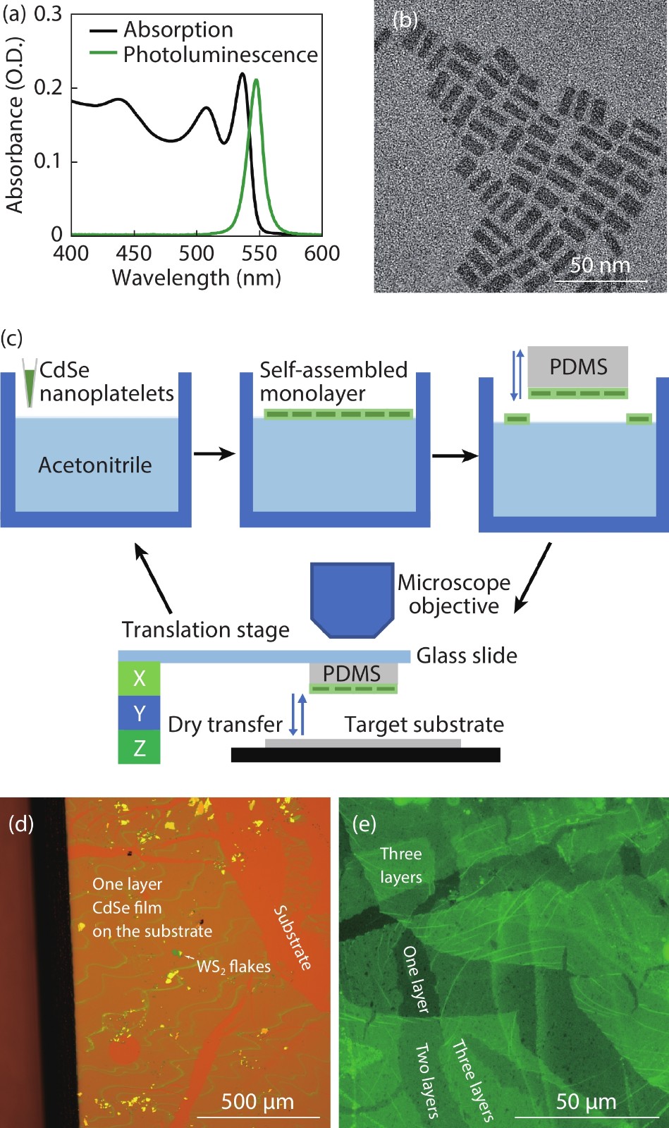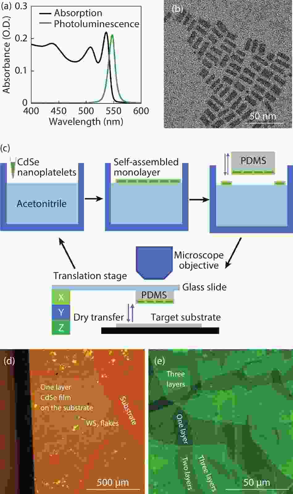 Colloidal CdSe nanoplatelets are thin semiconductor materials with atomic flatness surfaces and one-dimensional strong quantum confinement, and hence they own very narrow and anisotropic emission. Here, we present a polydimethylsiloxane (PDMS) assisted transferring method that can pick up single layer CdSe nanoplatelet films self-assembled on a liquid surface and then precisely transfer to a target. By layer-by-layer picking up and transferring, multiple layers of CdSe films can be built up to form CdSe stacks with each single layer having dominant in-plane transition dipole distribution, which both material and energic structures are analogous to traditional multiple quantum wells grown by molecular-beam epitaxy. Additionally, with the great flexibility of colloidal nanoplatelets and this transferring method, CdSe nanoplatelets films can be combined with other materials to form hybrid heterostructures. We transferred a single-layer CdSe film onto WS2 flakes, and precisely studied the fast energy transfer rate with controlled CdSe nanoplatelet orientation and by using a streak camera with a ps time resolution.