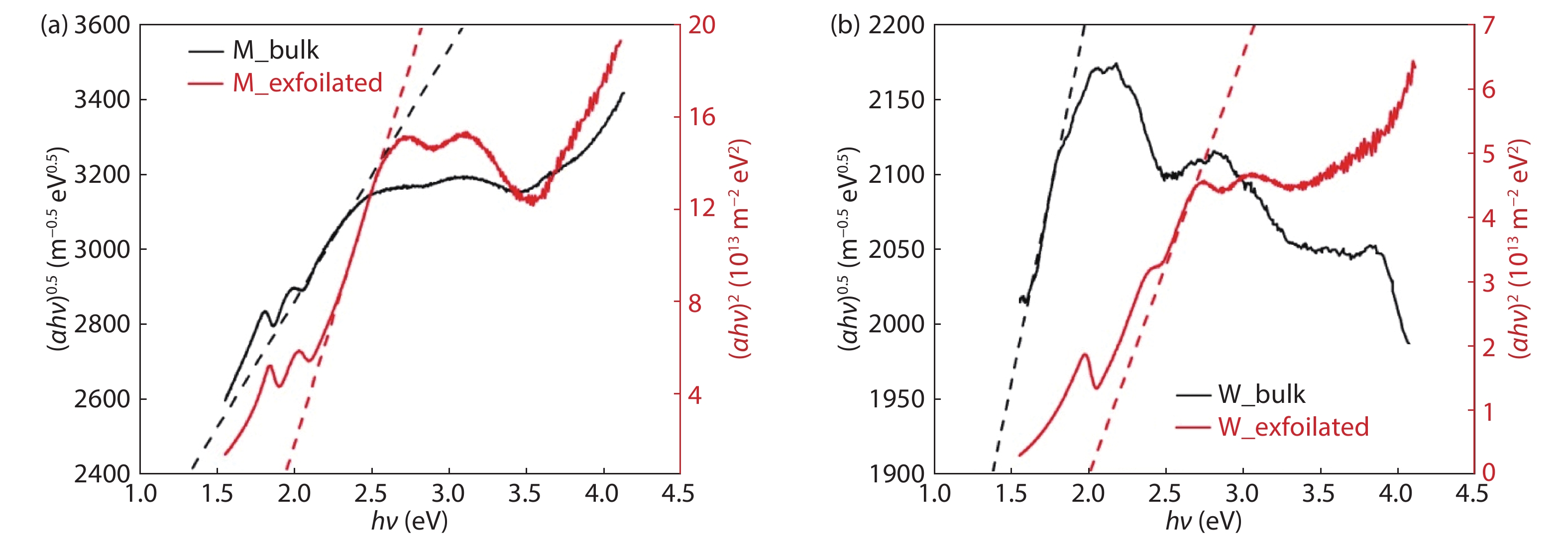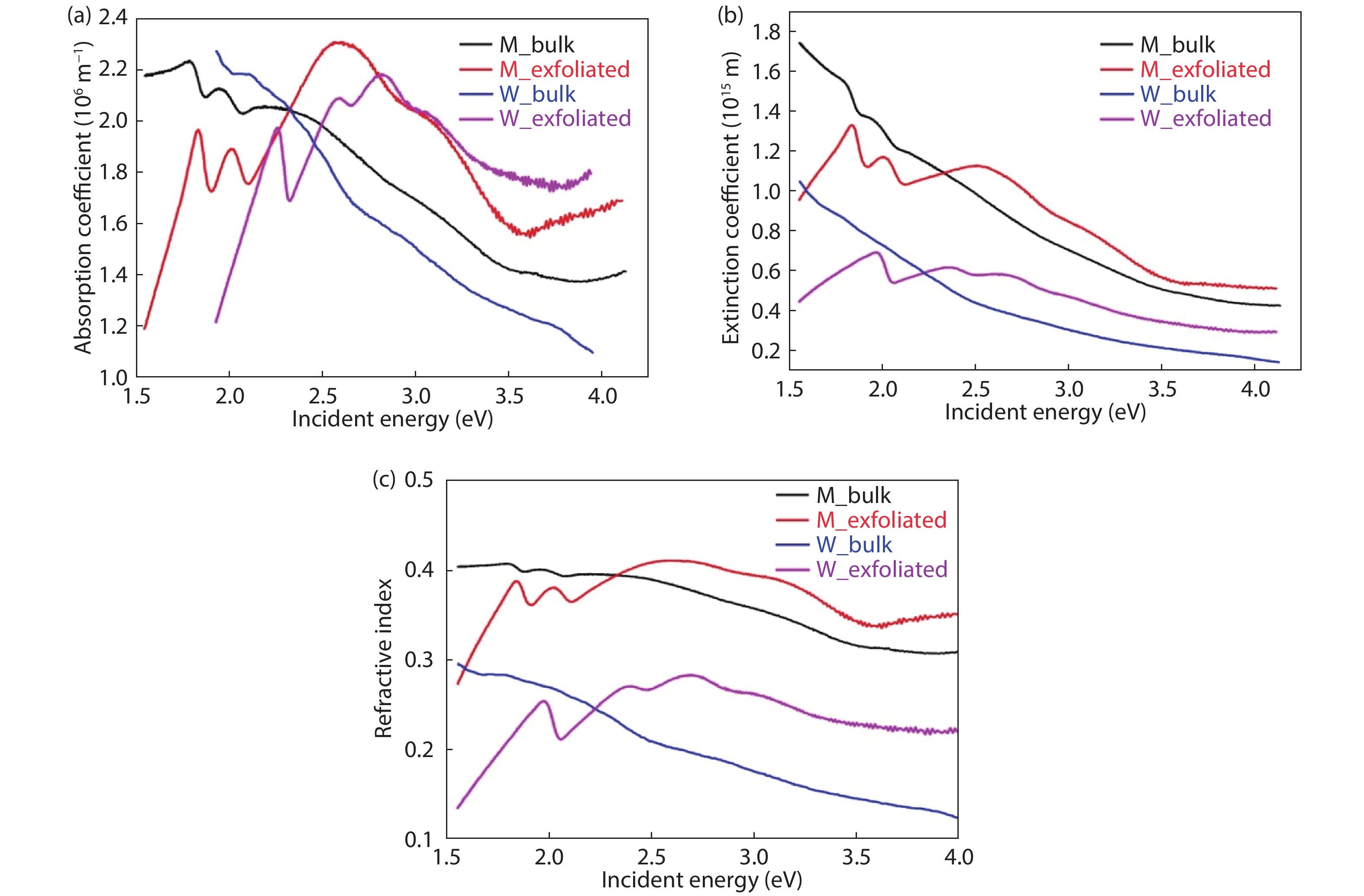 A remarkable refinement in the optical behavior of two-dimensional transition metal dichalcogenides (TMDs) has been brought to light when cleaved from their respective bulks. These atomically thin direct bandgap semiconductors are highly responsive to optical energy which proposes the route for futuristic photonic devices. In this manuscript, we have substantially focused on the optical study of MoS2 and WS2 nanosheets and comparative analysis with their bulk counterparts. The synthesis of nanosheets has been accomplished with liquid exfoliation followed by fabrication of thin films with drop-casting technique. X-ray diffraction and field emission scanning electron microscopy affirmed the morphology, whereas, UV–visible spectroscopy served as the primary tool for optical analysis. It was observed that several parameters, like optical conductivity, optical band-gap energy etc. have enhanced statistics in the case of exfoliated nanosheets as compared to their respective bulks. Some researchers have touched upon this analysis for MoS2, but it is completely novel for WS2. We expect our work to clearly distinguish between the optical behaviors of nanoscale and bulk TMDs so as to intensify and strengthen the research related to 2D-layered materials for optoelectronic and photovoltaic applications.