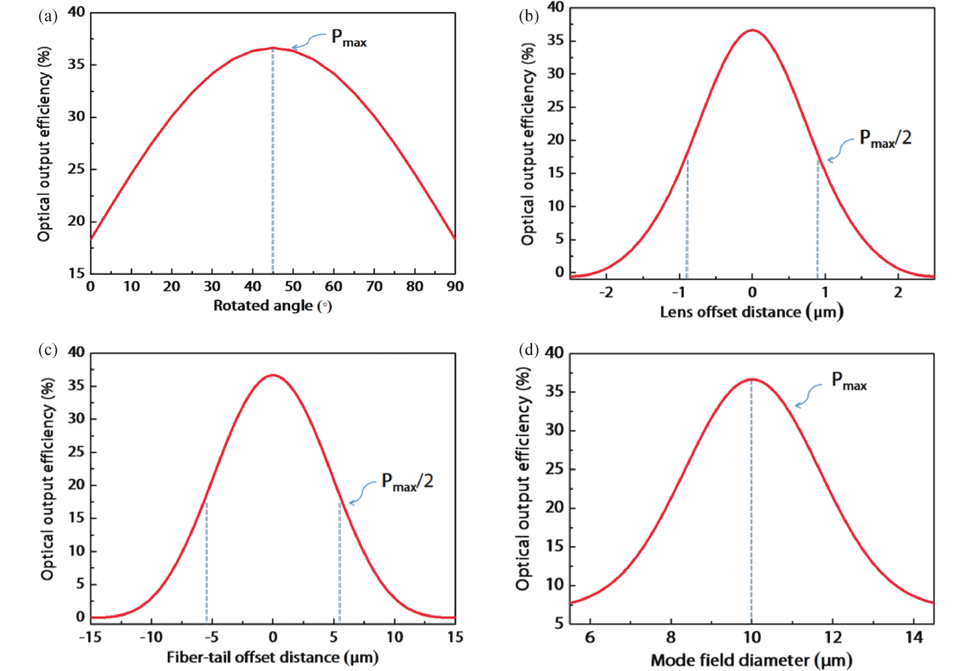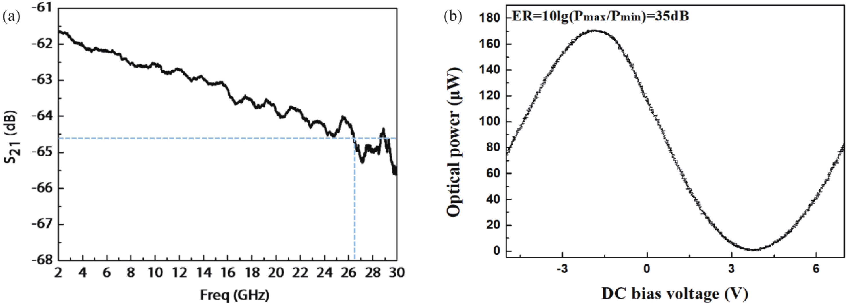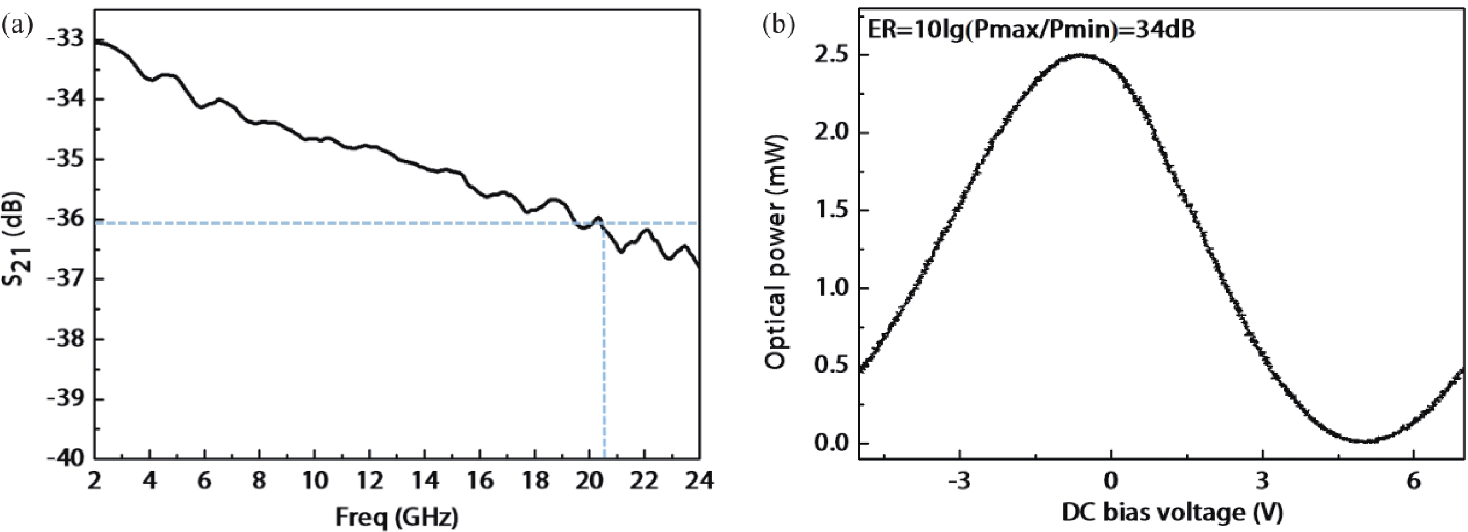 In this work, a hybrid integrated optical transmitter module was designed and fabricated. A proton-exchanged Mach–Zehnder lithium niobate (LiNbO3) modulator chip was chosen to enhance the output extinction ratio. A fiber was used to adjust the rotation of the polarization direction caused by the optical isolator. The whole optical path structure, including the laser chip, lens, fiber, and modulator chip, was simulated to achieve high optical output efficiency. After a series of process improvements, a module with an output extinction ratio of 34 dB and a bandwidth of 20.5 GHz (from 2 GHz) was obtained. The optical output efficiency of the whole module reached approximately 21%. The link performance of the module was also measured.