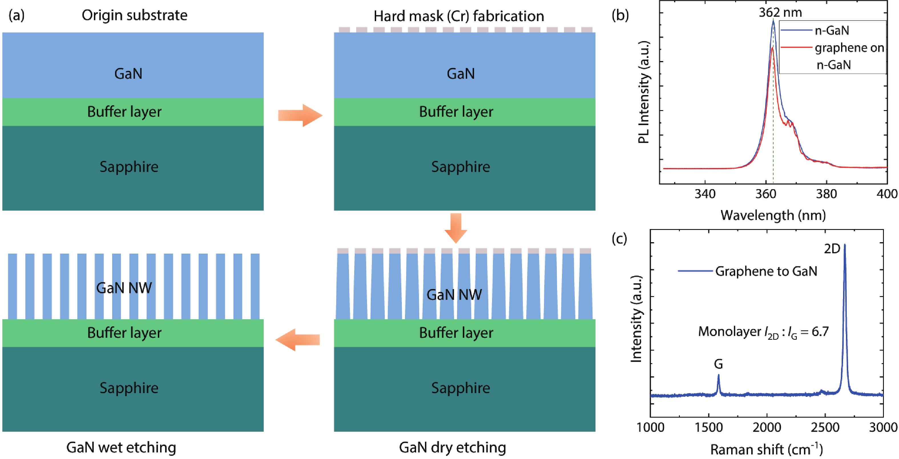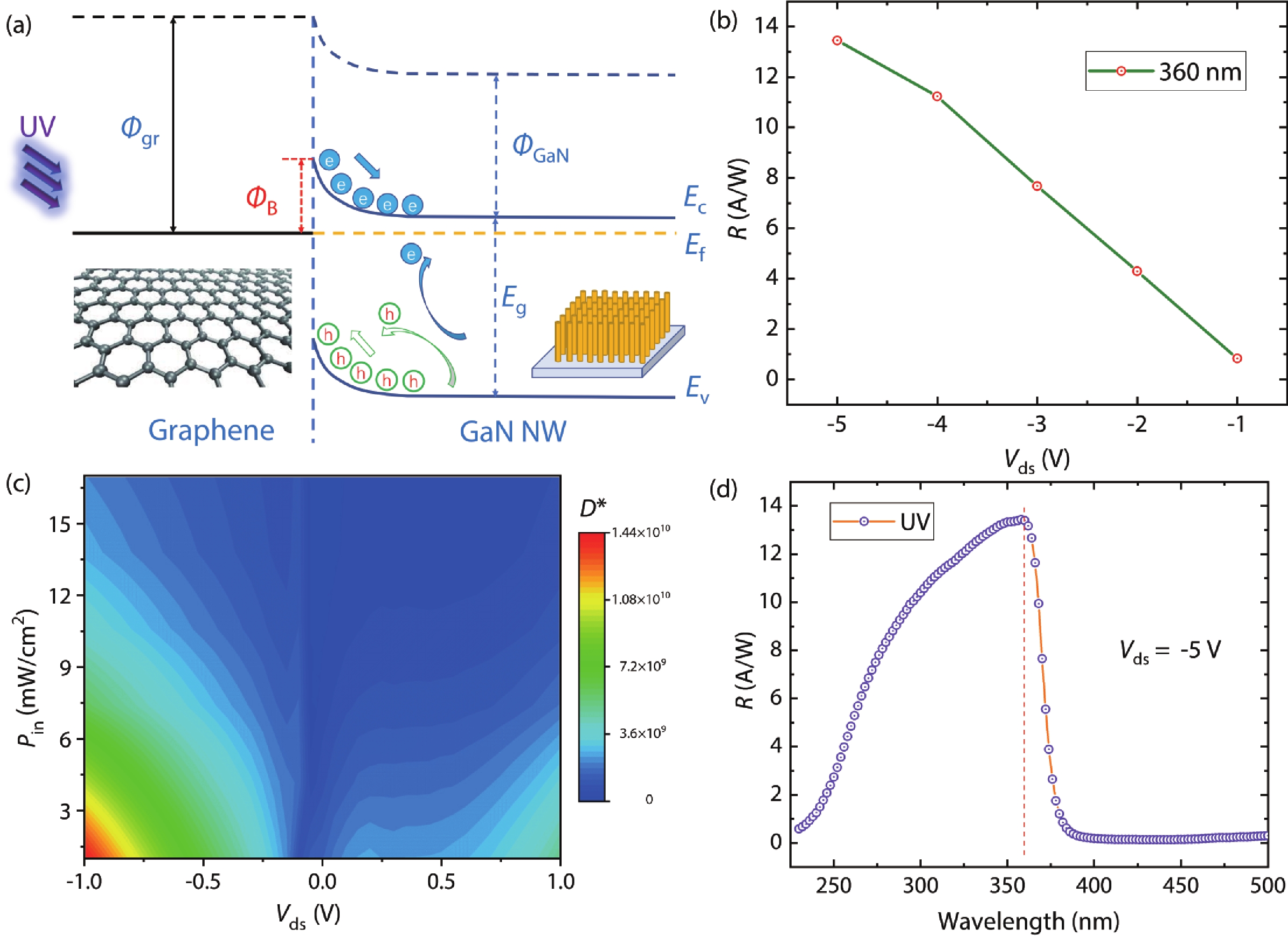 GaN has been widely used in the fabrication of ultraviolet photodetectors because of its outstanding properties. In this paper, we report a graphene–GaN nanorod heterostructure photodetector with fast photoresponse in the UV range. GaN nanorods were fabricated by a combination mode of dry etching and wet etching. Furthermore, a graphene–GaN nanorod heterostructure ultraviolet detector was fabricated and its photoelectric properties were measured. The device exhibits a fast photoresponse in the UV range. The rising time and falling time of the transient response were 13 and 8 ms, respectively. A high photovoltaic responsivity up to 13.9 A/W and external quantum efficiency up to 479% were realized at the UV range. The specific detectivity D* = 1.44 × 1010 Jones was obtained at –1 V bias in ambient conditions. The spectral response was measured and the highest response was observed at the 360 nm band.