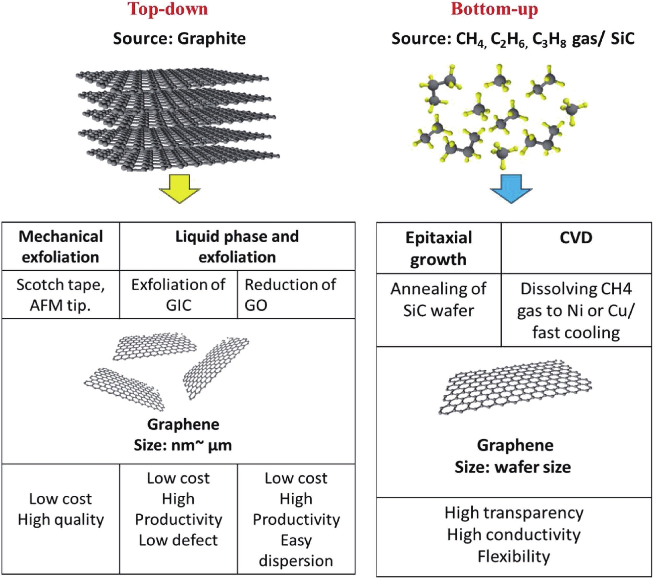 This study presents an overview on graphene synthesis, fabrication and different characterization techniques utilized in the production. Since its discovery in 2004 by Andre Geim and Kostya Novoselov several research articles have been published globally to this effect, owing to graphene’s extraordinary, and exclusive characteristics which include optical transparency, excellent thermal, and mechanical properties. The properties and applications of this two-dimensional carbon crystal composed of single-layered material have created new avenues for the development of high-performance future electronics and technologies in energy storage and conversion for the sustainable energy. However, despite its potential and current status globally the difficulty in the production of monolayer graphene sheet still persists. Therefore, this review highlighted two approaches in the synthesis of graphene, which are the top-down and bottom-up approaches and examined the advantages and failings of the methods involved. In addition, the prospects and failings of these methods are investigated, as they are essential in optimizing the production method of graphene vital for expanding the yield, and producing high-quality graphene.