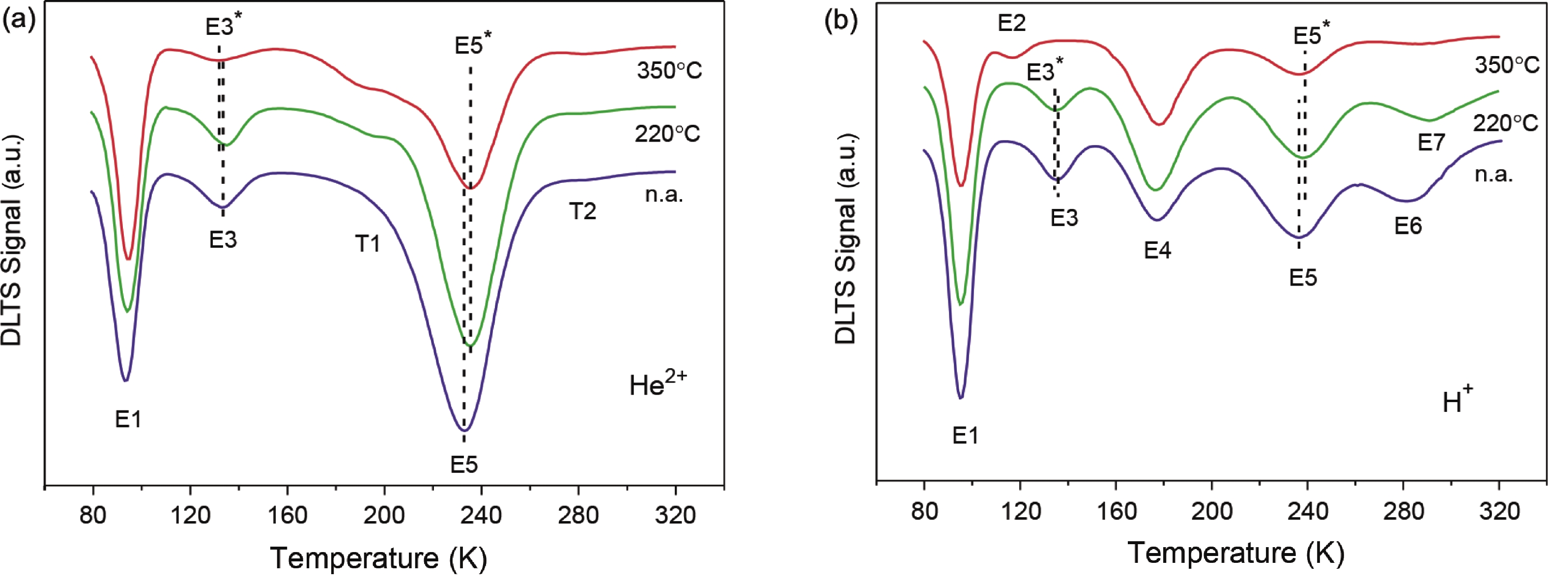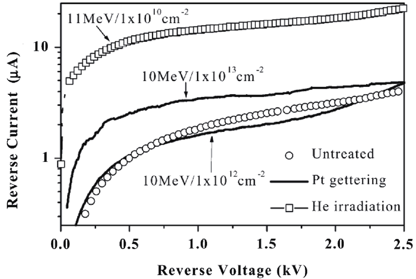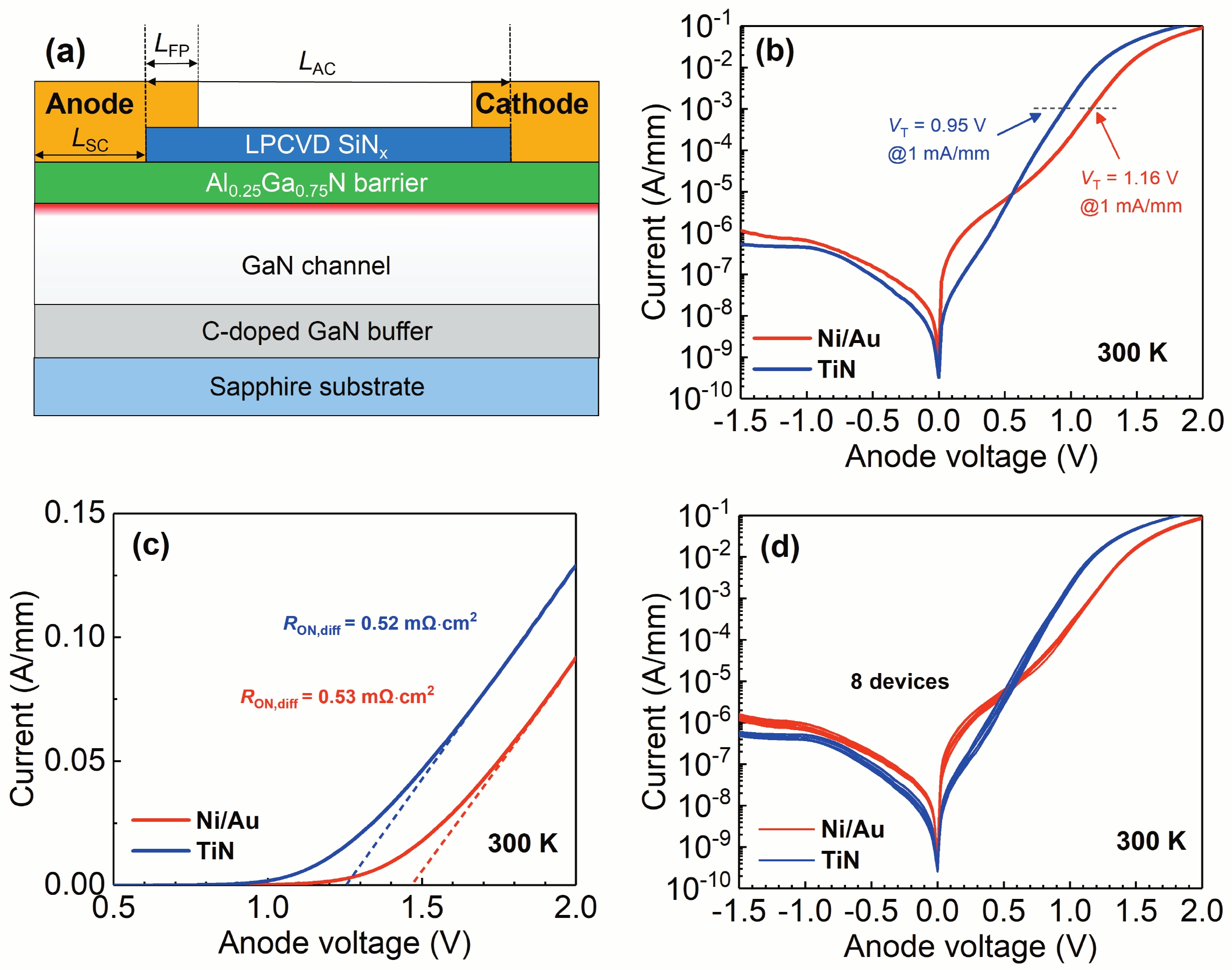 In this work, the optimization of reverse leakage current (IR) and turn-on voltage (VT) in recess-free AlGaN/GaN Schottky barrier diodes (SBDs) was achieved by substituting the Ni/Au anode with TiN anode. To explain this phenomenon, the current transport mechanism was investigated by temperature-dependent current–voltage (I–V) characteristics. For forward bias, the current is dominated by the thermionic emission (TE) mechanisms for both devices. Besides, the presence of inhomogeneity of the Schottky barrier height (qφb) is proved by the linear relationship between qφb and ideality factor. For reverse bias, the current is dominated by two different mechanisms at high temperature and low temperature, respectively. At high temperatures, the Poole–Frenkel emission (PFE) induced by nitrogen-vacancy (VN) is responsible for the high IR in Ni/Au anode. For TiN anode, the IR is dominated by the PFE from threading dislocation (TD), which can be attributed to the decrease of VN due to the suppression of N diffusion at the interface of Schottky contact. At low temperatures, the IR of both diodes is dominated by Fowler–Nordheim (FN) tunneling. However, the VN donor enhances the electric field in the barrier layer, thus causing a higher IR in Ni/Au anode than TiN anode, as confirmed by the modified FN model.