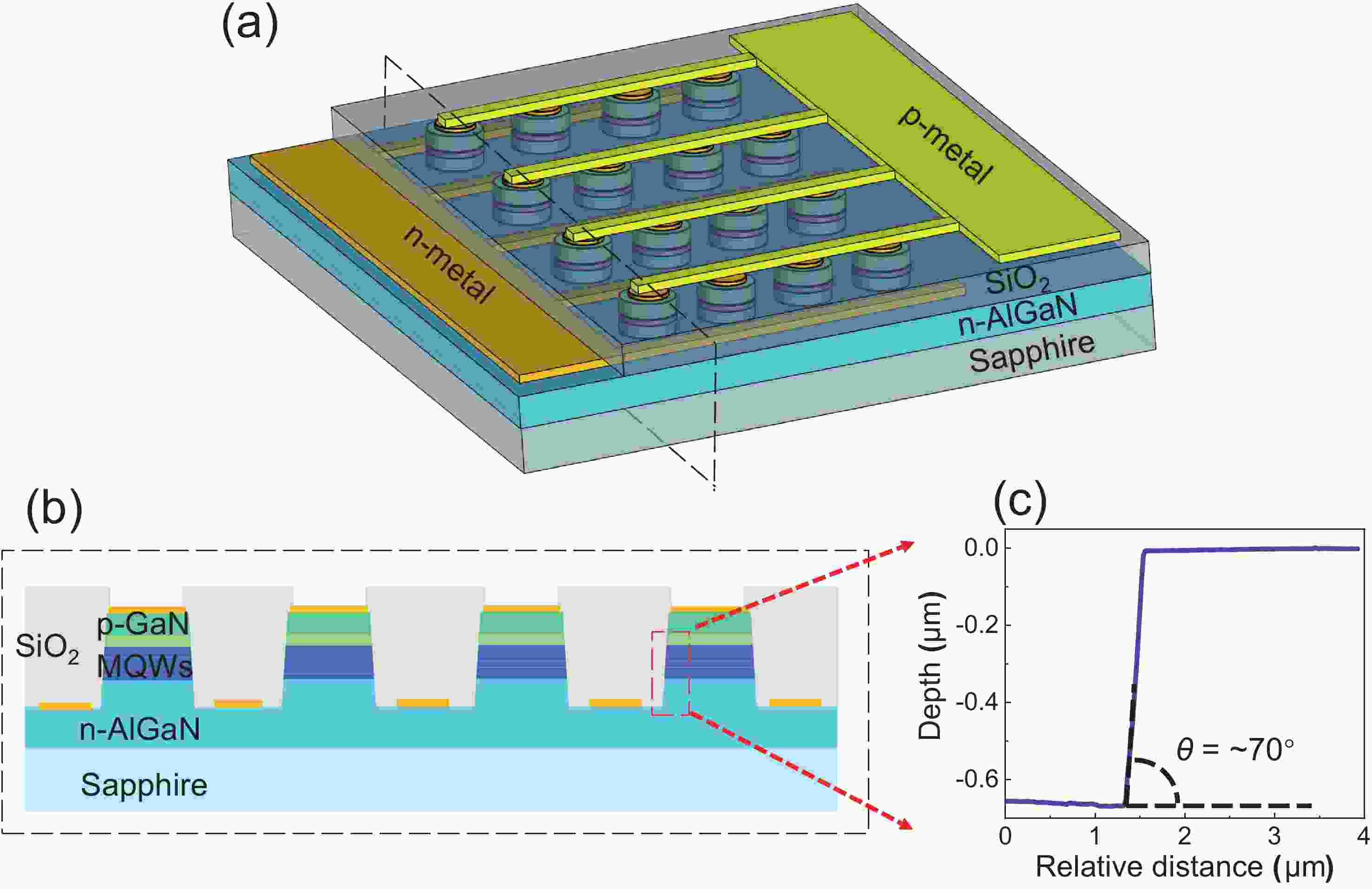 In this work, we design and fabricate a deep ultraviolet (DUV) light-emitting array consisting of 10 × 10 micro-LEDs (μ-LEDs) with each device having 20 μm in diameter. Strikingly, the array demonstrates a significant enhancement of total light output power by nearly 52% at the injection current of 100 mA, in comparison to a conventional large LED chip whose emitting area is the same as the array. A much higher (~22%) peak external quantum efficiency, as well as a smaller efficiency droop for μ-LED array, was also achieved. The numerical calculation reveals that the performance boost can be attributed to the higher light extraction efficiency at the edge of each μ-LED. Additionally, the far-field pattern measurement shows that the μ-LED array possesses a better forward directionality of emission. These findings shed light on the enhancement of the DUV LEDs performance and provide new insights in controlling the light behavior of the μ-LEDs.