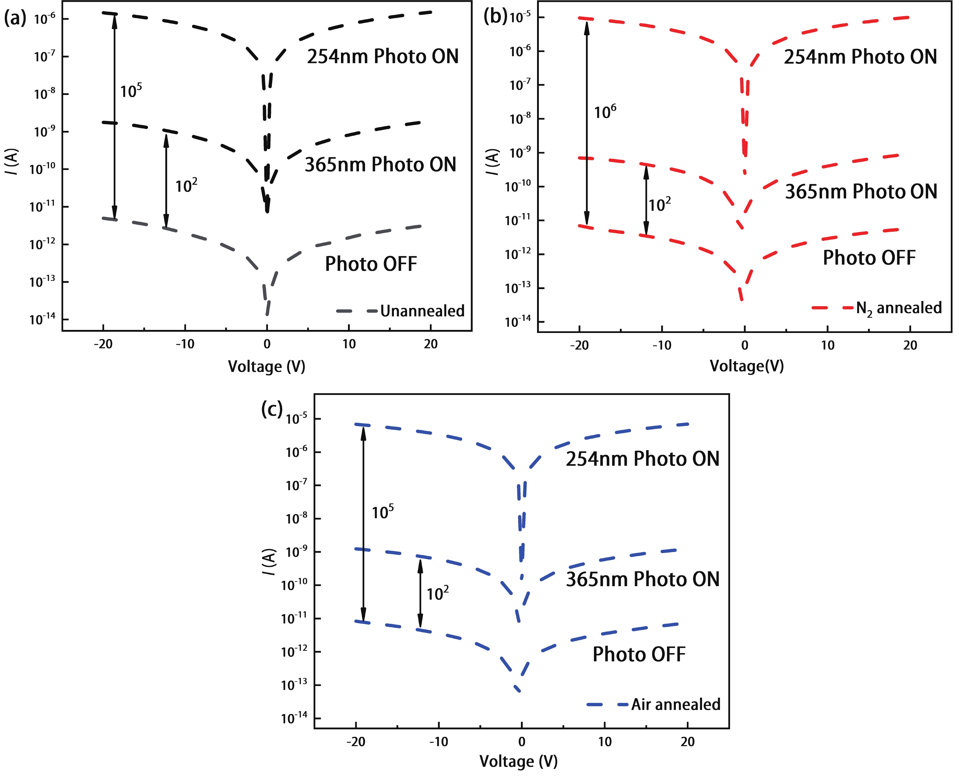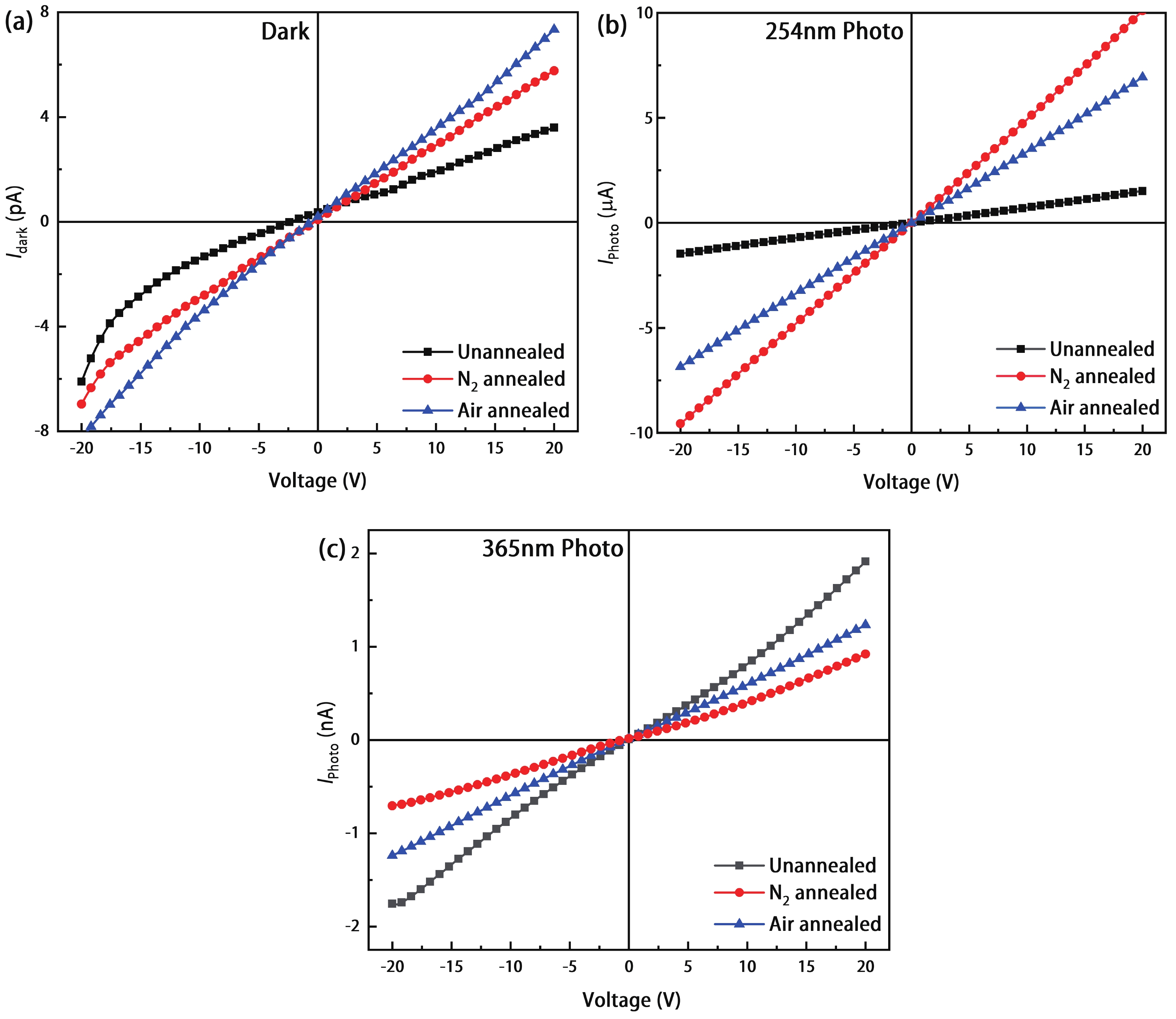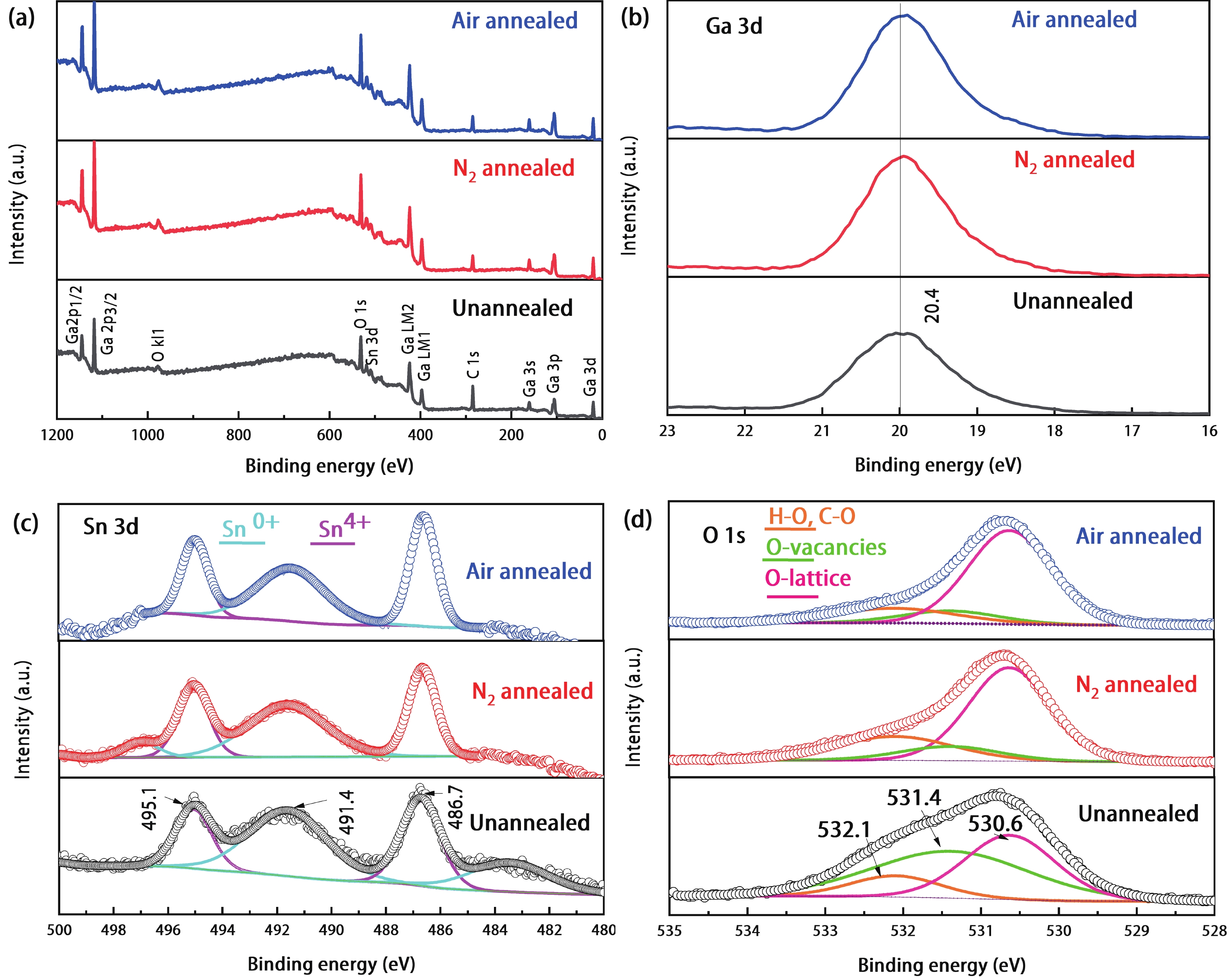 Sn doping is an effective way to improve the response rate of Ga2O3 film based solar-blind detectors. In this paper, Sn-doped Ga2O3 films were prepared on a sapphire substrate by radio frequency magnetron sputtering. The films were characterized by X-ray diffraction, scanning electron microscopy, X-ray photoelectron spectroscopy and ultraviolet visible spectroscopy, and the effect of annealing atmosphere on the properties of films was studied. The Ga2O3 films changed from amorphous to β-Ga2O3 after annealing at 900 °C. The films were composed of micro crystalline particles with a diameter of about 5–20 nm. The β-Ga2O3 had high transmittance for wavelengths above 300 nm, and obvious absorption for solar-blind signals at 200–280 nm. The metal semiconductor metal type solar-blind detectors were prepared. The detector based on Sn-doped β-Ga2O3 thin film annealed in N2 has the best response performance to 254 nm light. The photo-current is 10 μA at 20 V, the dark-current is 5.76 pA, the photo dark current ratio is 1.7 × 106, the response rate is 12.47 A/W, the external quantum efficiency is 6.09 × 103%, the specific detection rate is 2.61 × 1012 Jones, the response time and recovery time are 378 and 90 ms, respectively.