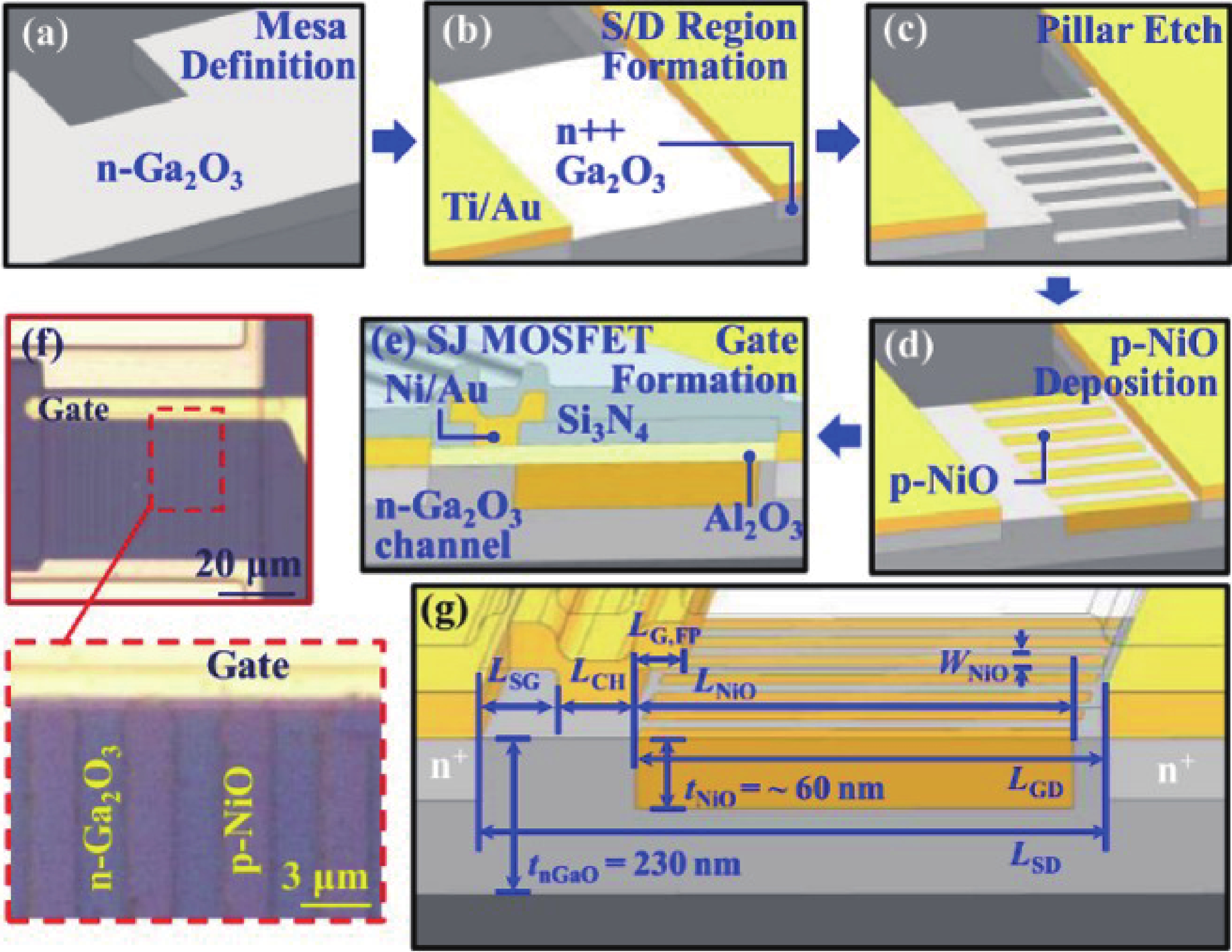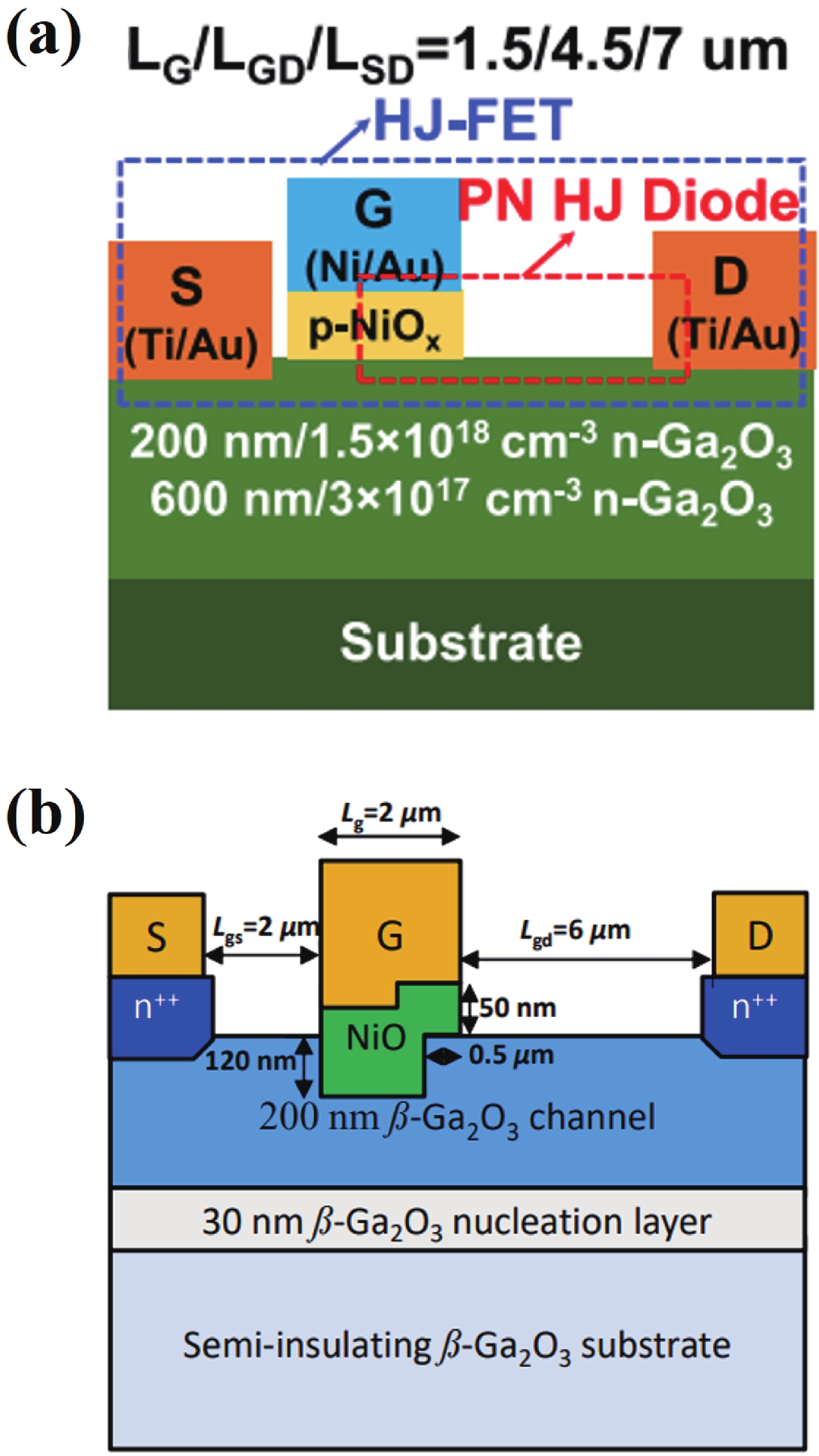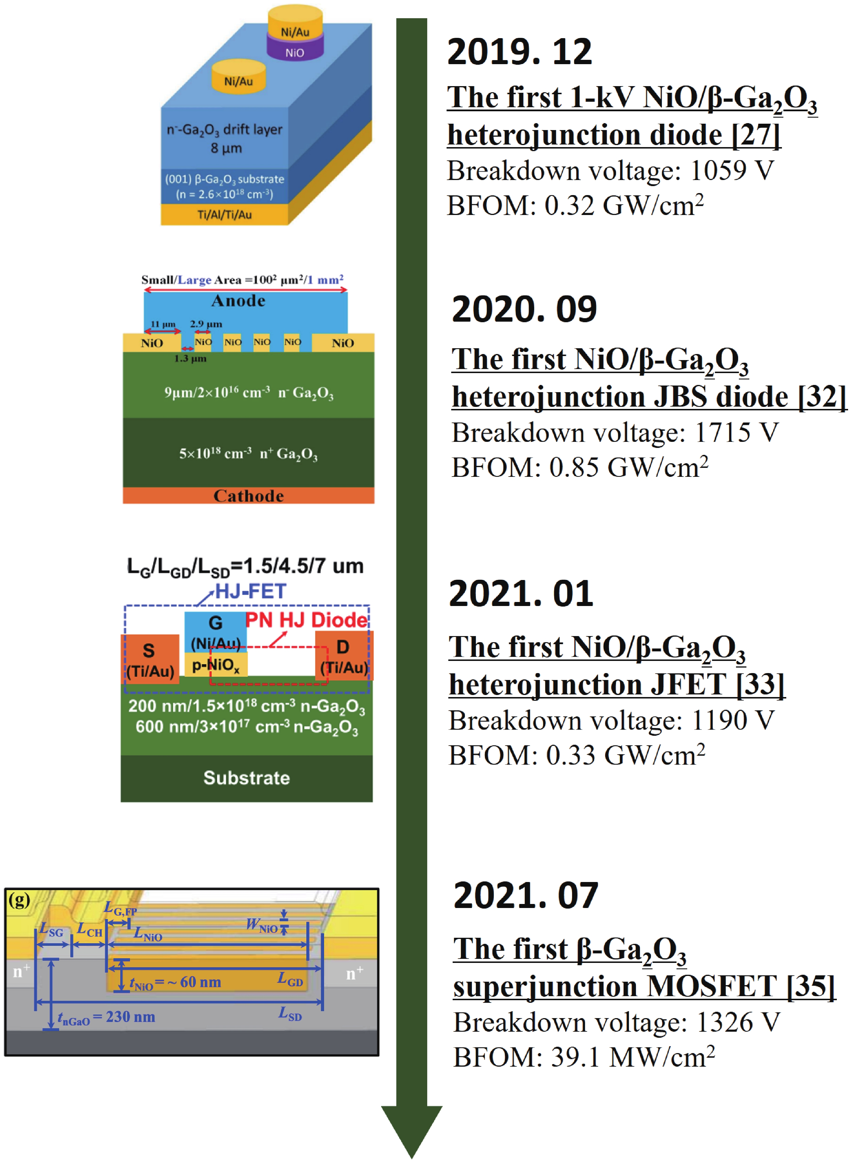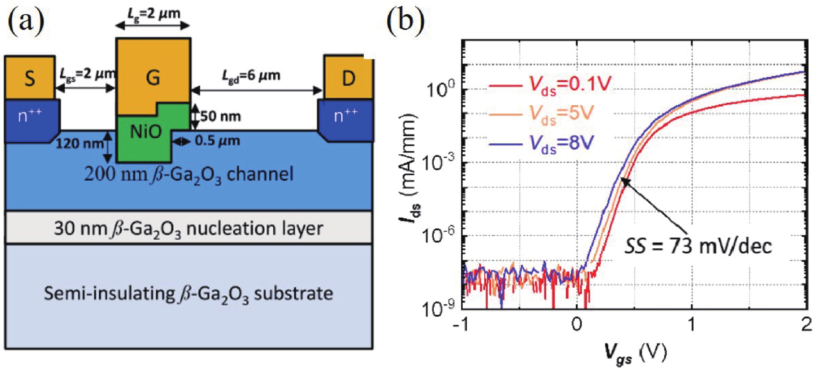 Beta gallium oxide (β-Ga2O3) has attracted significant attention for applications in power electronics due to its ultra-wide bandgap of ~ 4.8 eV and the large critical electric field of 8 MV/cm. These properties yield a high Baliga’s figures of merit (BFOM) of more than 3000. Though β-Ga2O3 possesses superior material properties, the lack of p-type doping is the main obstacle that hinders the development of β-Ga2O3-based power devices for commercial use. Constructing heterojunctions by employing other p-type materials has been proven to be a feasible solution to this issue. Nickel oxide (NiO) is the most promising candidate due to its wide band gap of 3.6–4.0 eV. So far, remarkable progress has been made in NiO/β-Ga2O3 heterojunction power devices. This review aims to summarize recent advances in the construction, characterization, and device performance of the NiO/β-Ga2O3 heterojunction power devices. The crystallinity, band structure, and carrier transport property of the sputtered NiO/β-Ga2O3 heterojunctions are discussed. Various device architectures, including the NiO/β-Ga2O3 heterojunction pn diodes (HJDs), junction barrier Schottky (JBS) diodes, and junction field effect transistors (JFET), as well as the edge terminations and super-junctions based on the NiO/β-Ga2O3 heterojunction, are described.